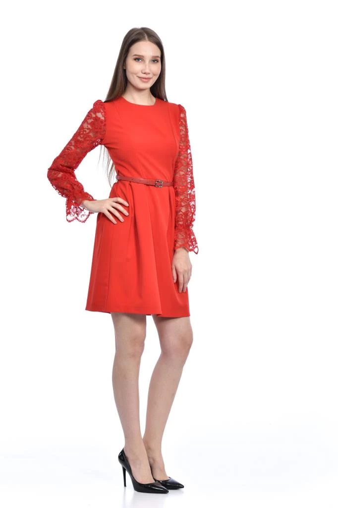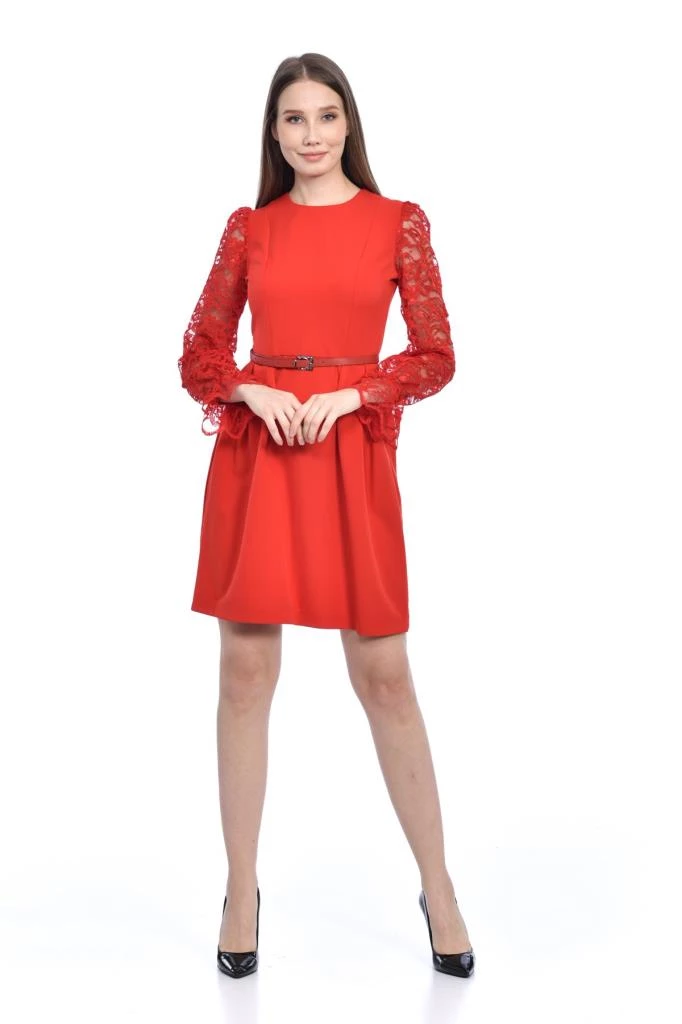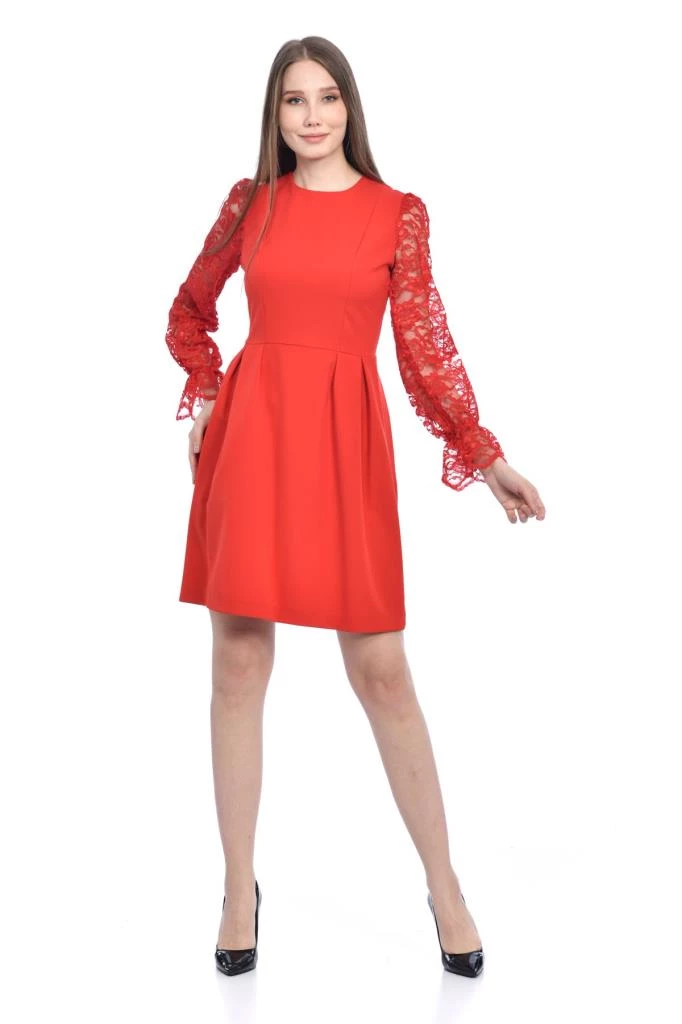 Kolları Dantelli Bisiklet Yaka Pileli Kırmızı Abiye Kadın Elbise Kırmızı 36