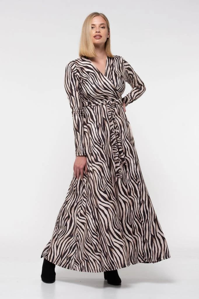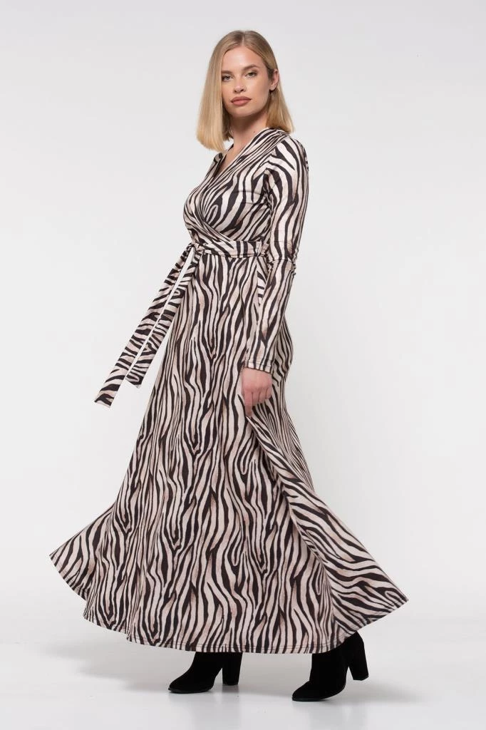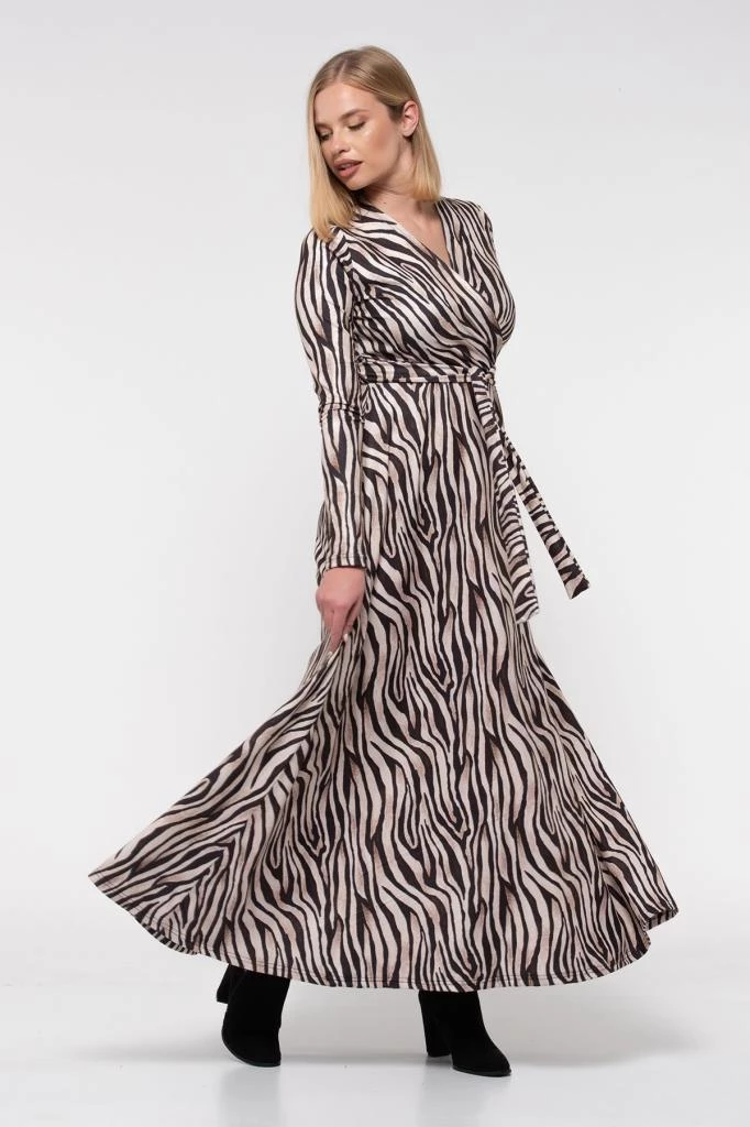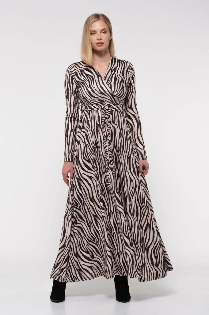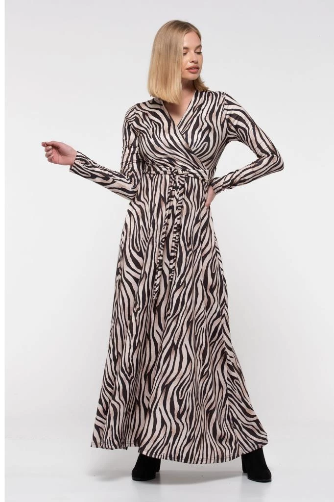 Needion - V Yaka Dekolte Zebra Desenli Kemerli Kadife Elbise Zebra Desenli S