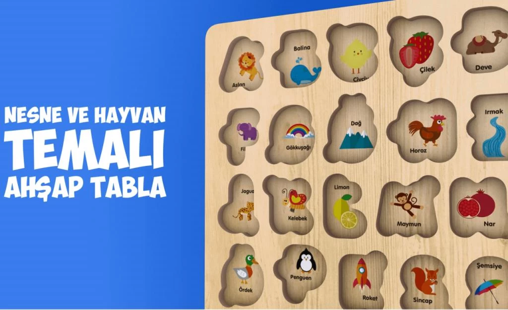 1 adet ahşap yapboz zemin tabla ve 29 adet ahşap Türkçe harf figür parçasından oluşmaktadır.