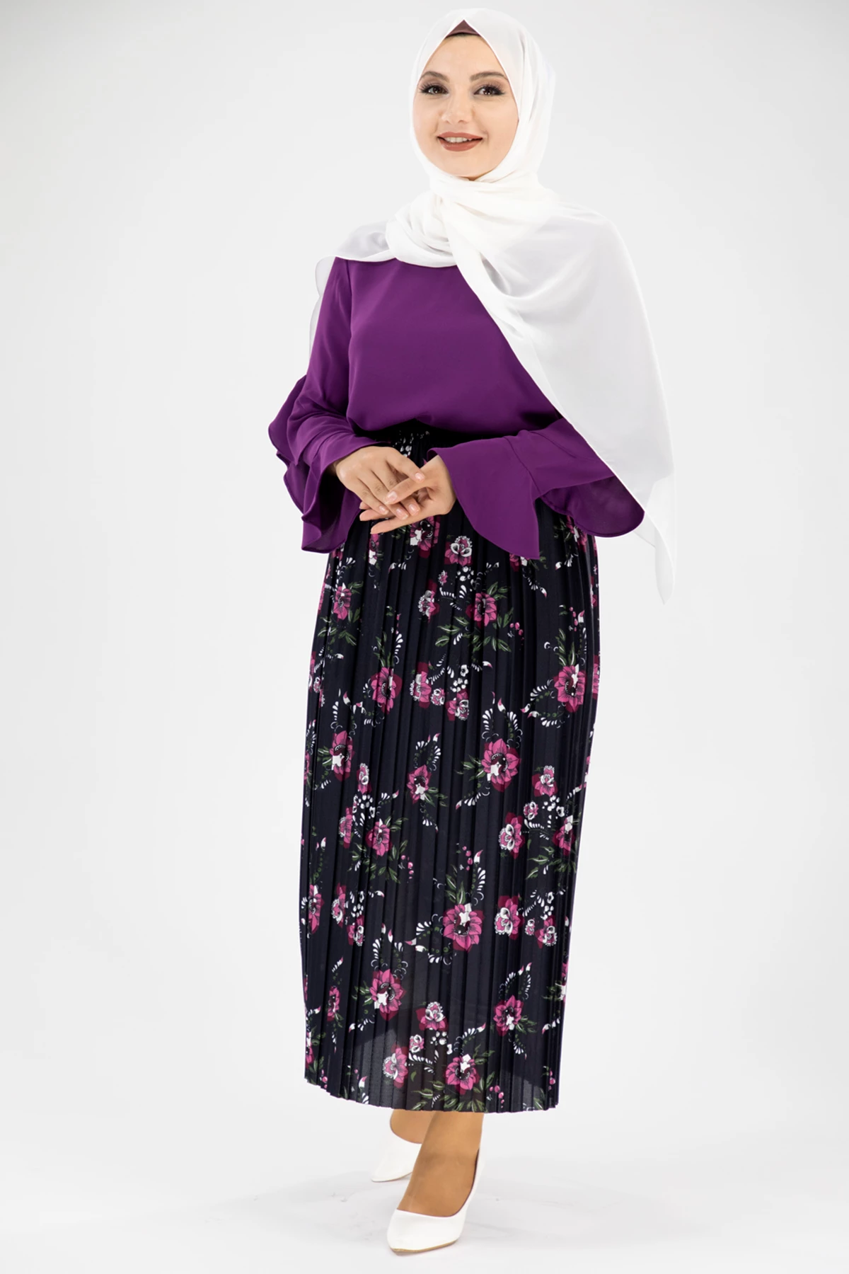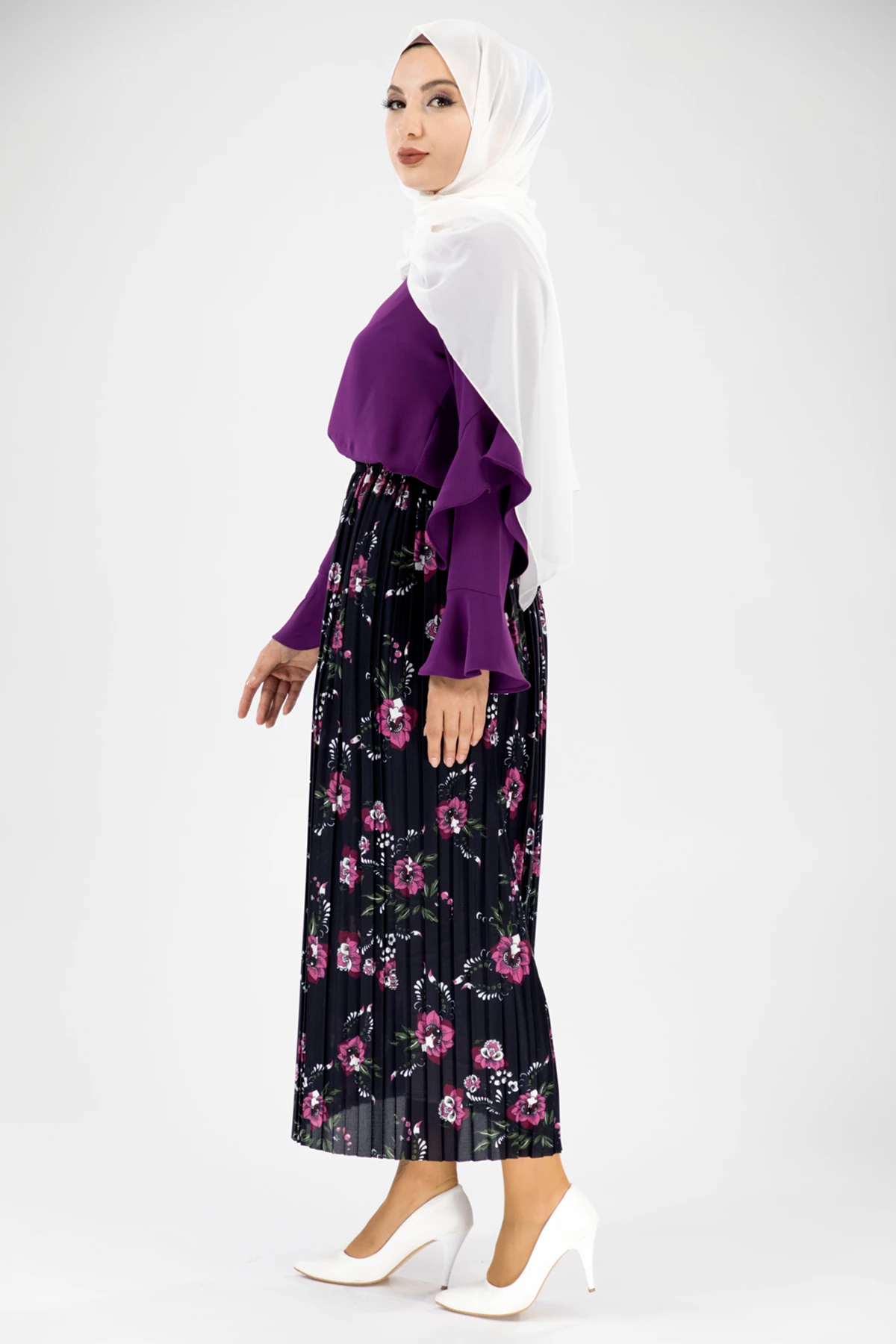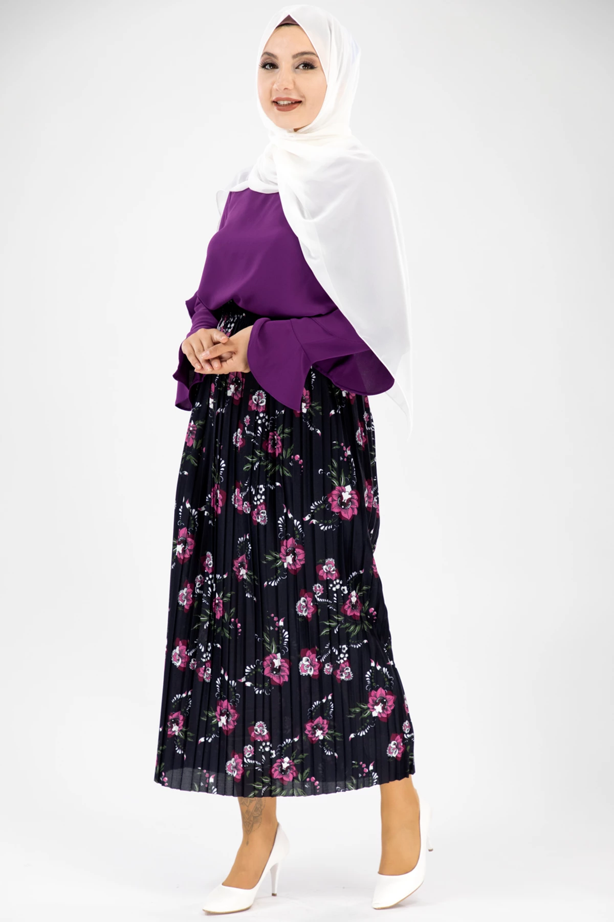 Renkli Çiçekli Tesettür Etek Mor Mor STD
