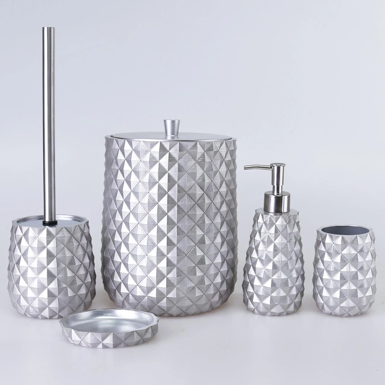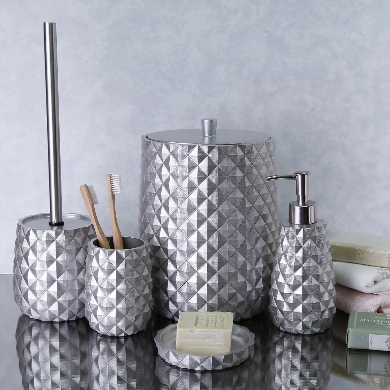 En kaliteli reçineden tasarlanmış çöp kovası, tuvalet fırçası, sıvı sabunluk, katı sabunluk ve diş fırçalıktan oluşan Piramit banyo setine ilk siz sahip olun.