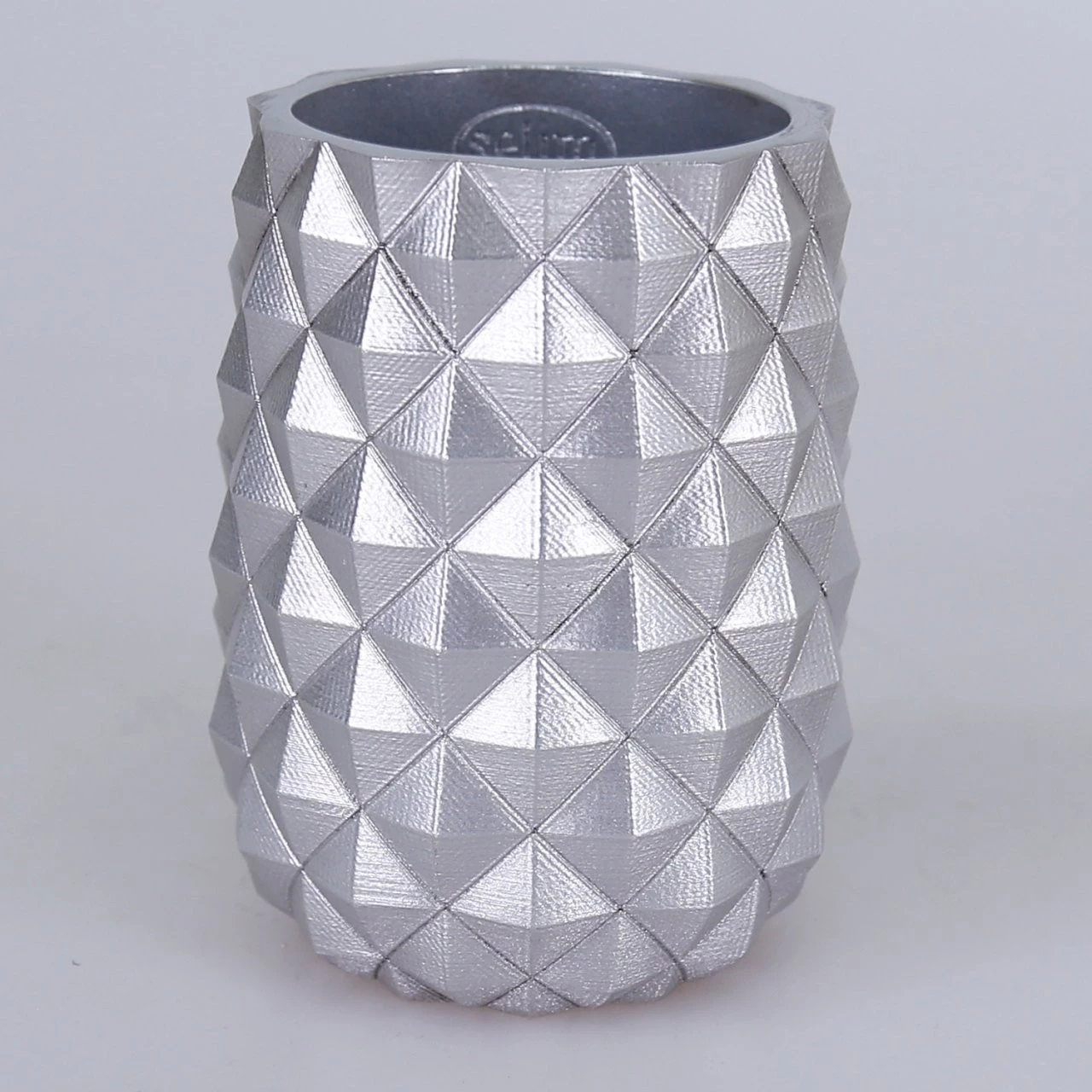 Üçgen kabarık dokusu olan, Modern tarzda tasarlanmış silindir şekilli formdaki bu banyo setine gümüş rengi çağdaş ve ferah bir görünüm verir.