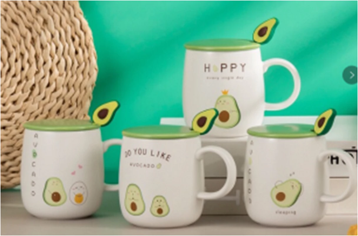 Needion - Avokado Tasarımlı Seramik Kapaklı Metal Kaşıklı Kupa Bardak