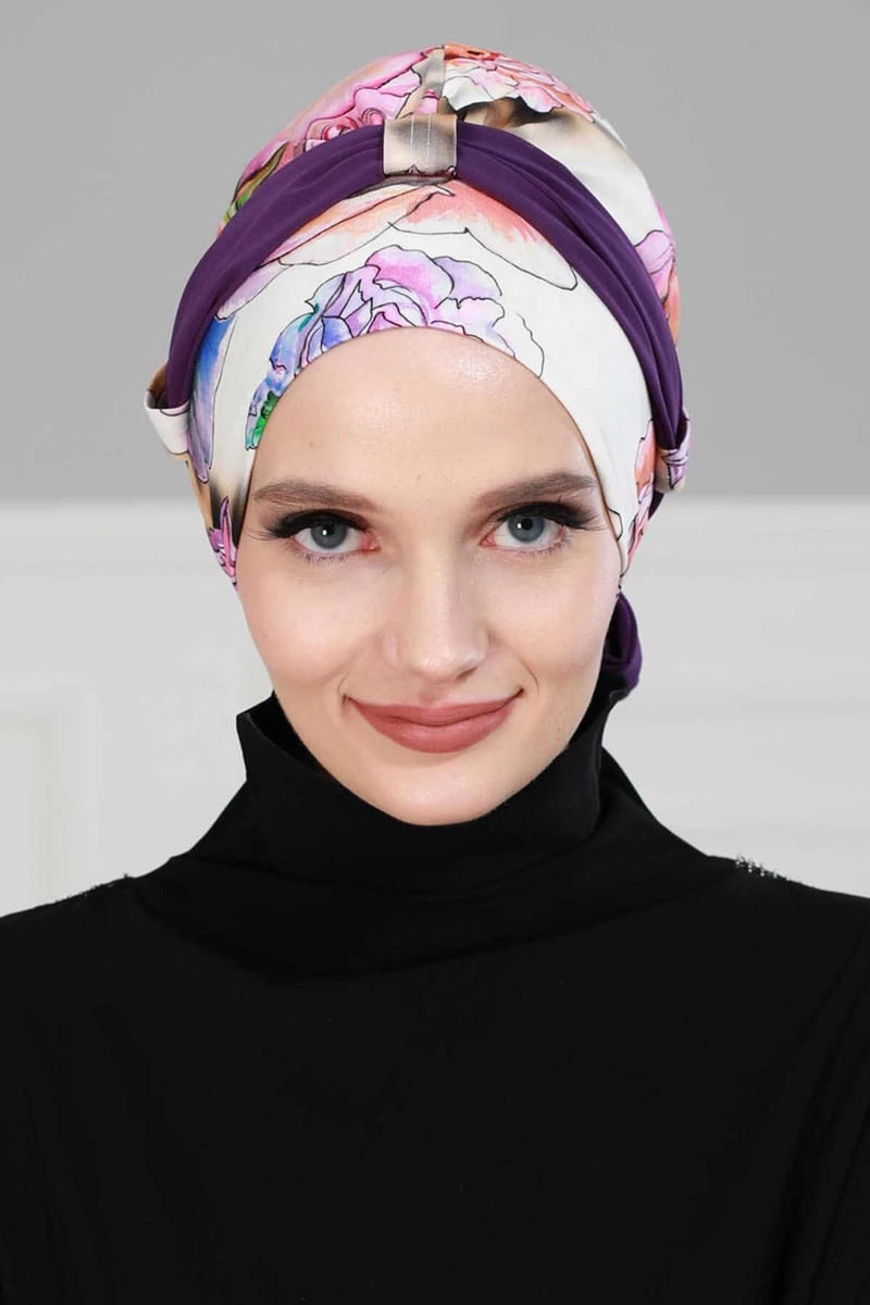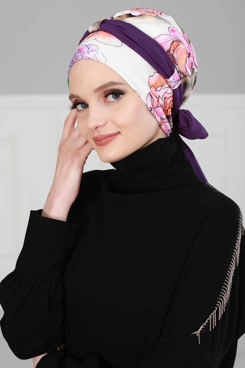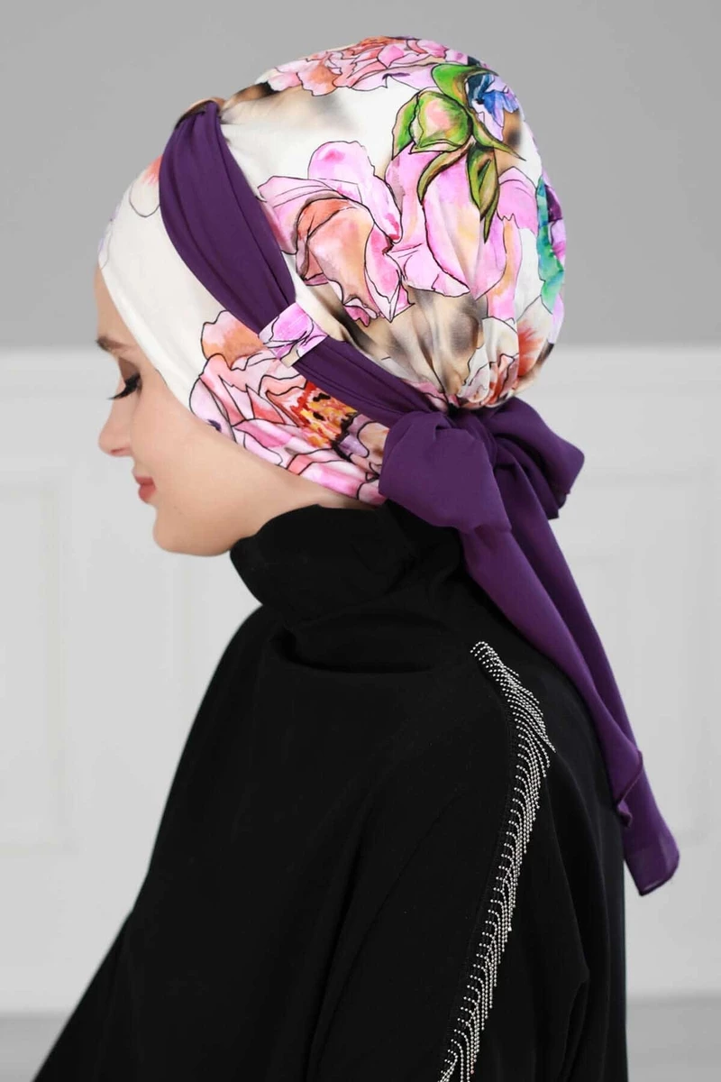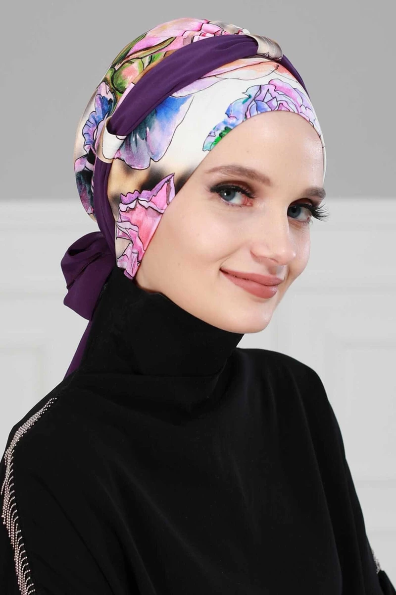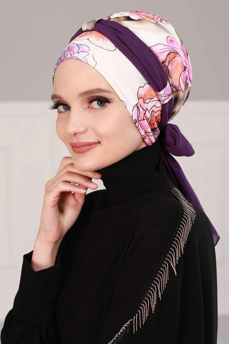 Needion - Şifon Kuşaklı Penye Bone Doğa  Desen