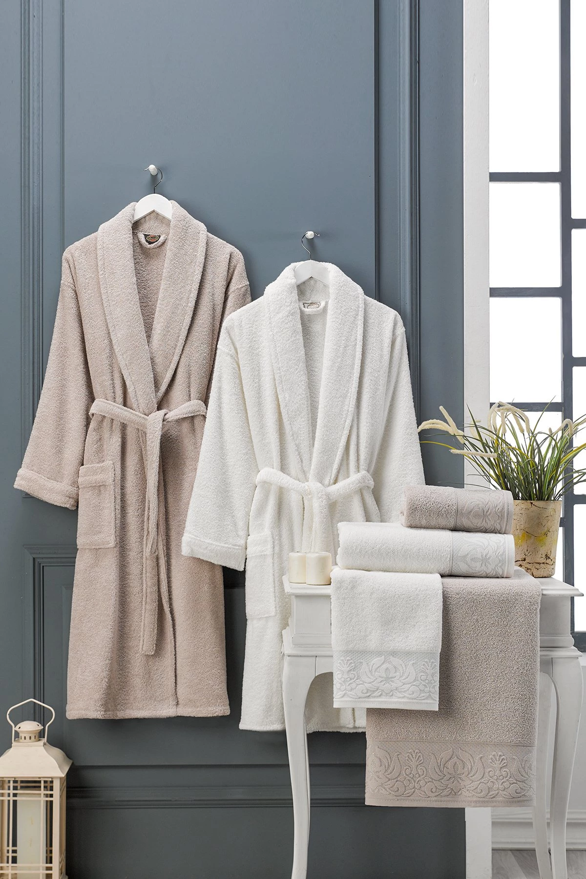 Needion - 6 Parça Çift Kişilik  Pamuk Jakarlı Kutulu Çeyizlik Aile Bornoz Seti M-L pudra-mavi