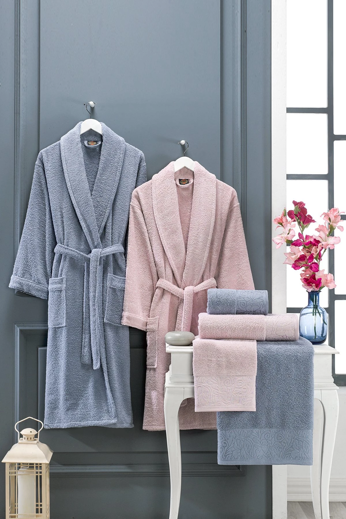 6 Parça Çift Kişilik Pamuk Jakarlı Kutulu Çeyizlik Aile Bornoz Seti M-L pudra-mavi