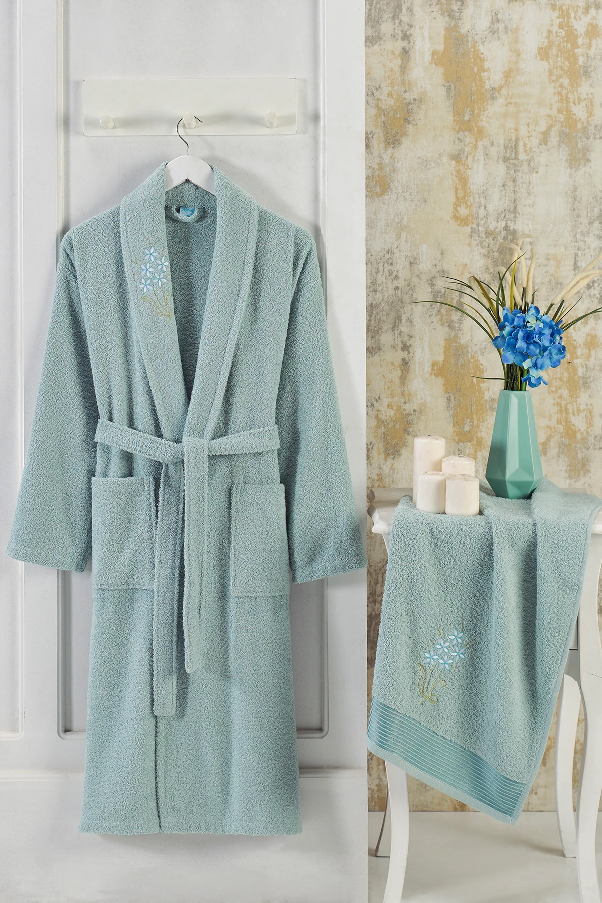 Needion - Nakışlı Havlu ve Bornoz Seti - Mint L/XL Mint