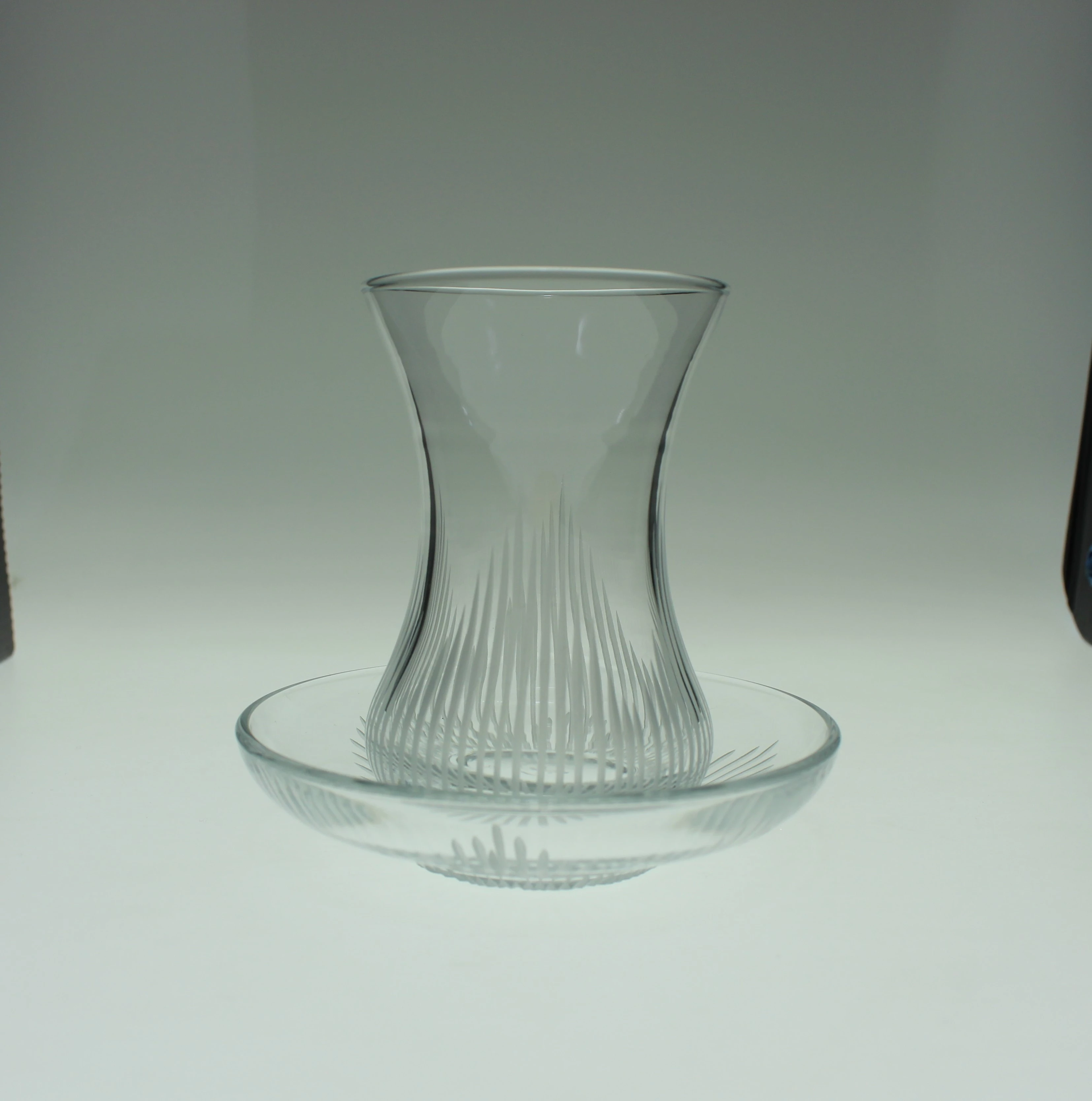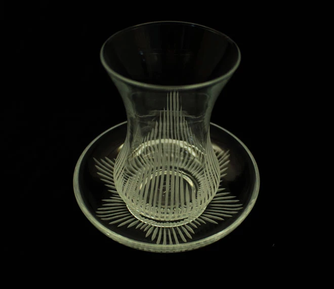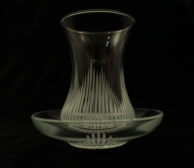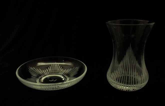 Usta ellerde özenli dekor taşları ile kesim yapılmış kristal işçiliği ile cam bardağa ve tabağa işlenmiştir.