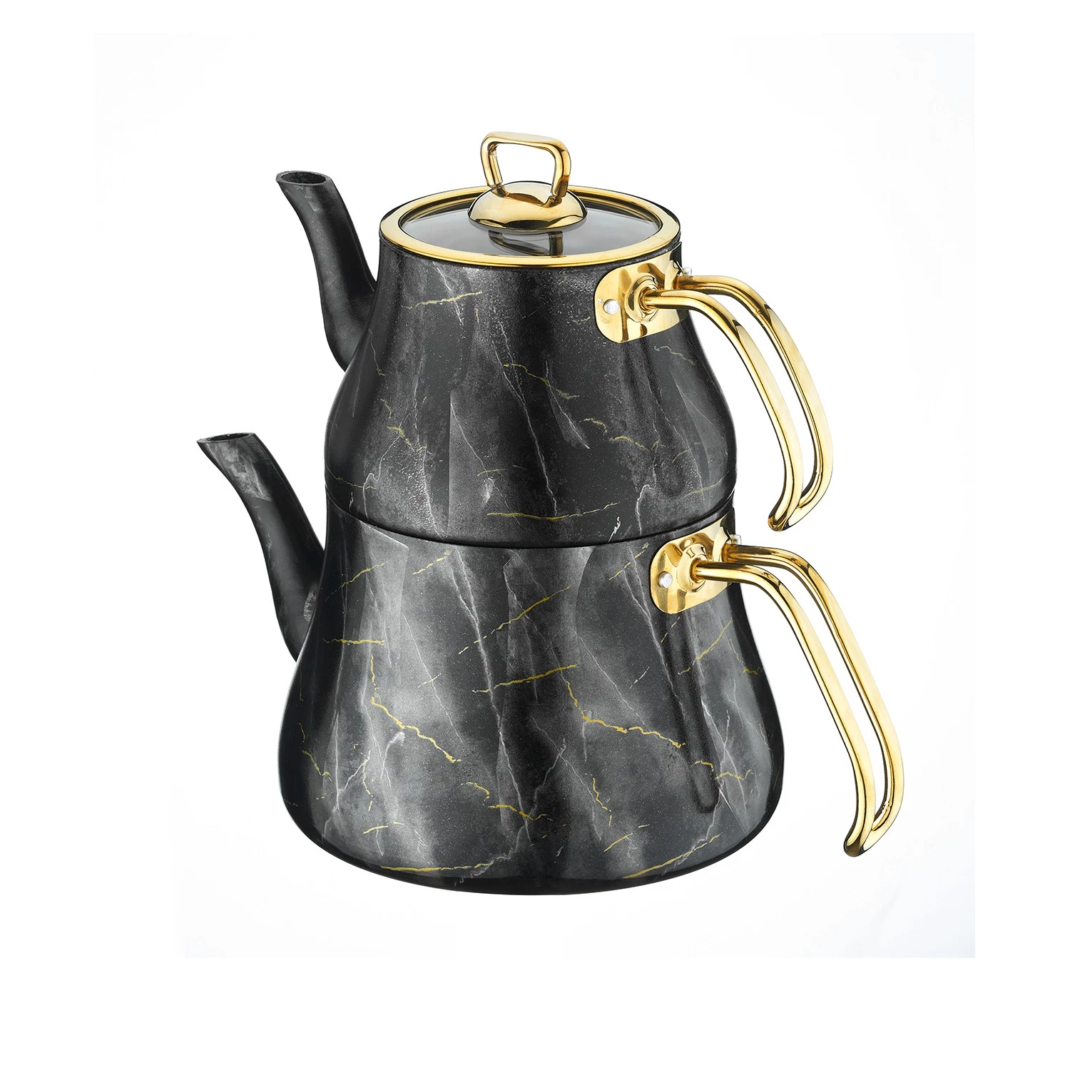 Brioni Marble Çaydanlık Siyah Mermer Desenli Cam Kapaklı 4 Parça Renkli