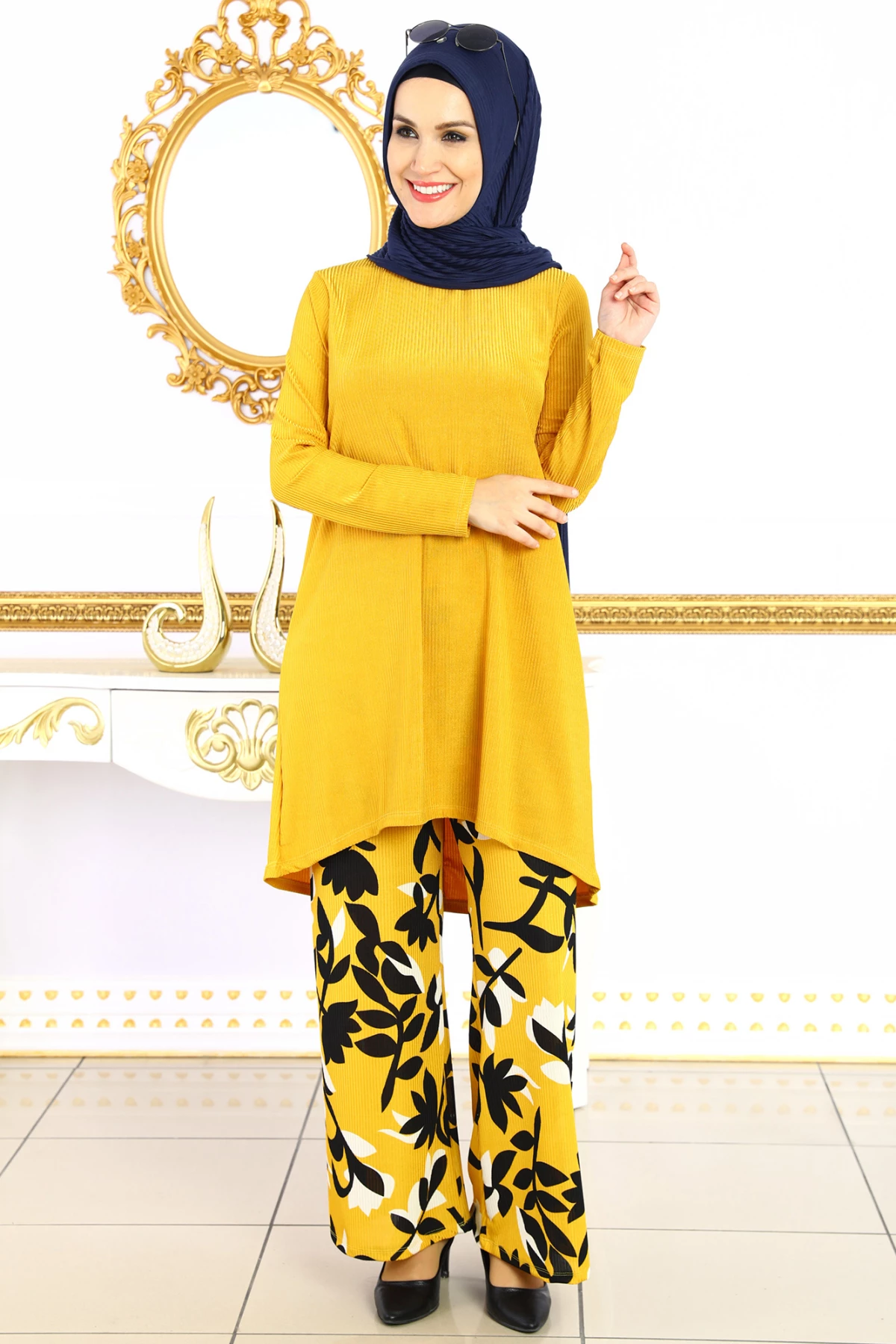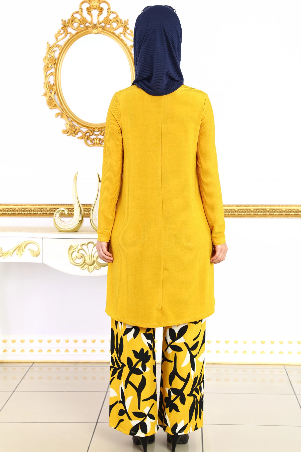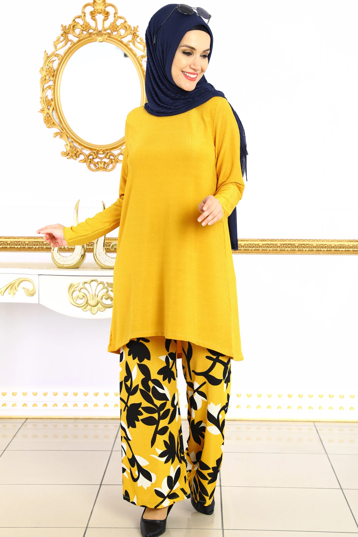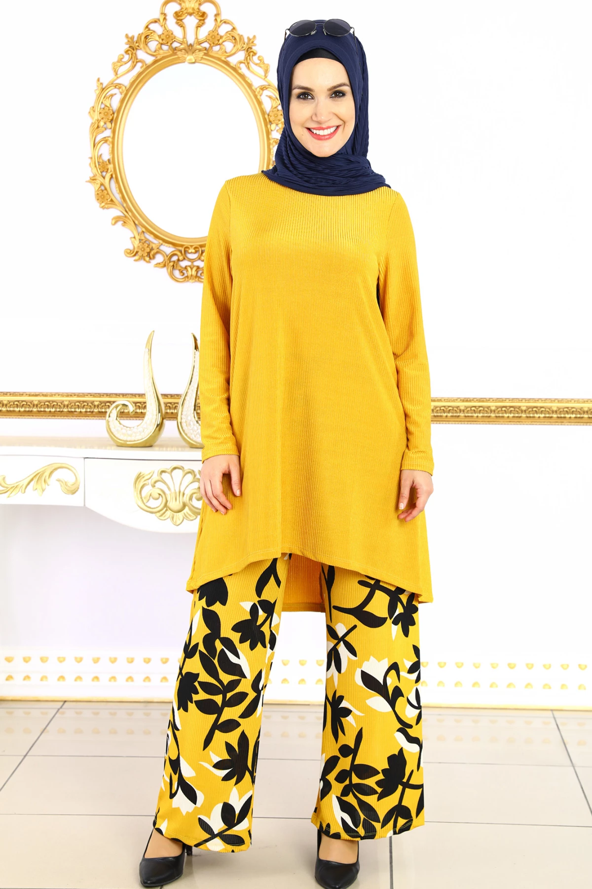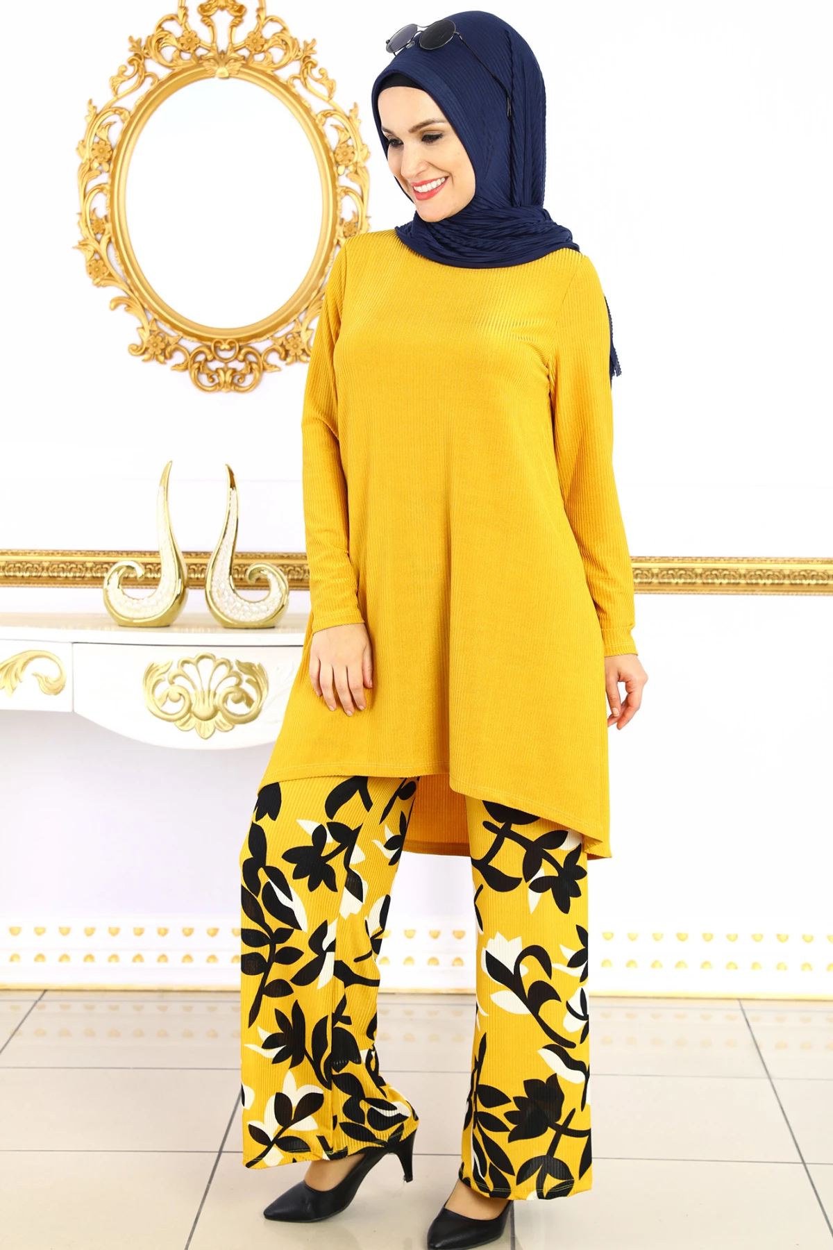 Needion - Çiçekli Pantolon Tunik Tesettür 2'li Takım Hardal 1(36-38)