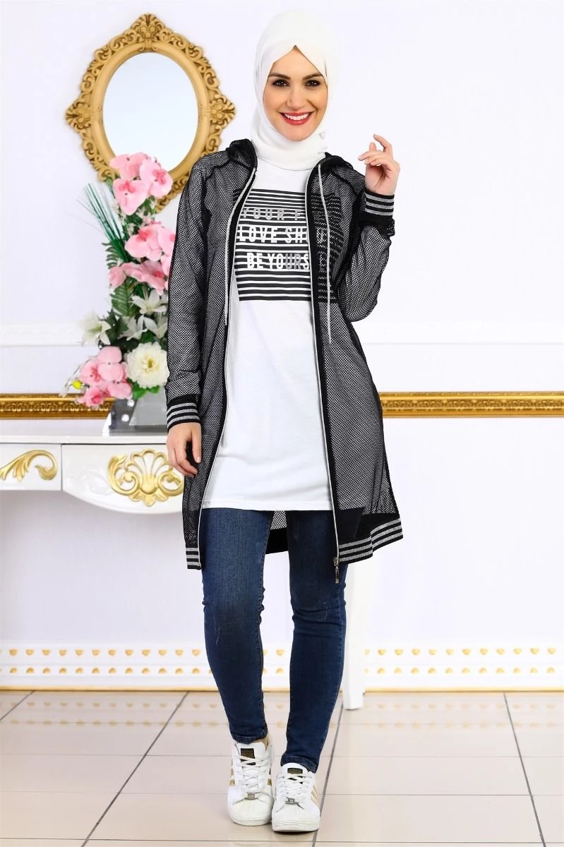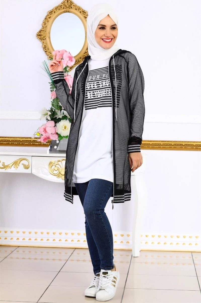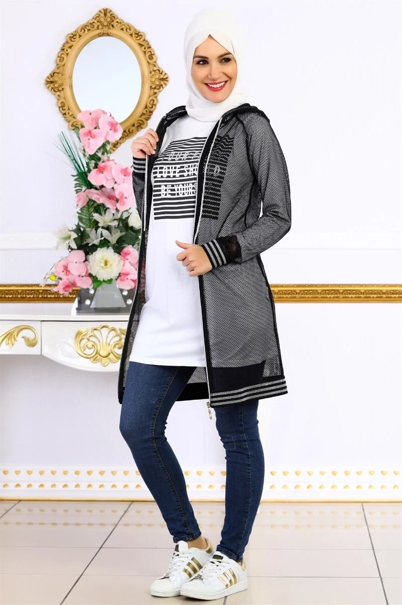 File Kapşonlu Tesettür Takım Siyah S (38)