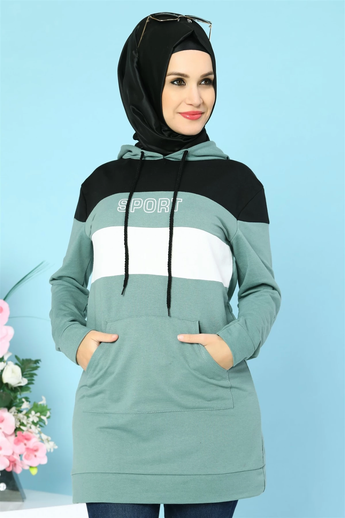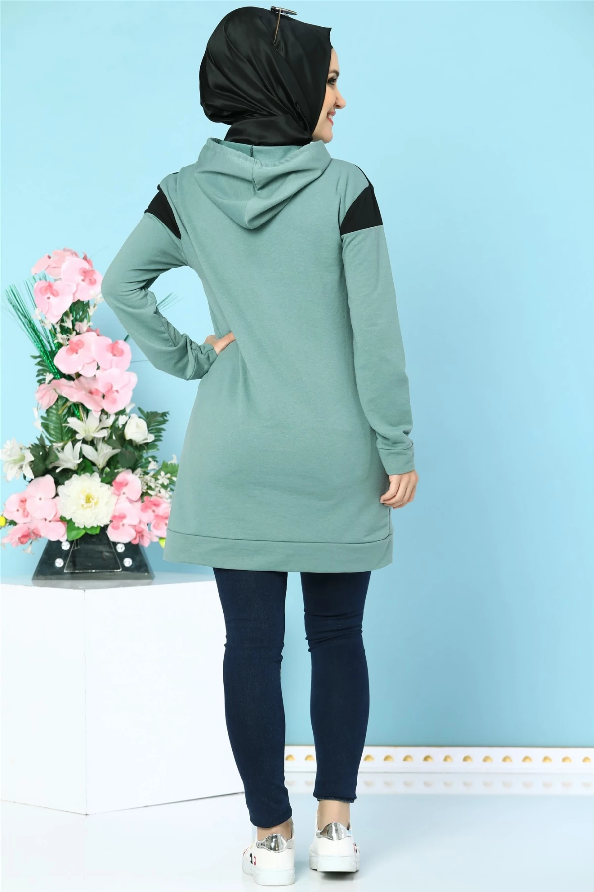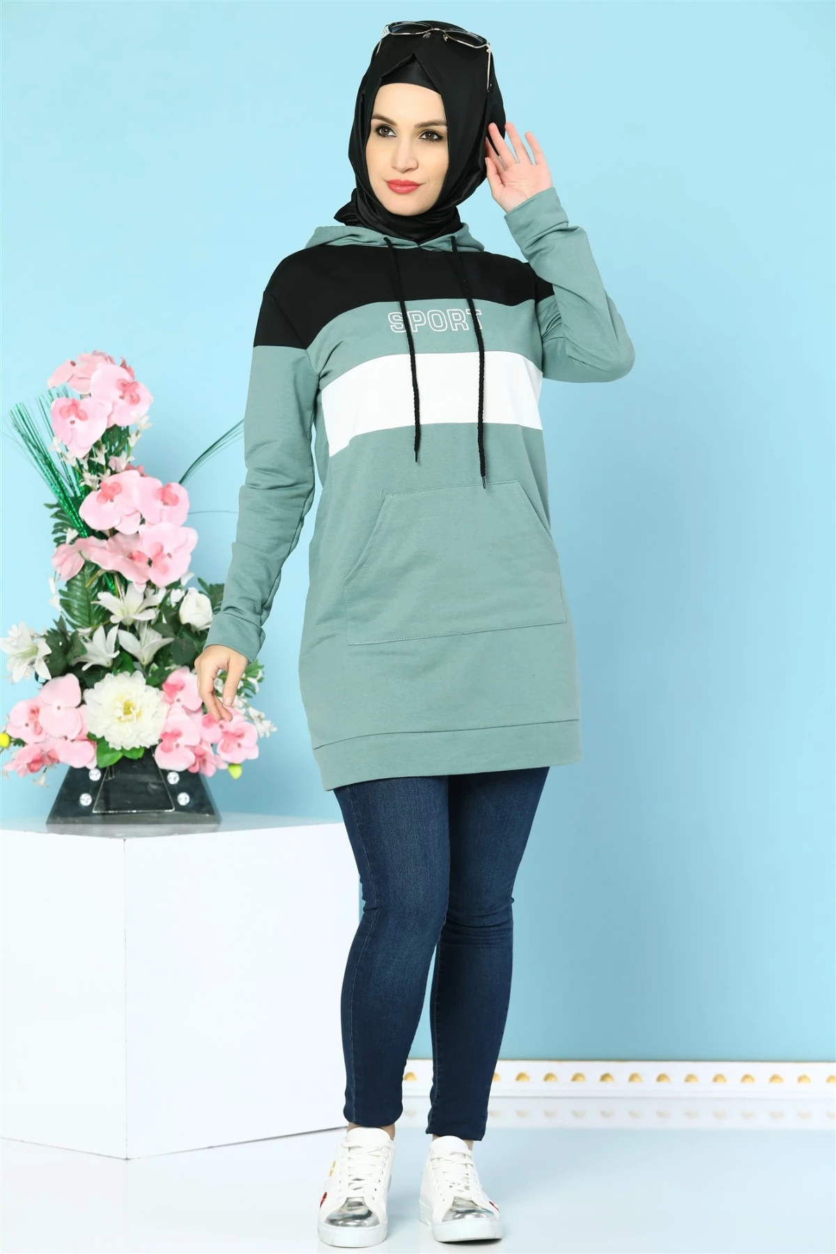 Baskılı Kapşonlu Tesettür Sweat Tunik Mint STD(36-44)