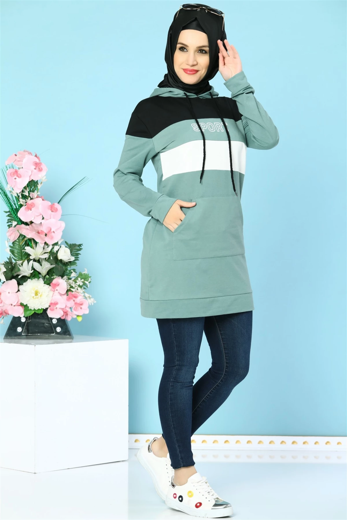 Needion - Baskılı Kapşonlu Tesettür Sweat Tunik Mint STD(36-44)