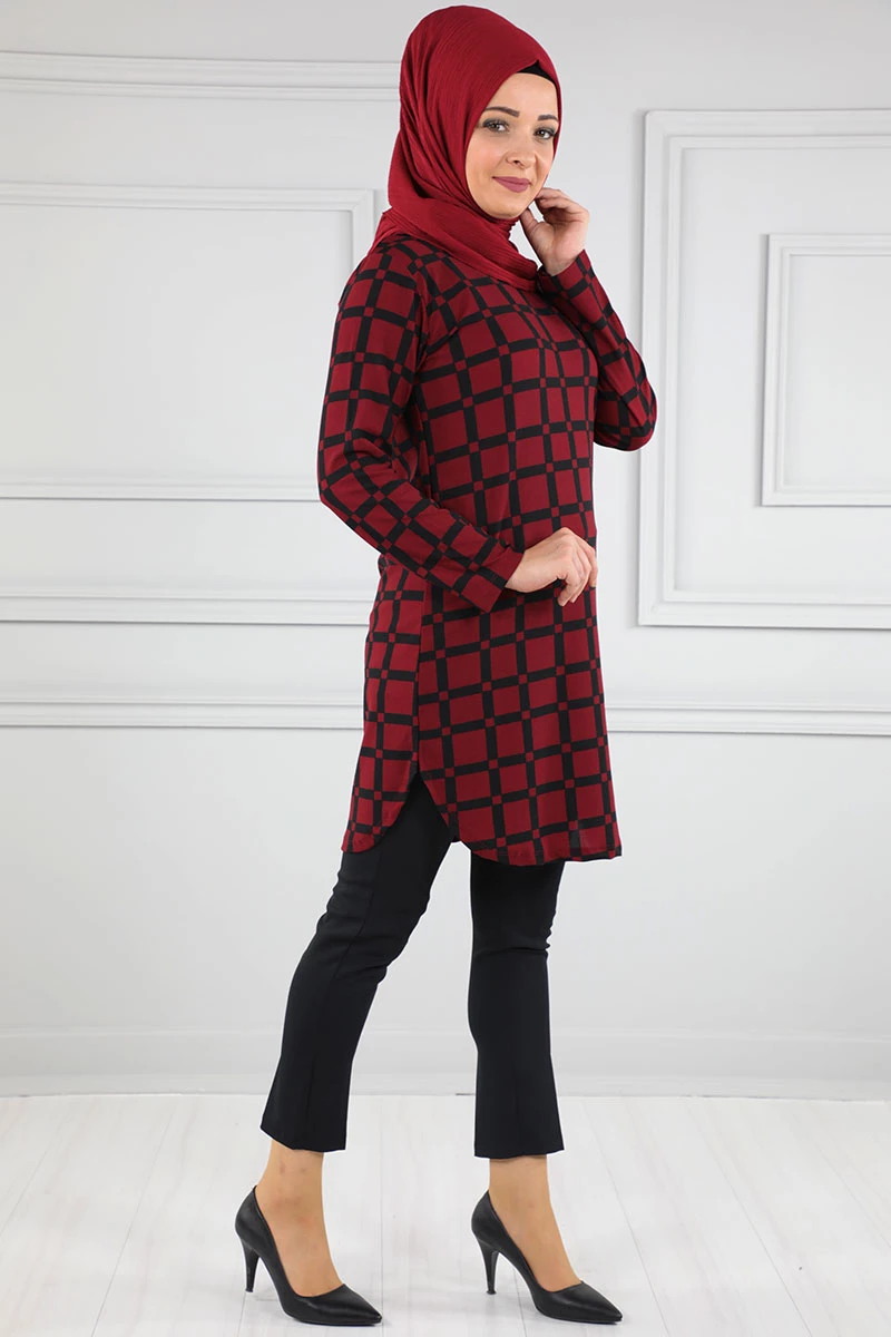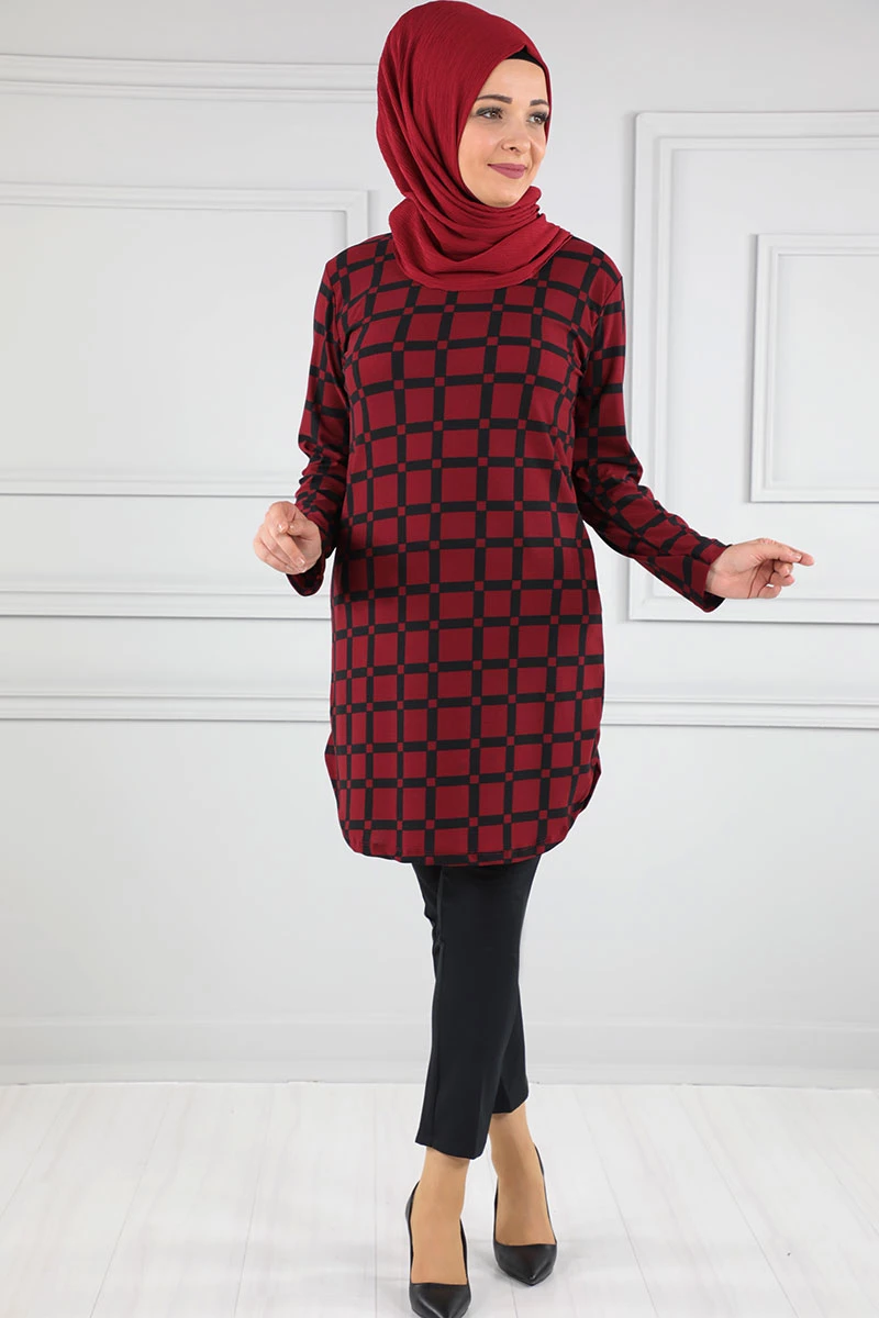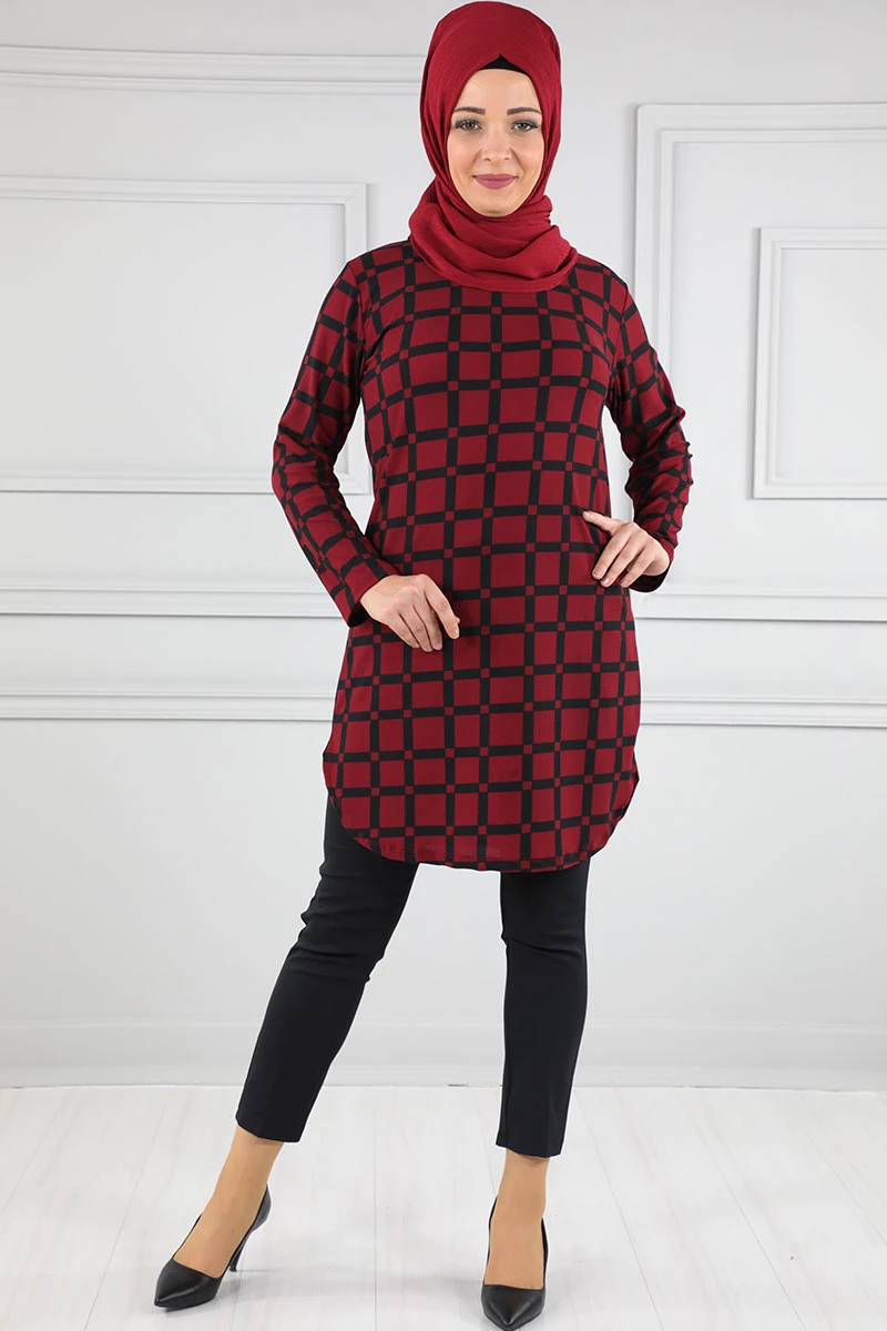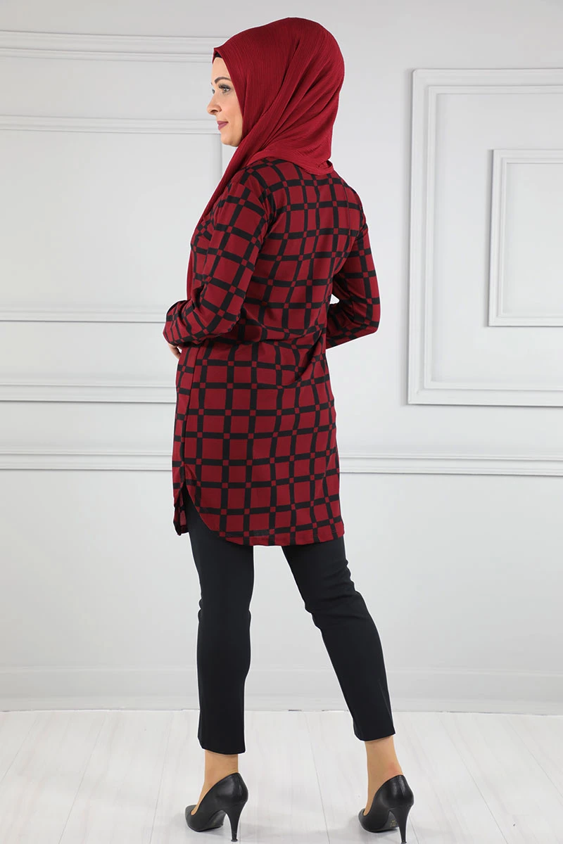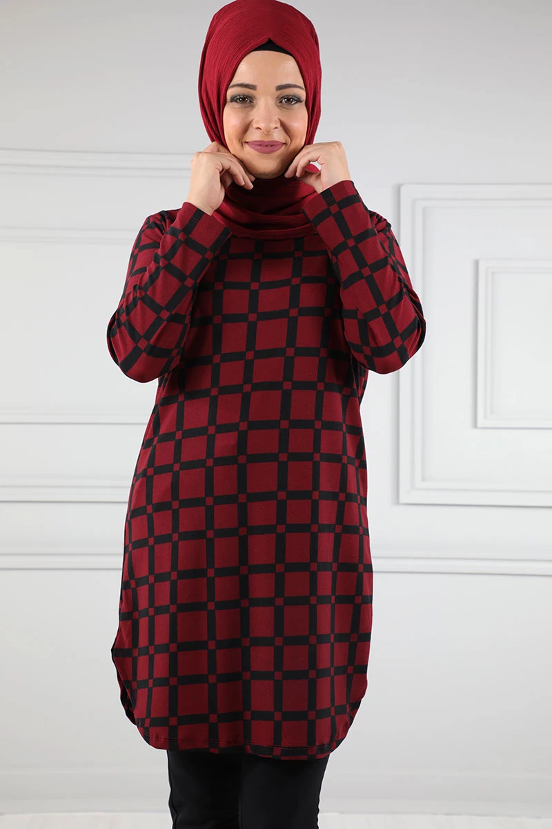 Baskılı Krep Tesettür Tunik Bordo 48 2xl
