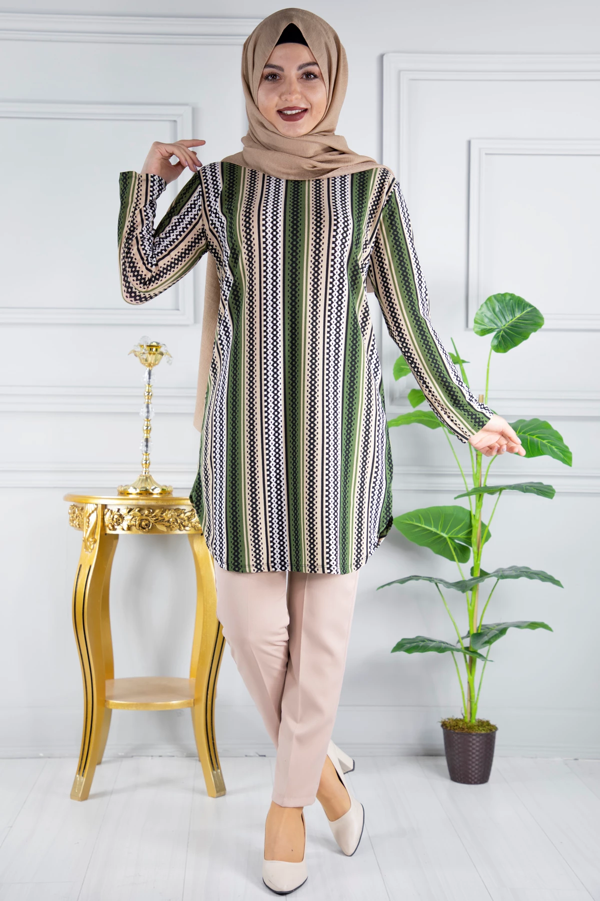 Ürünümüz likralı elastik desenli empirme baskılı tunik baskısı özel olarak imal edilmiştir.Ürün kırışmayan kumaş özelliğiyle tercih sebebidir .Tam kalıp ve astarsızdır.