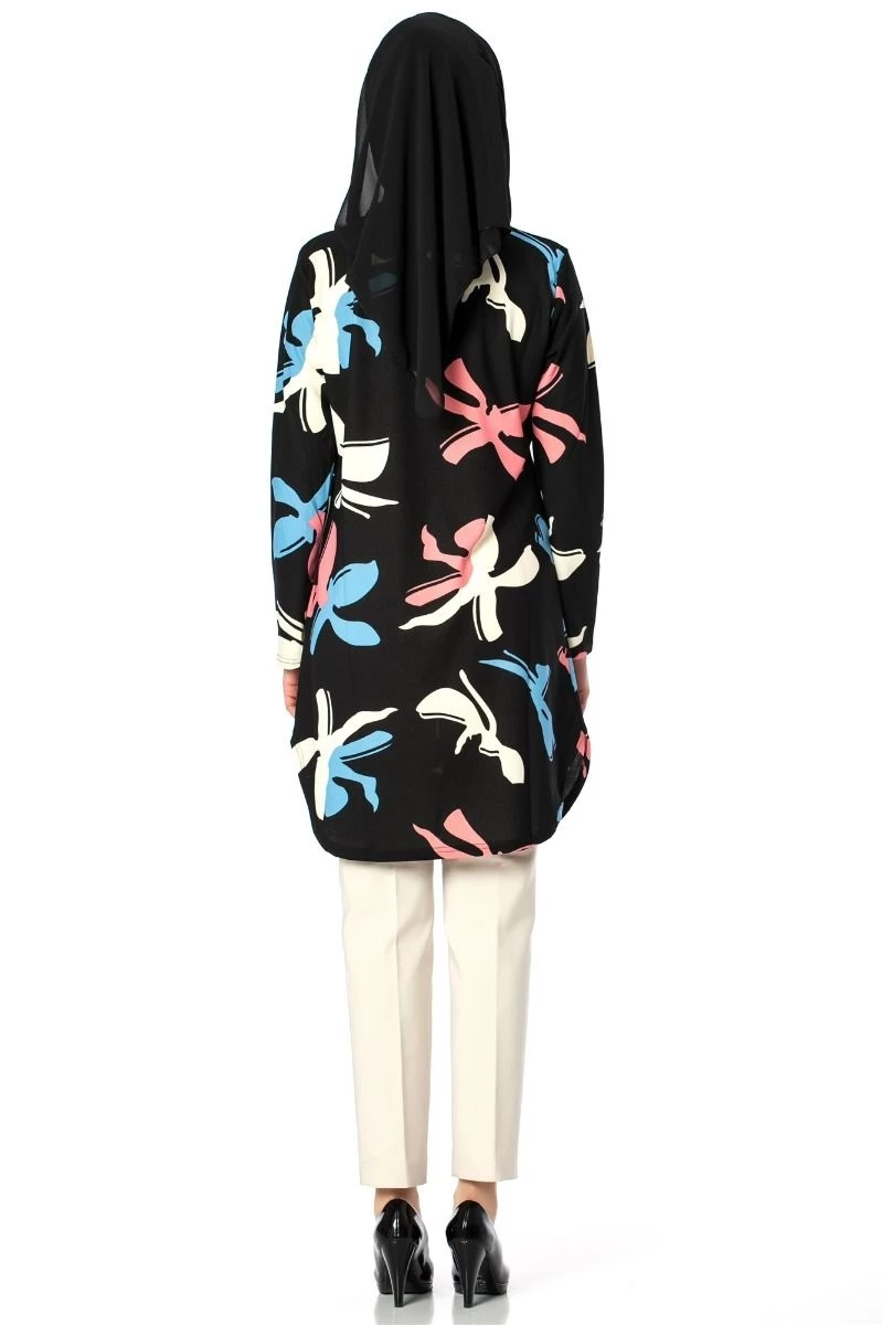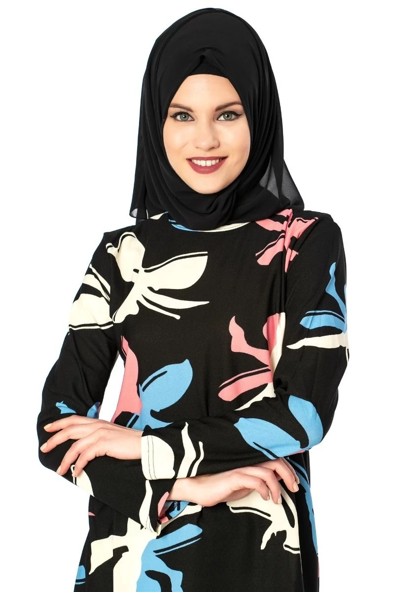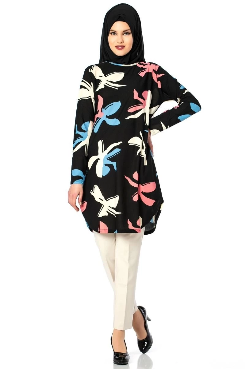 Baskılı Krep Tesettür Tunik Siyah 07 S-M