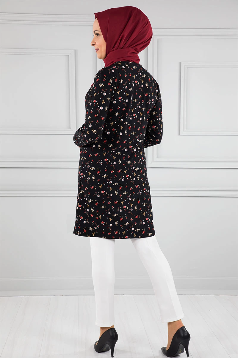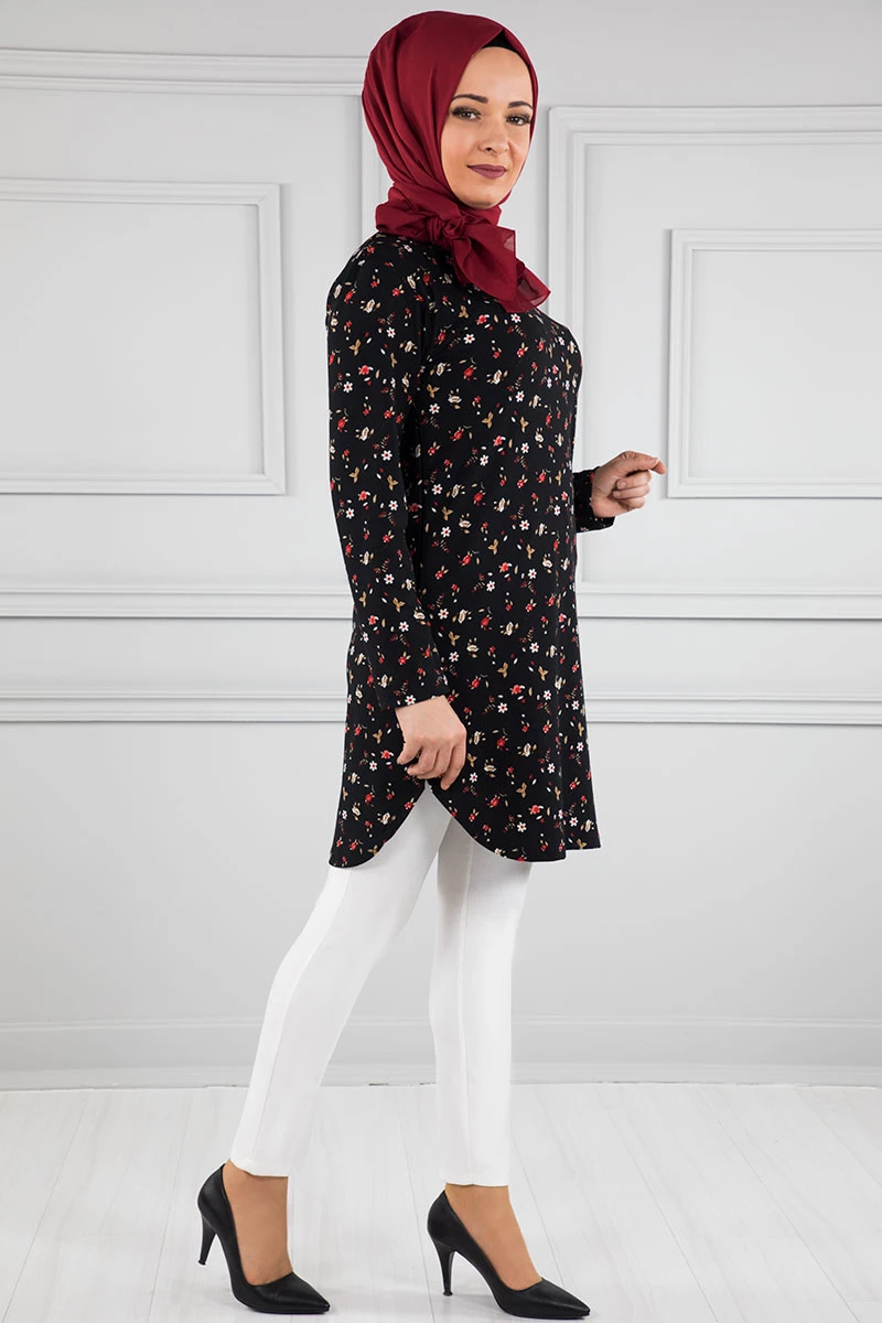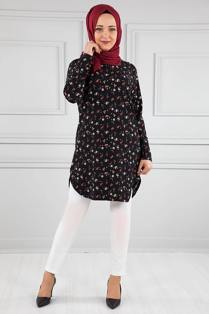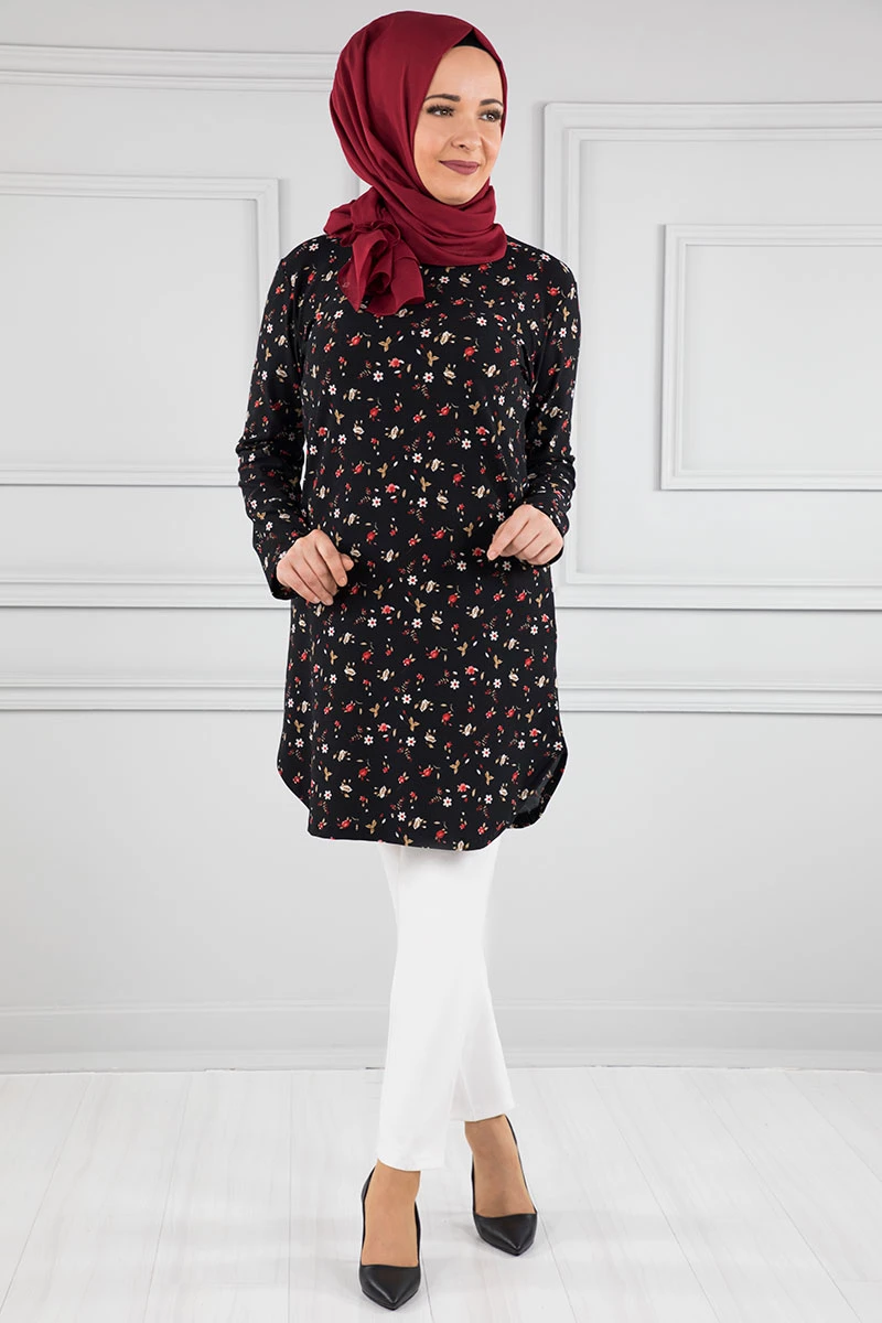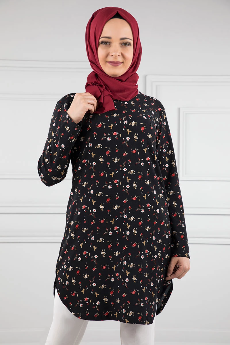 Baskılı Krep Tesettür Tunik Siyah 36 L-XL