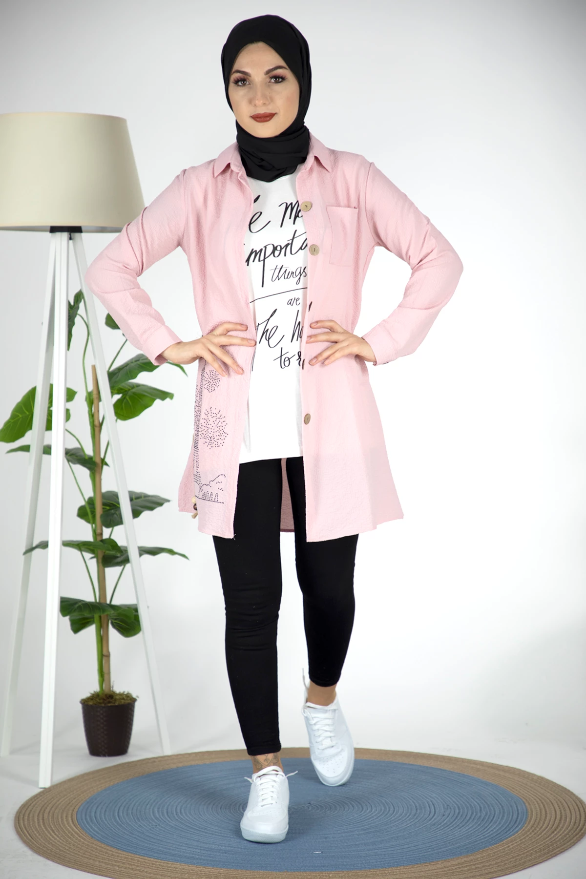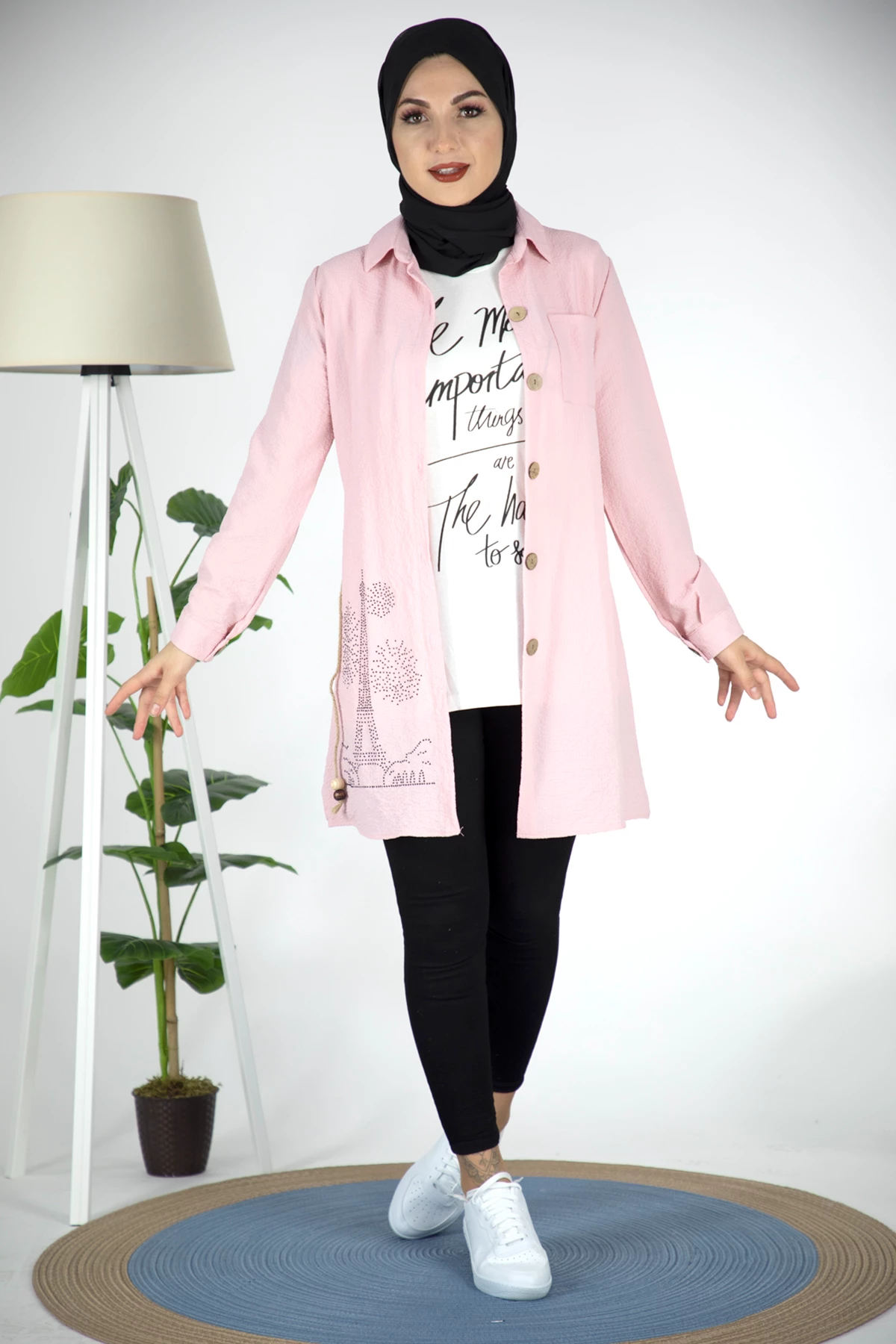 Needion - Baskılı Tshırt Gömlek Tesettür Takım Pembe Pembe L