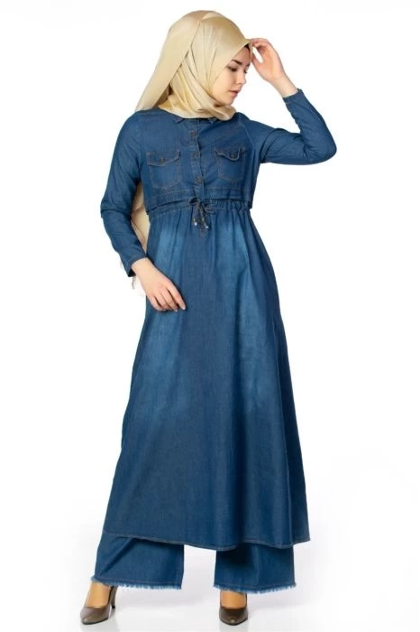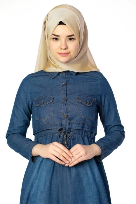 Needion - Belden Bağlamalı Göğüs Cepli Tesettür Kot Elbise Lacivert 38
