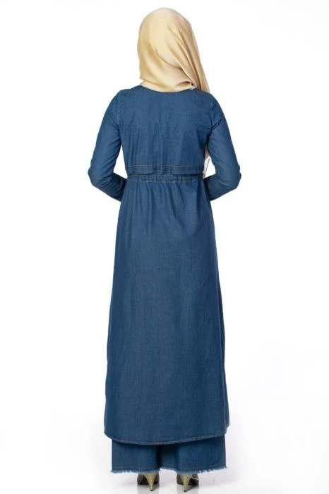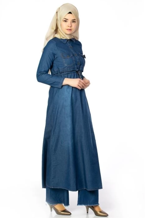Ürünümüz belden bağlamalı tesettür cep detaylı kot elbise.Tam kalıptır.