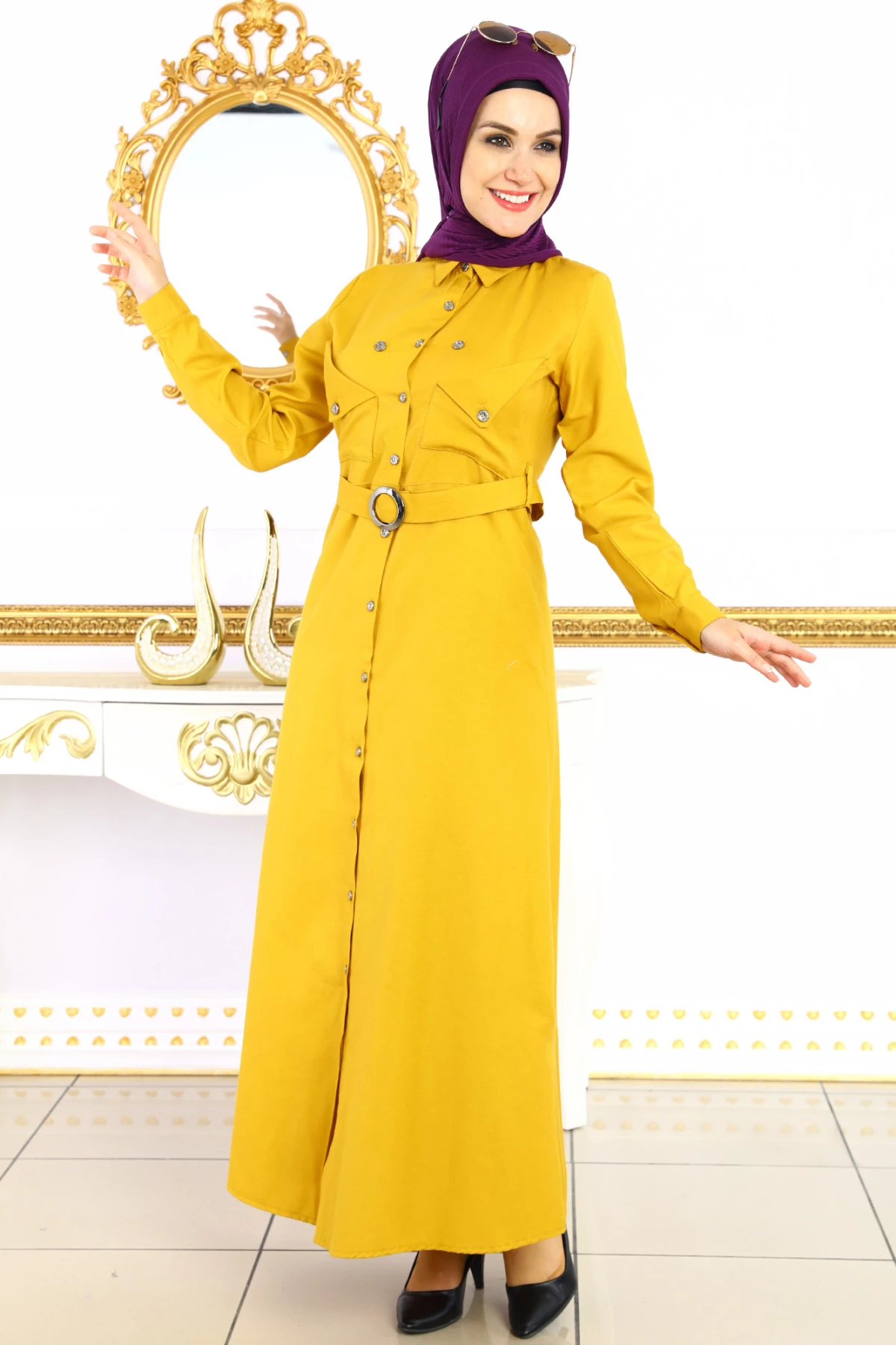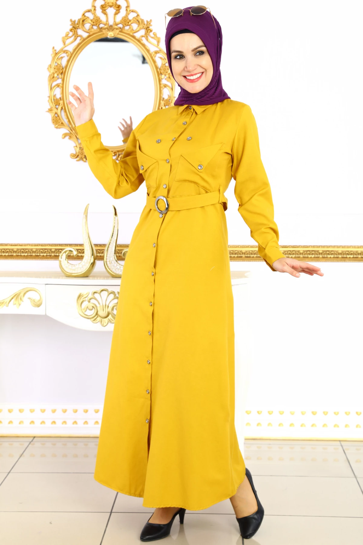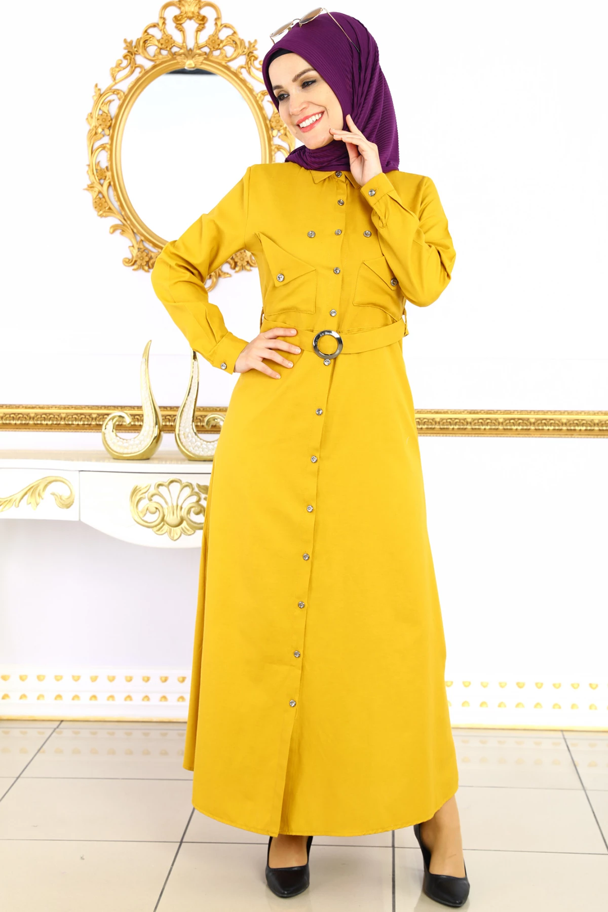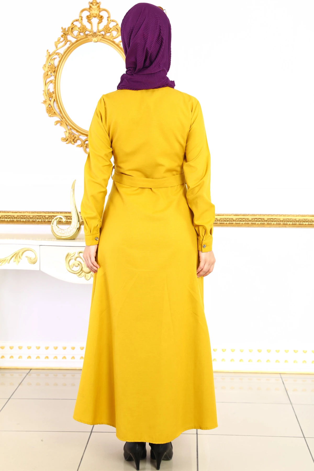 Beli Kemer Kuşaklı Katman Cepli Tesettür Elbise Hardal S