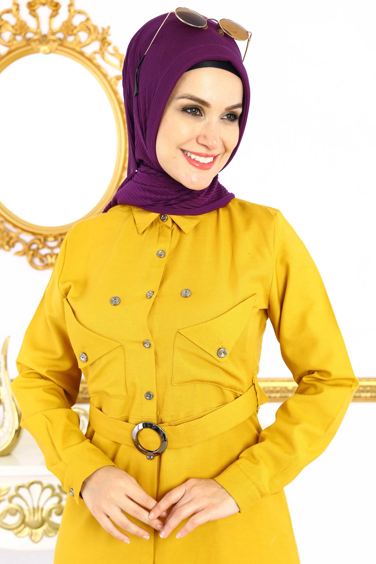 Needion - Beli Kemer Kuşaklı Katman Cepli Tesettür Elbise Hardal S