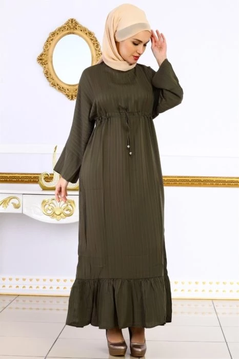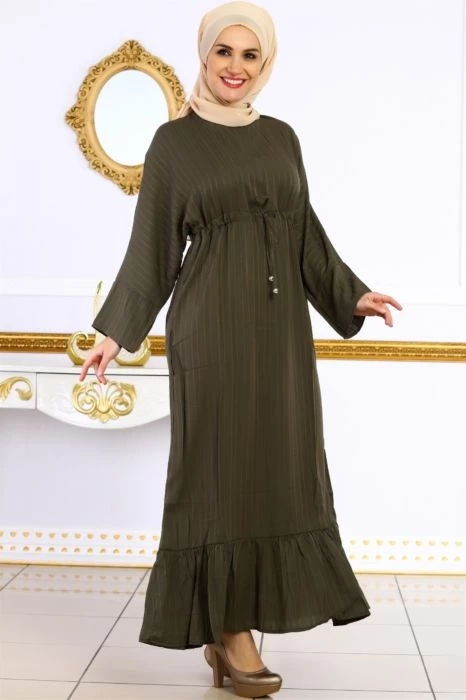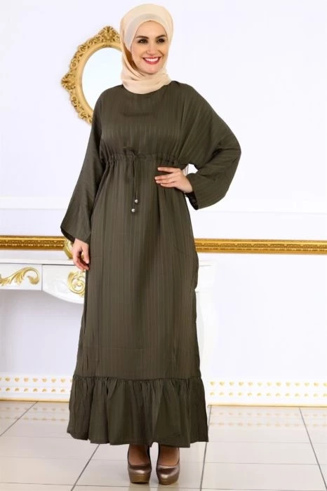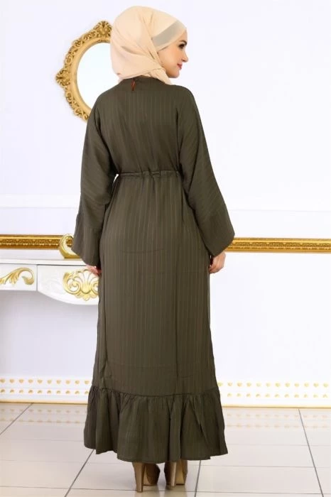 Beli Kuşaklı Jakar Tesettür Elbise Haki M