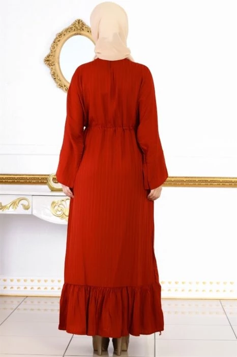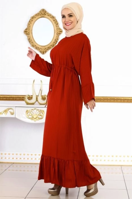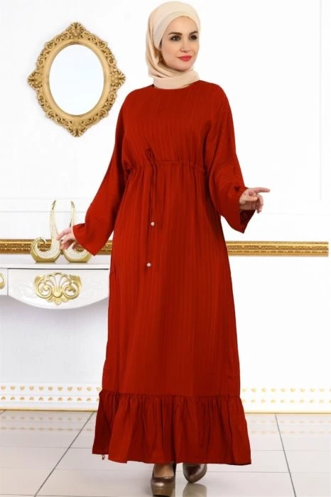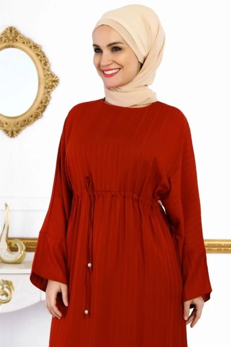 Beli Kuşaklı Jakar Tesettür Elbise Kiremit S