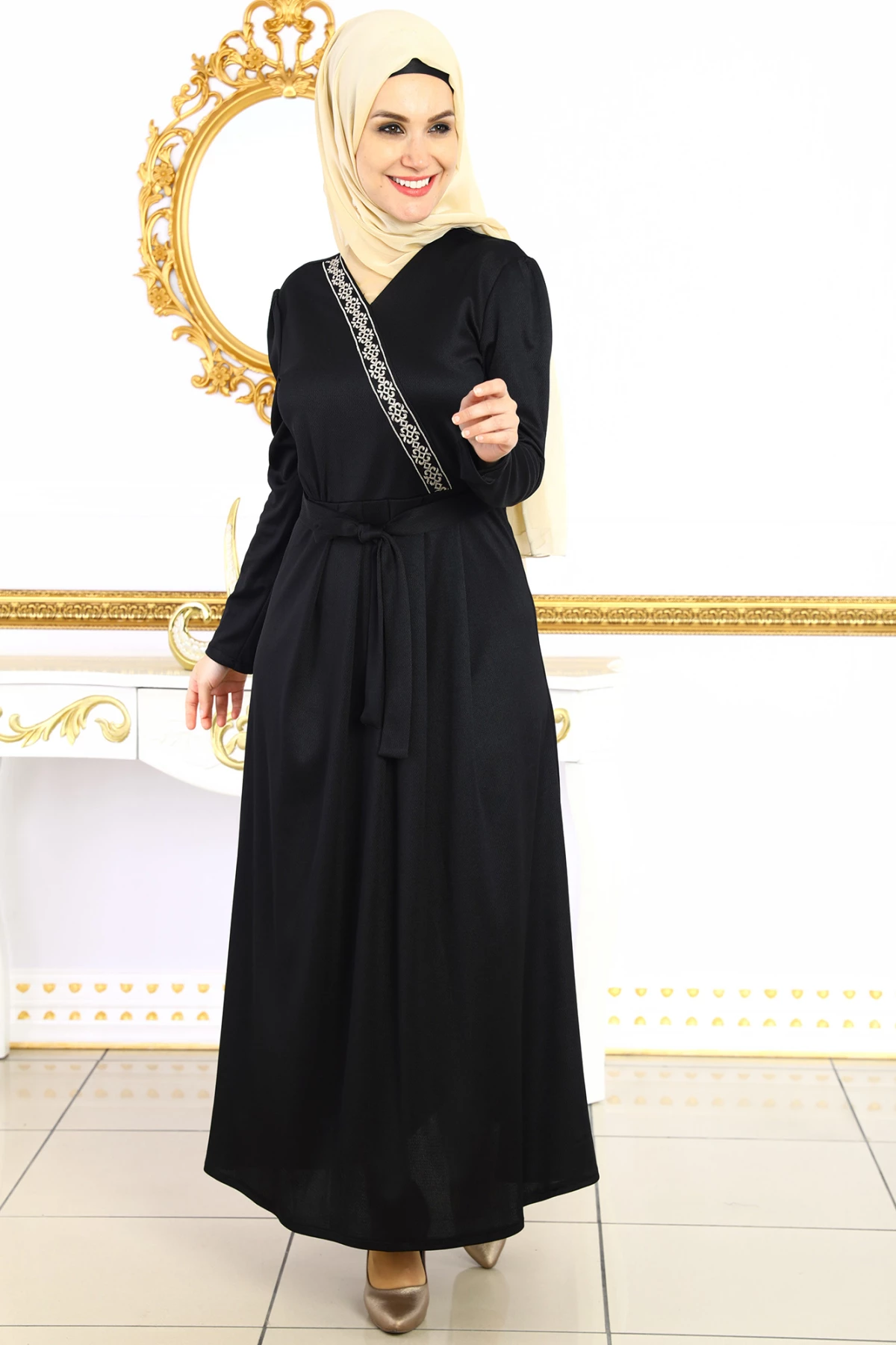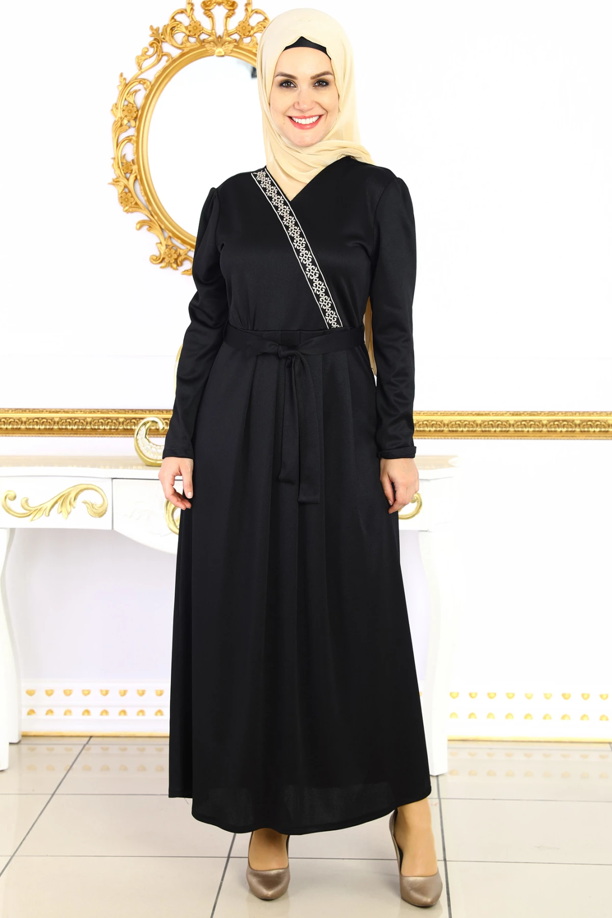 Needion - Beli Kuşaklı Önü Desenli Tesettür Elbise Siyah S