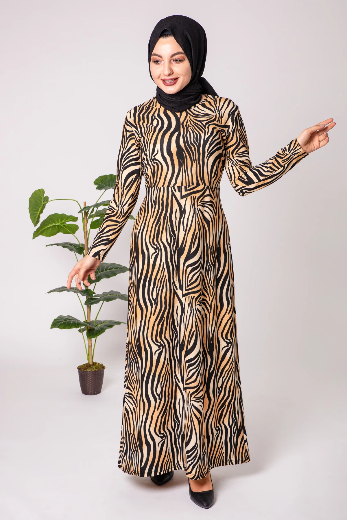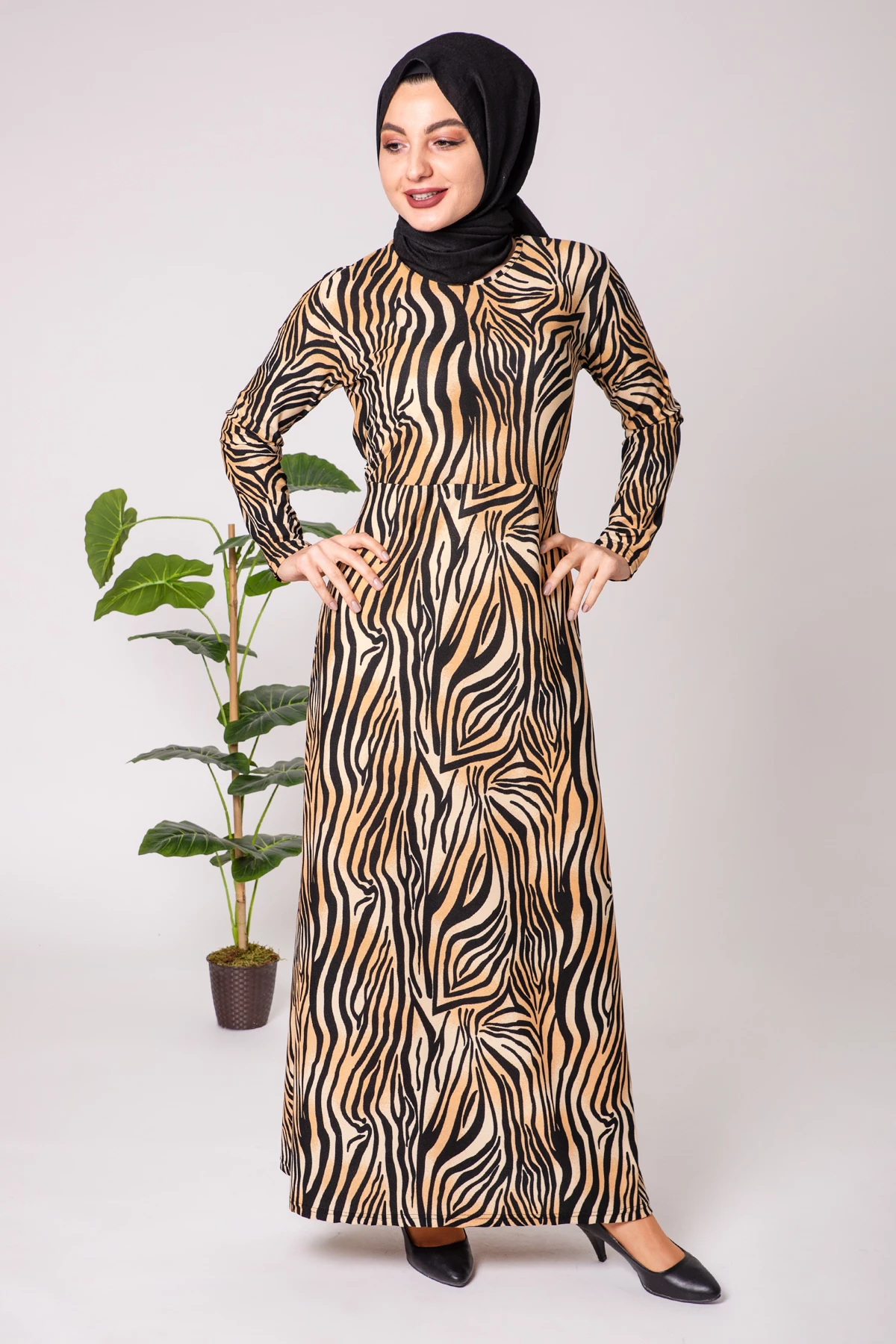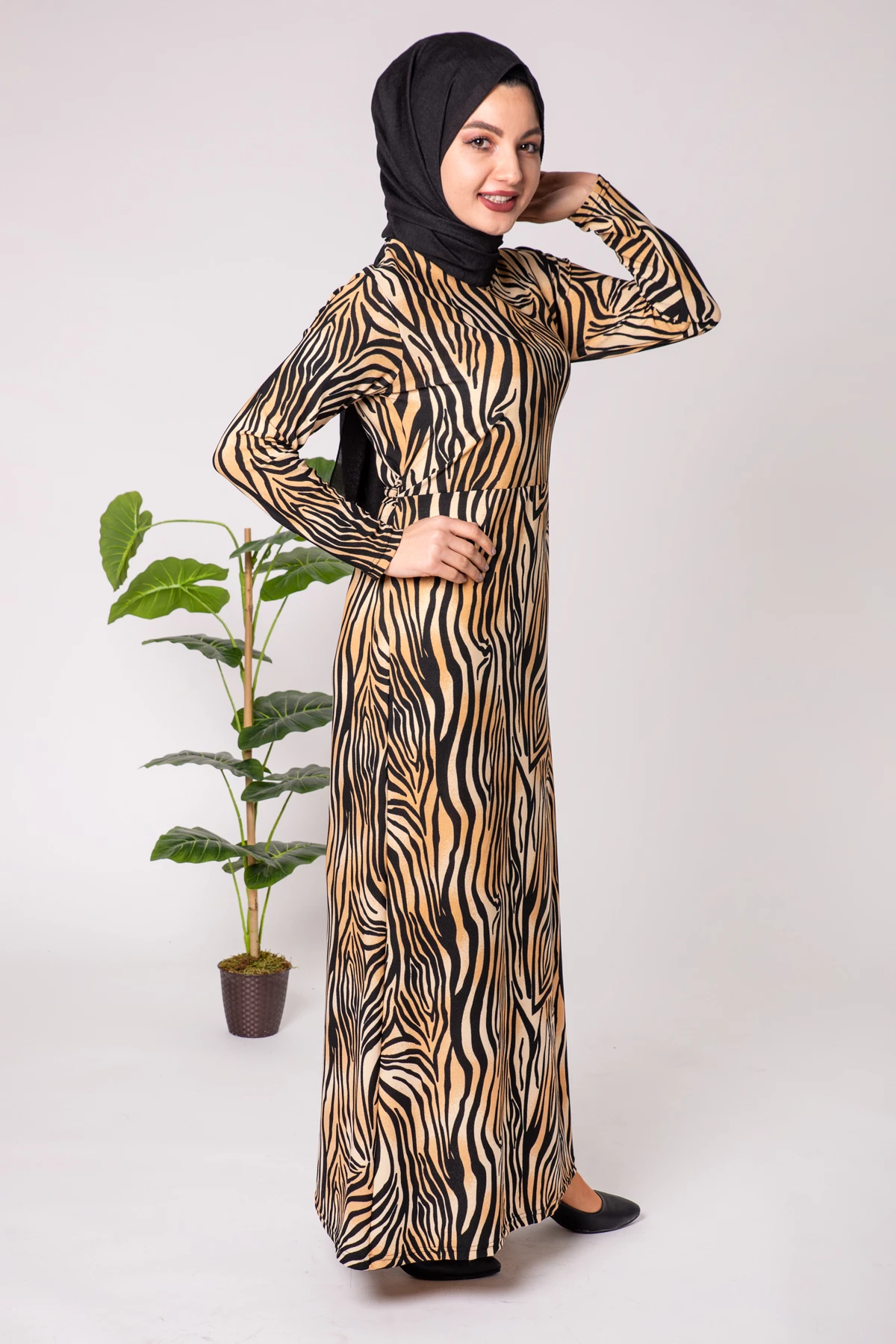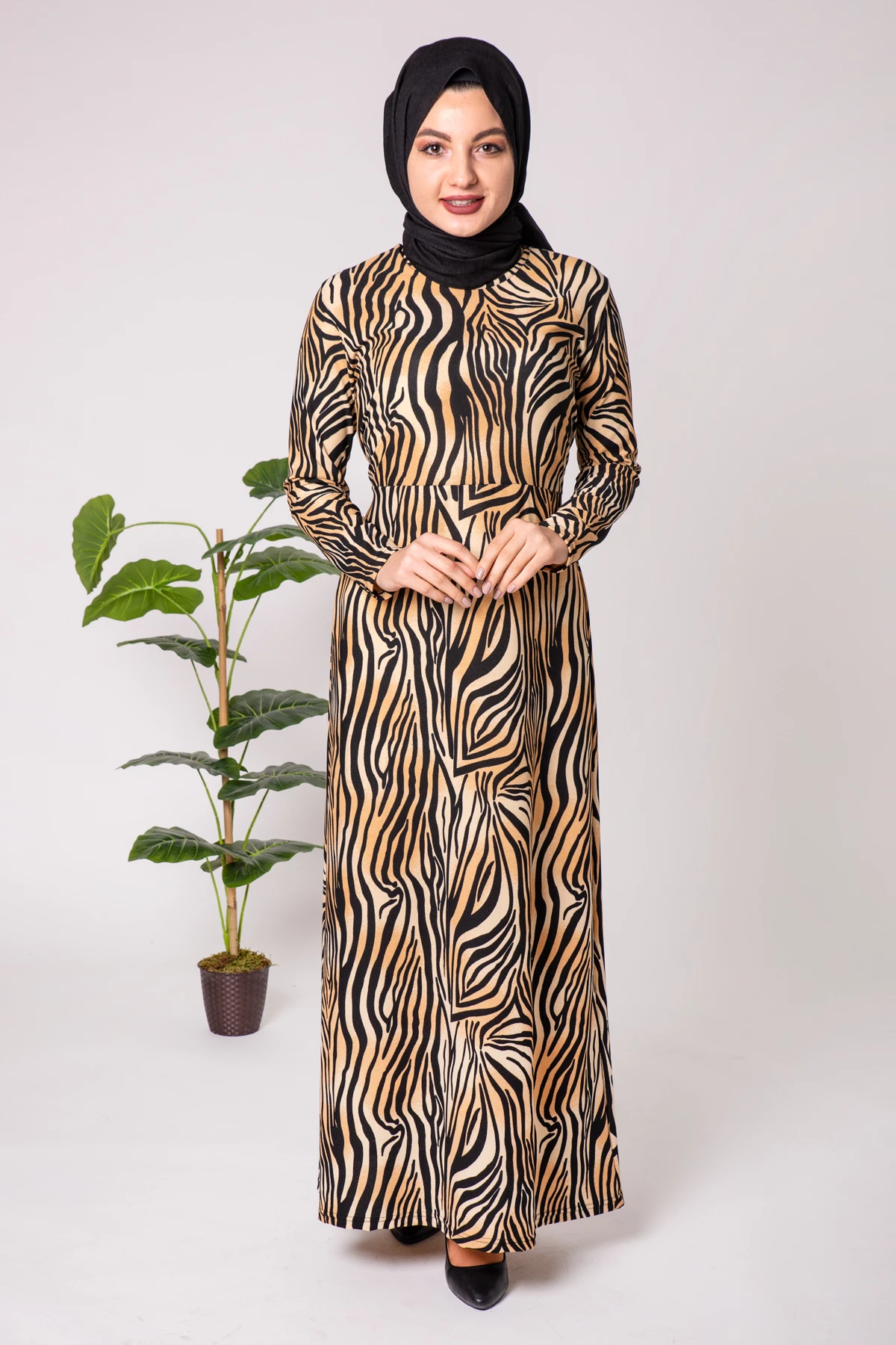Beli Kuşaklı Zebra Desen Tesettür Elbise AZ1015KH49 L