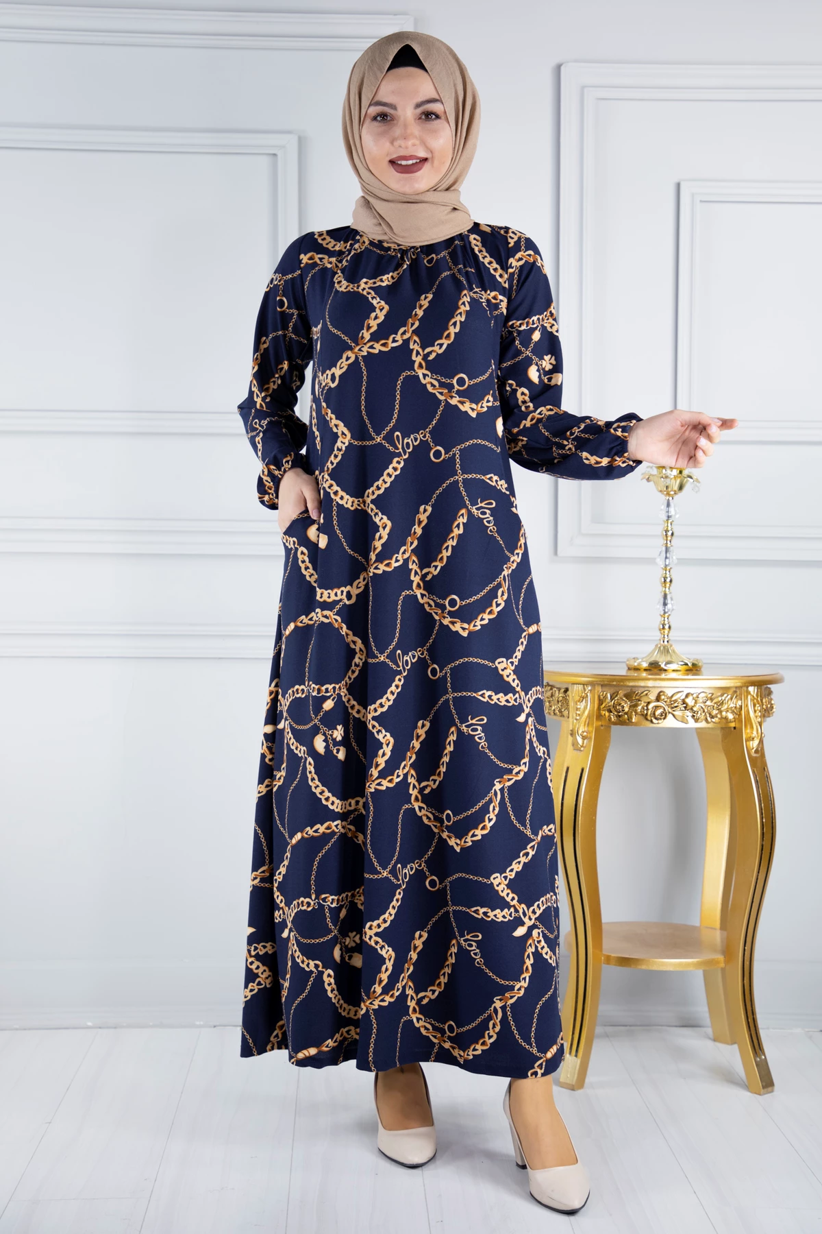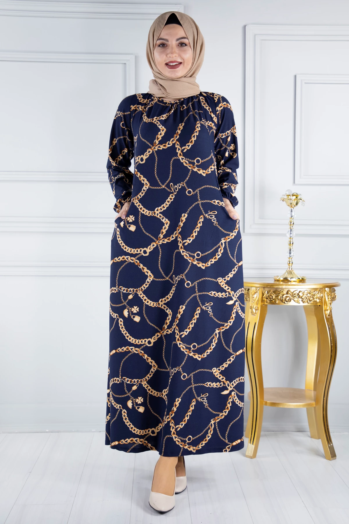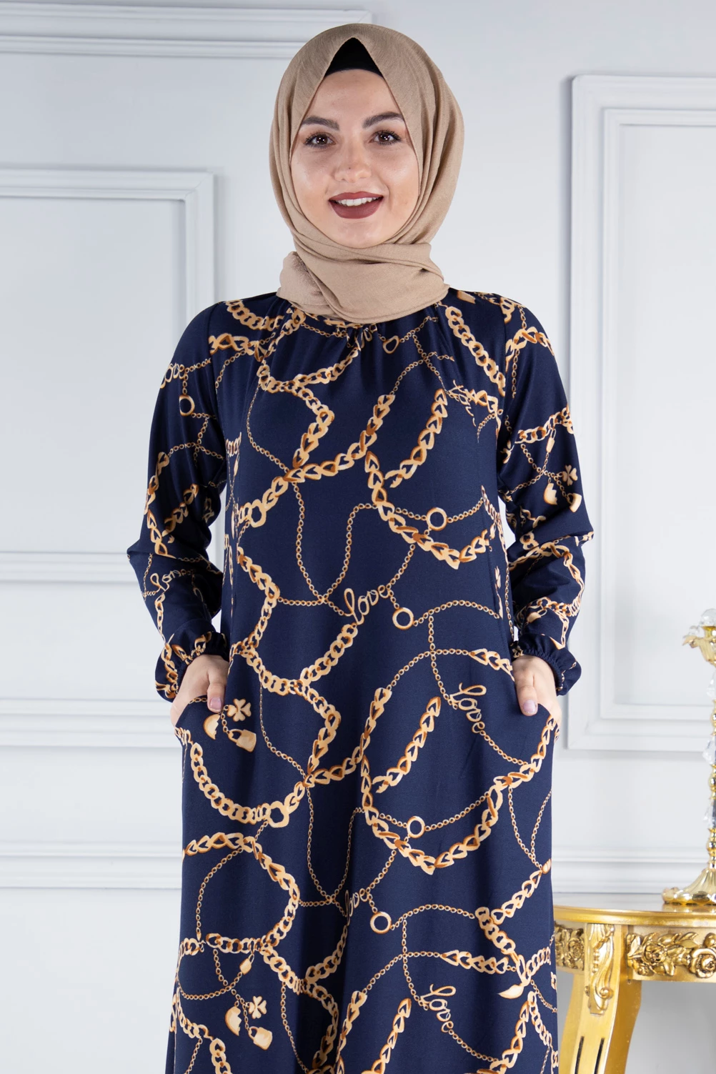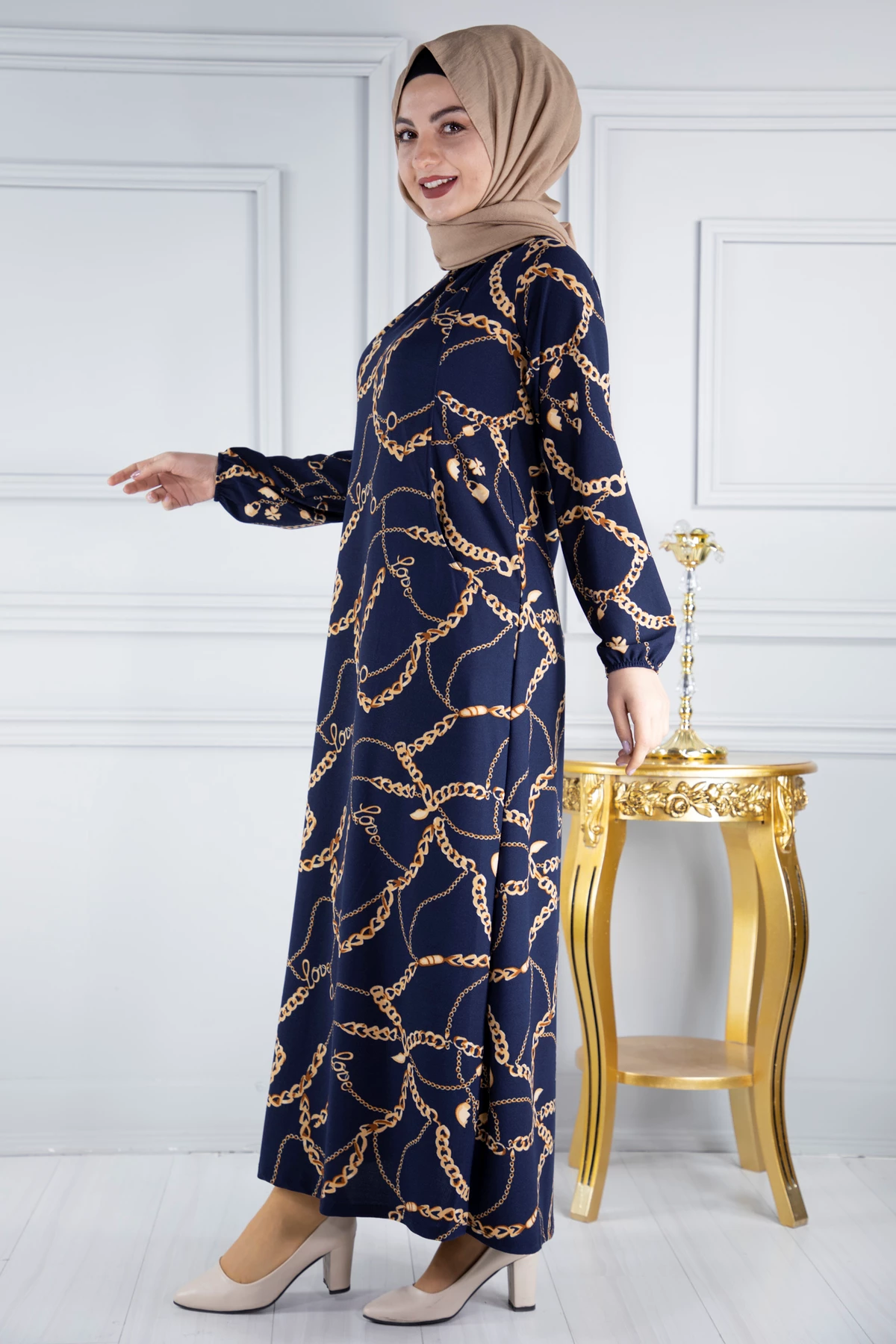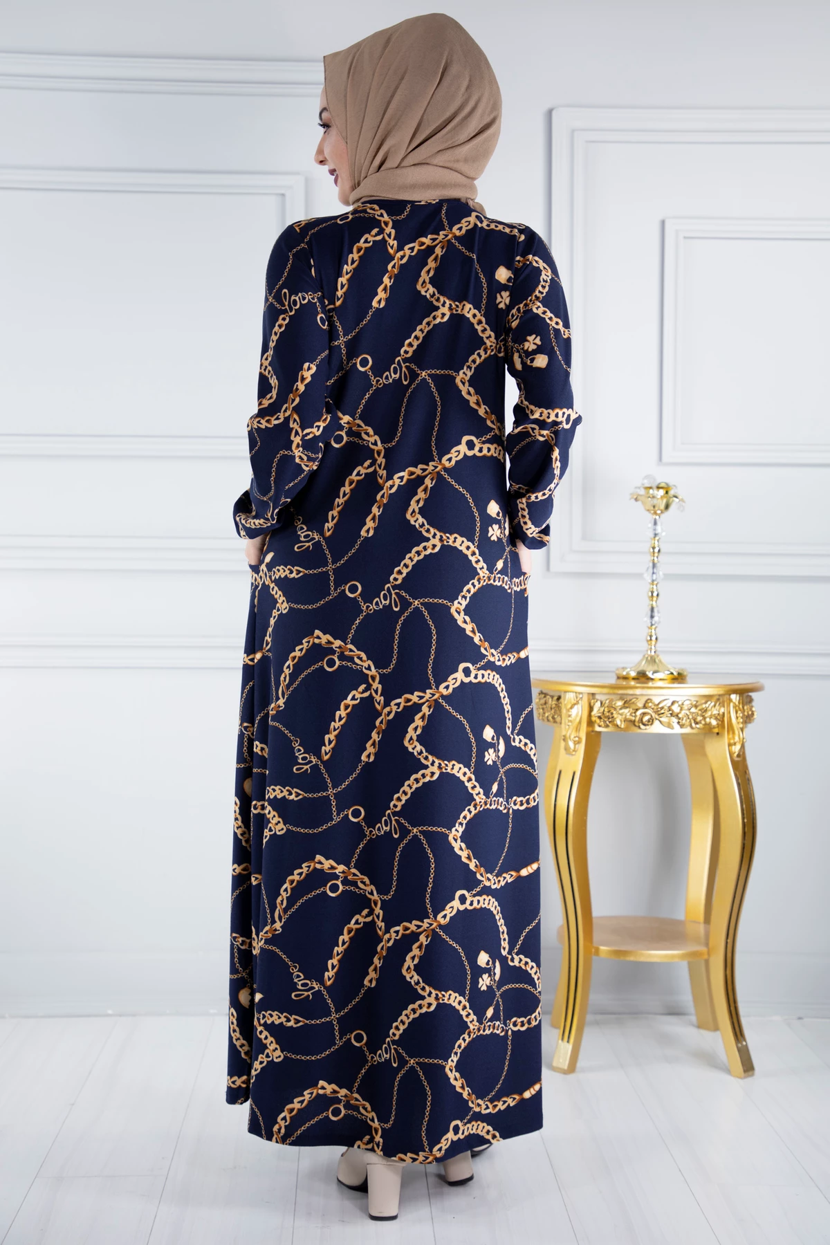 Beli Kuşaklı Zincir Desenli Tesettür Elbise FZ2012 Lacivert 15 S-M