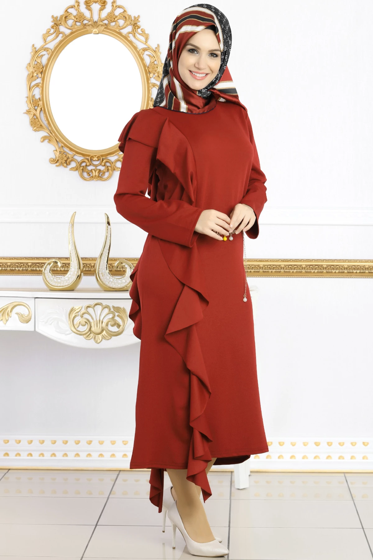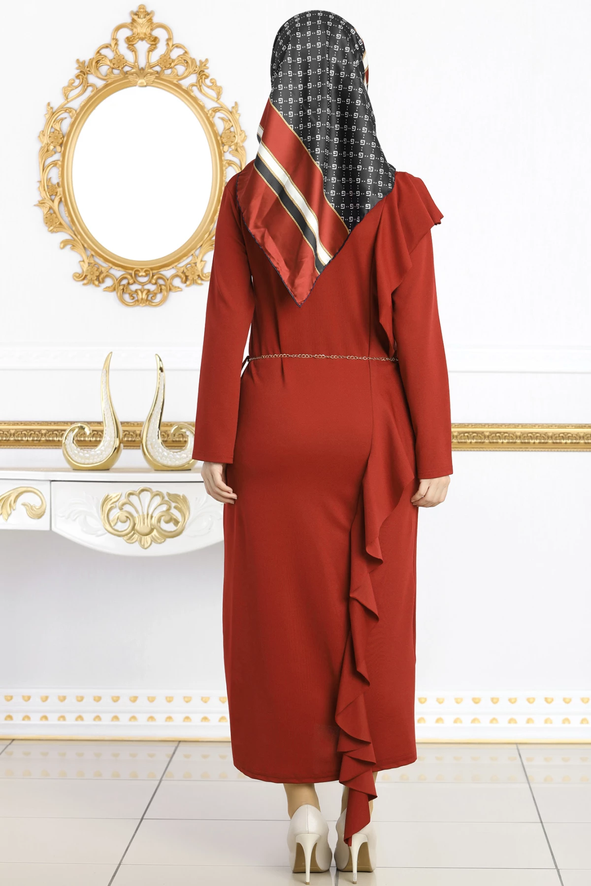 Beli Zincirli Yanları Fırfırlı Tesettür Elbise Bordo tr S-M