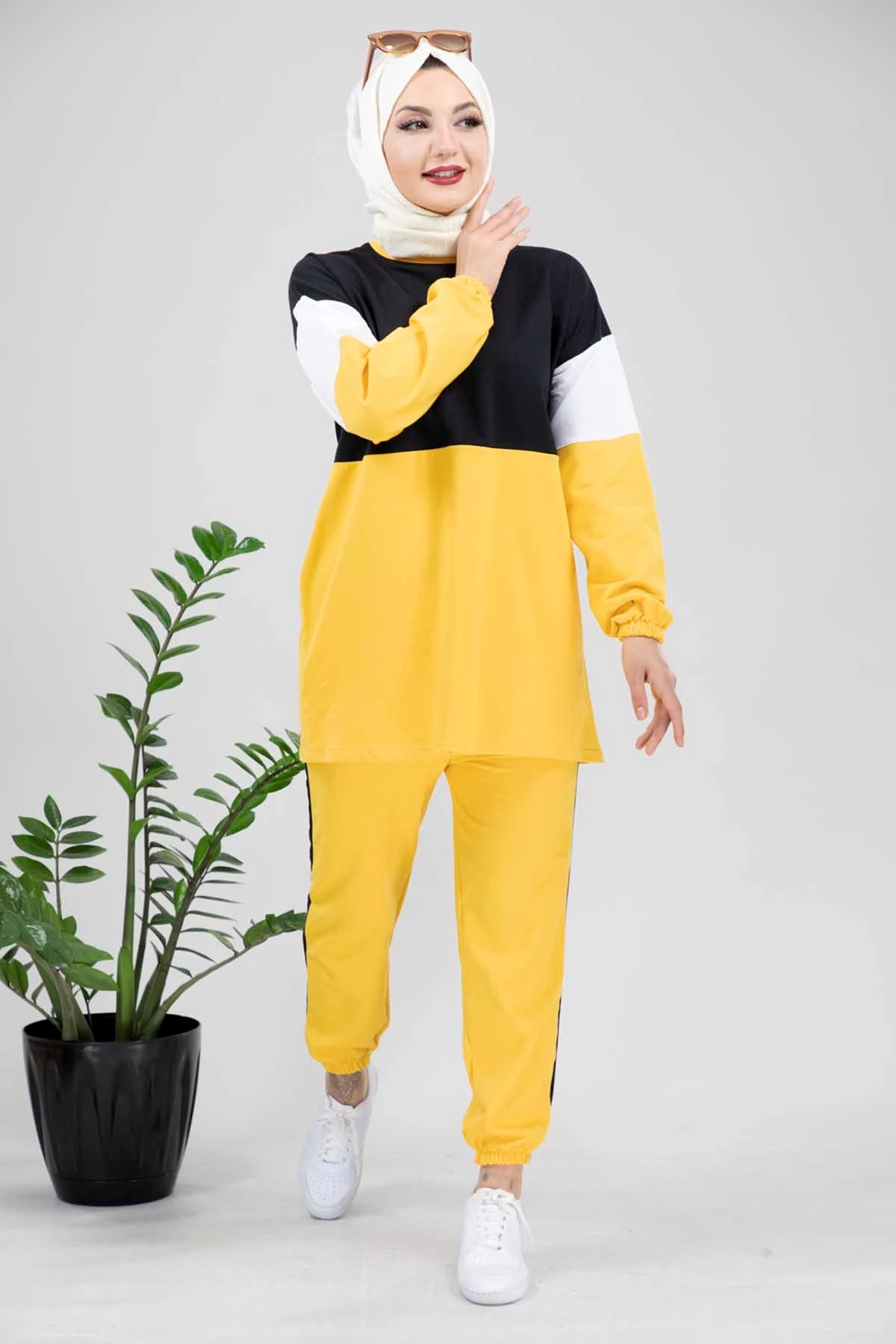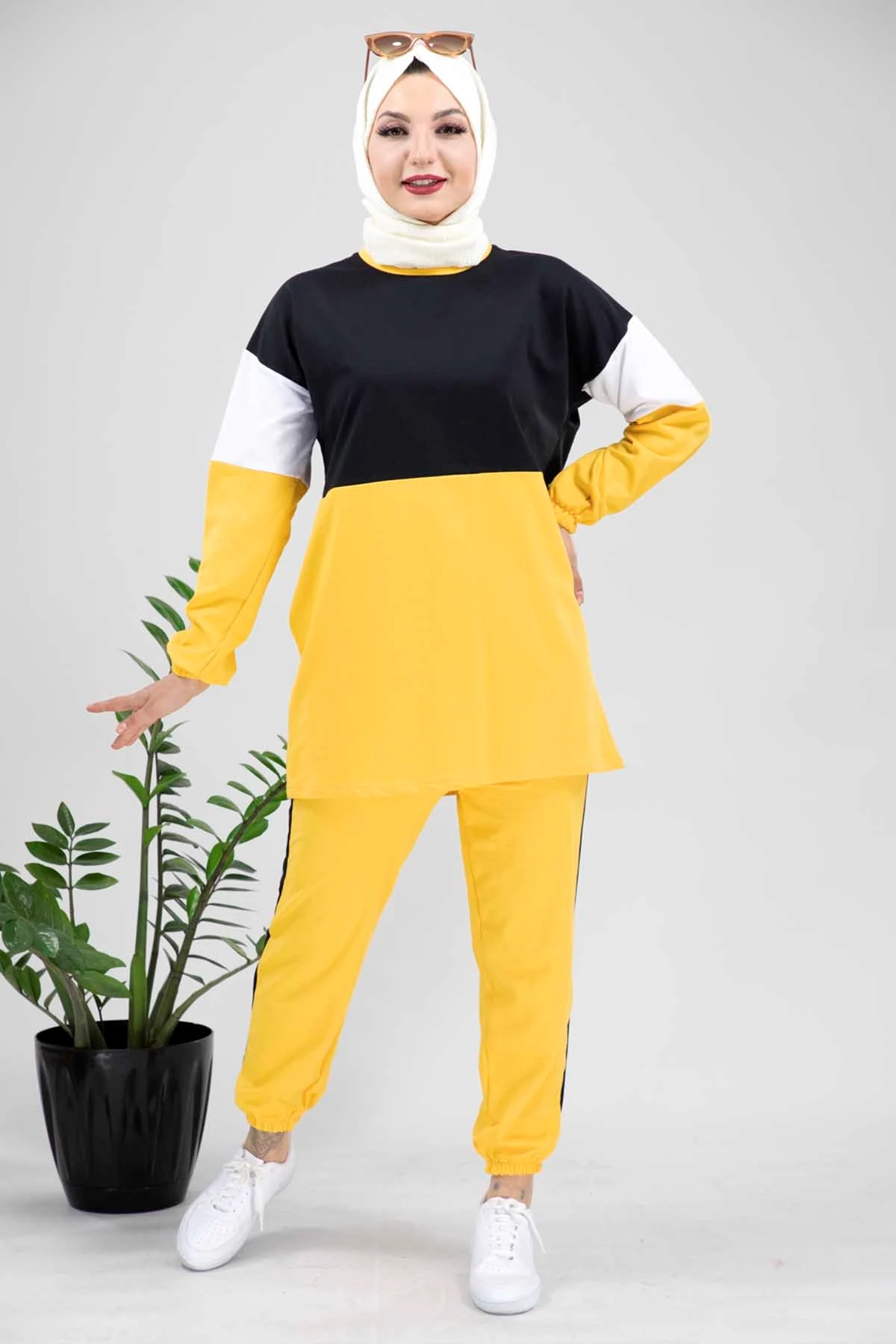 Needion - Bisiklet Yaka Renk Geçişli Tesettür Eşofman Takım Sarı Sarı S-M