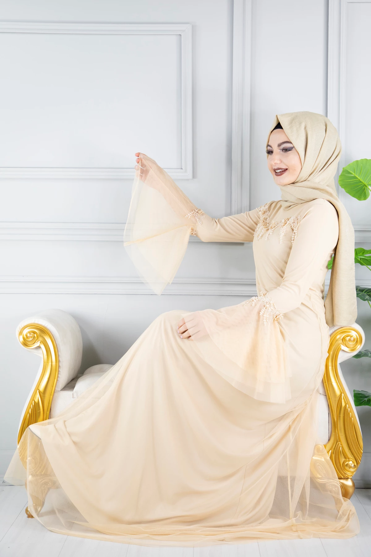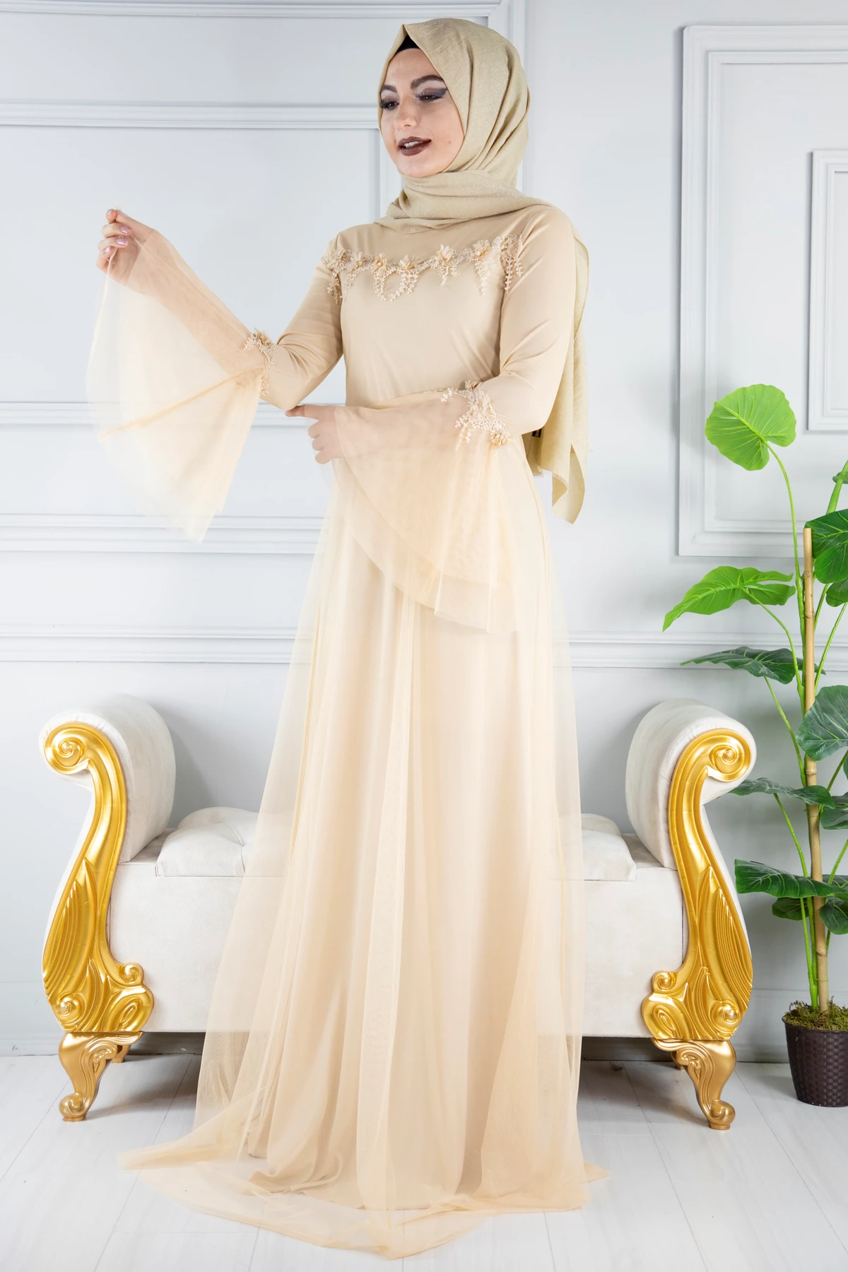 Needion - Bisiklet Yaka Volan Kol Tesettür Abiye Krem PC3019KM 38