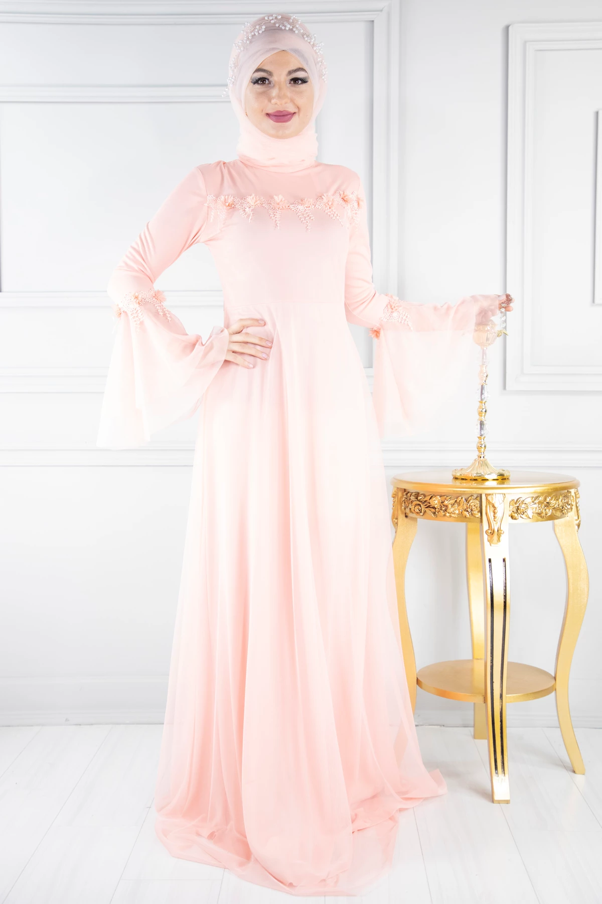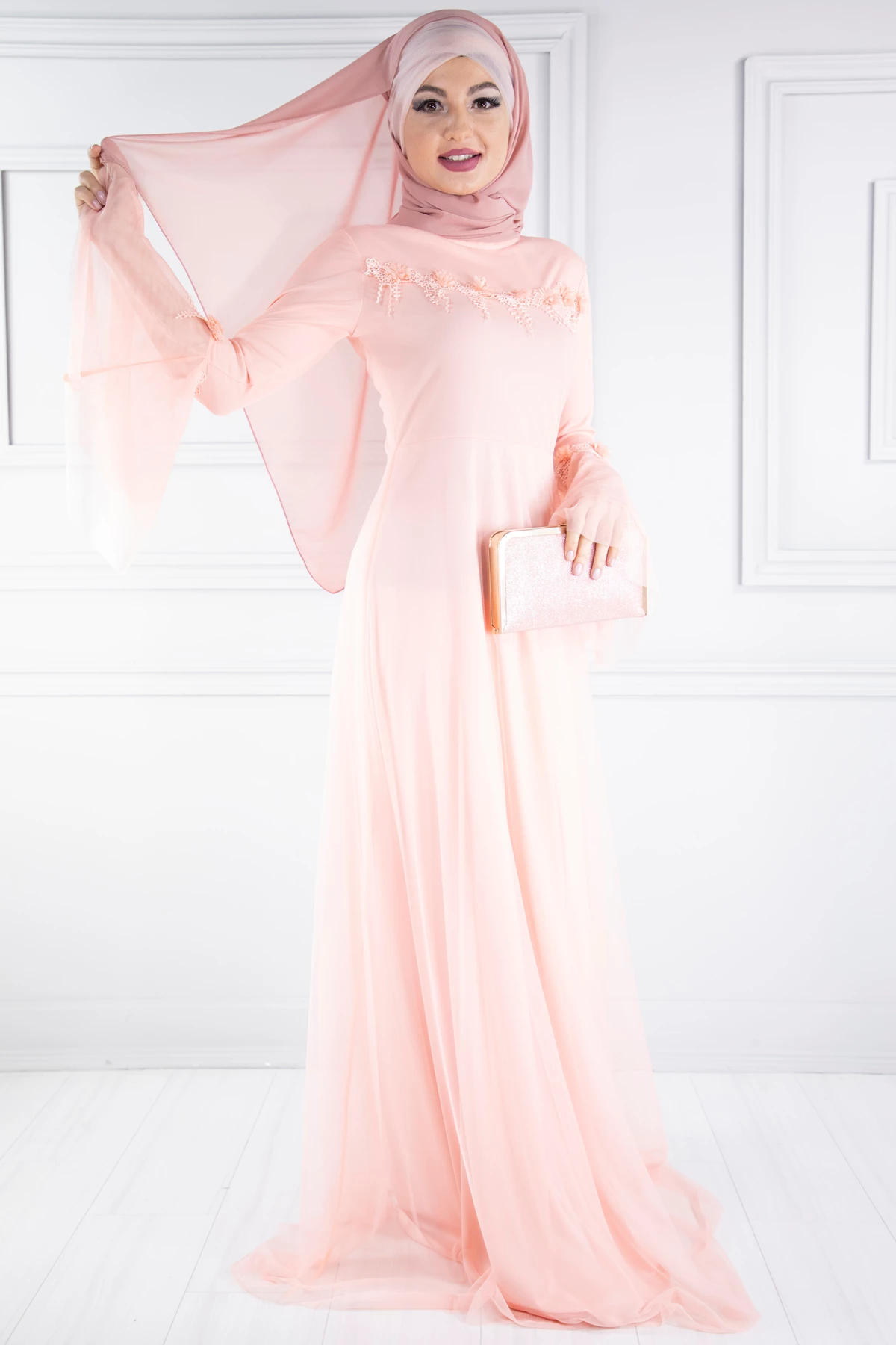 Bisiklet Yaka Volan Kol Tesettür Abiye Somon PC3019SM 38