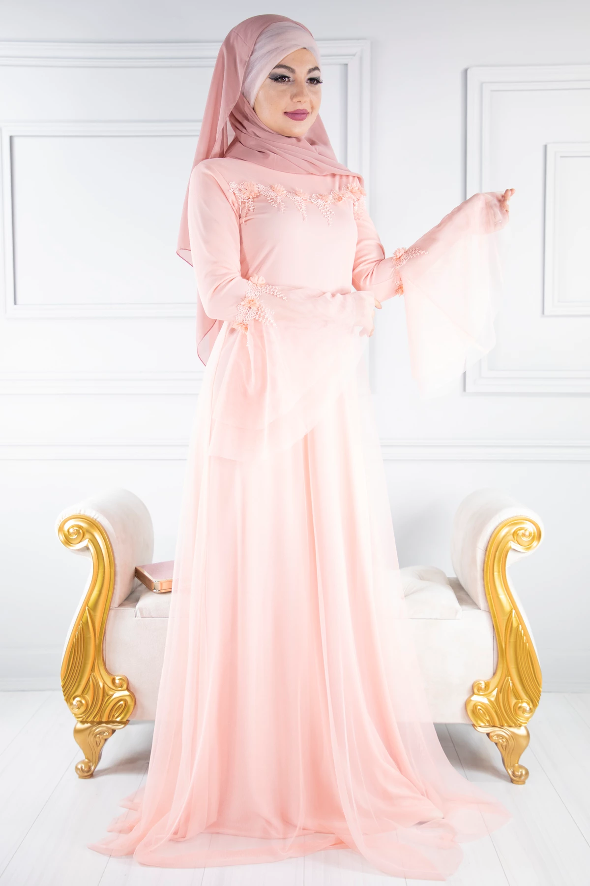 Needion - Bisiklet Yaka Volan Kol Tesettür Abiye Somon PC3019SM 38
