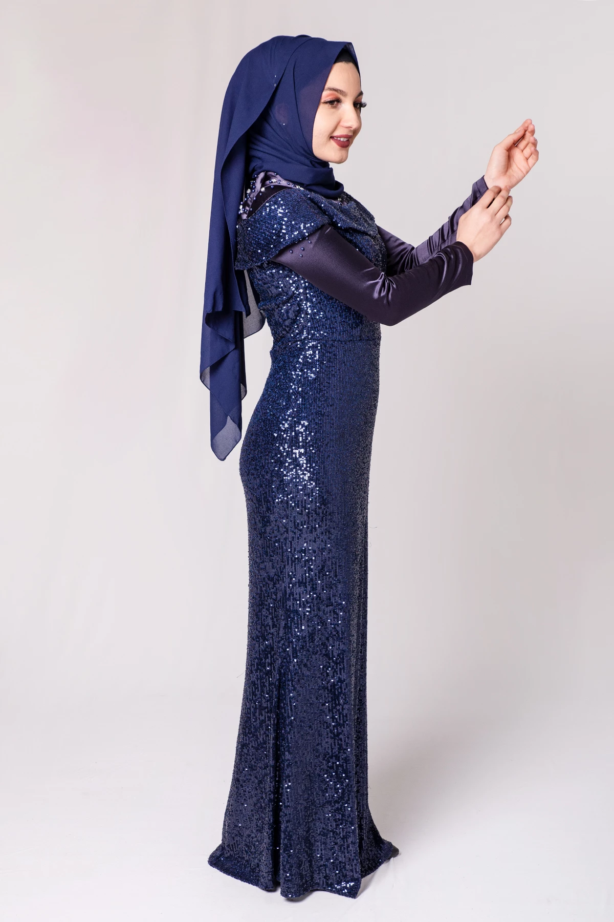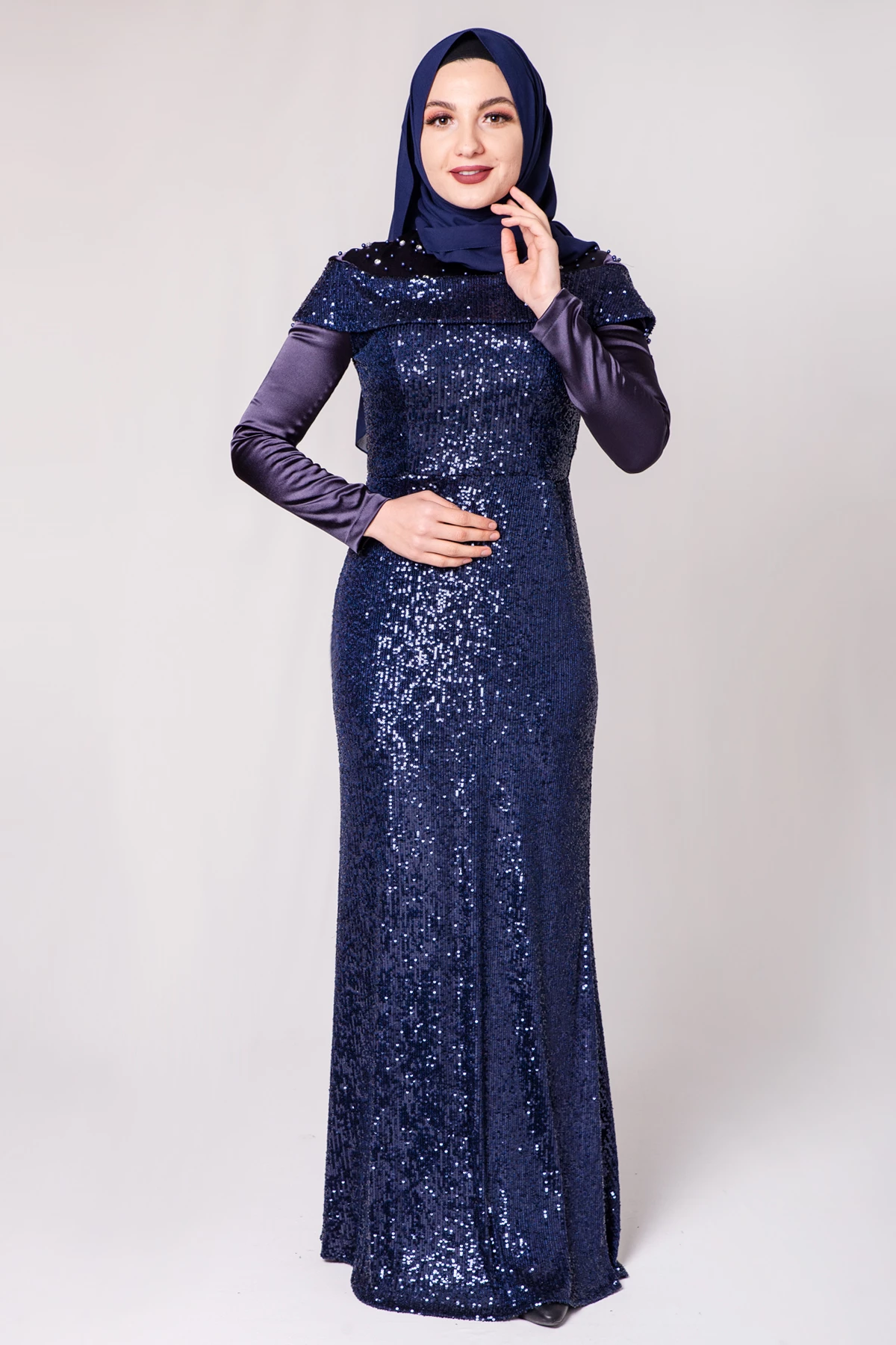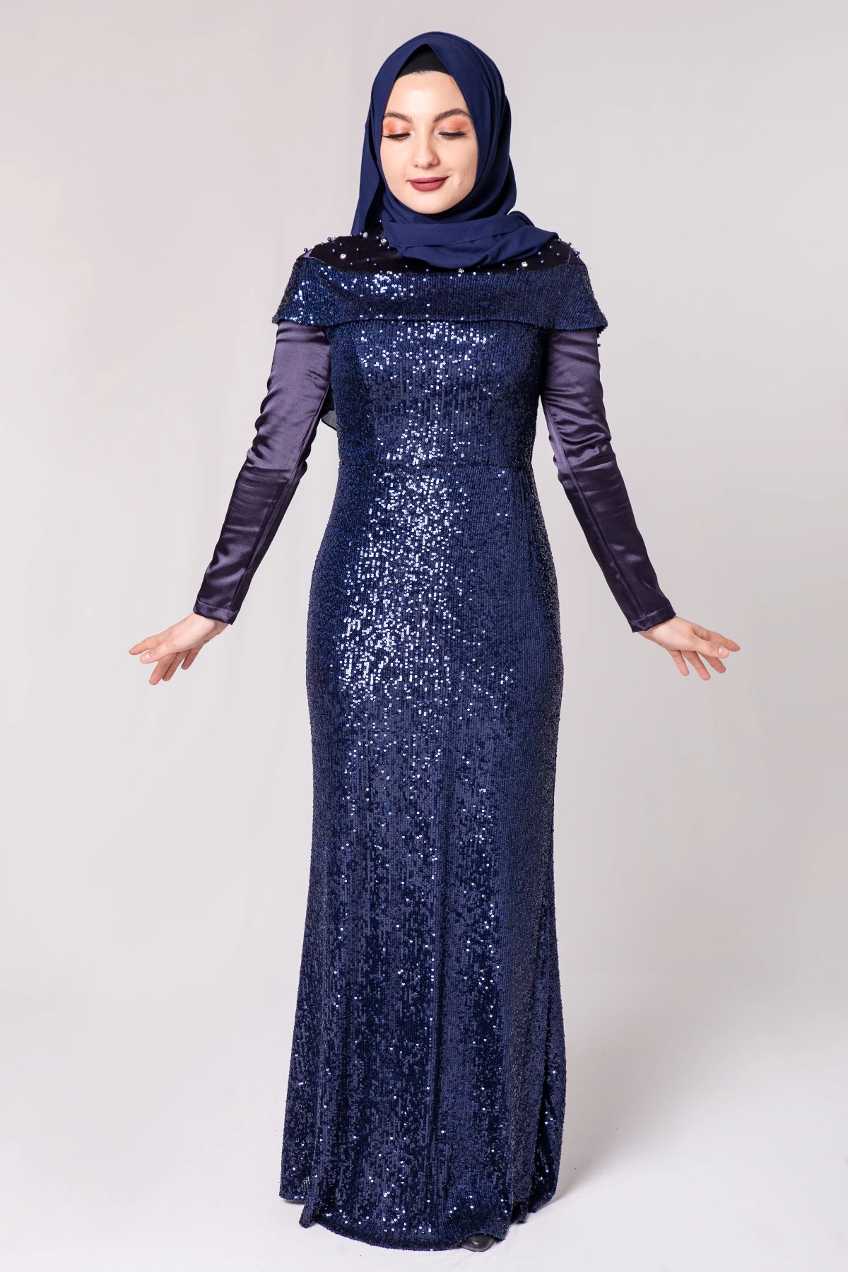 Boncuk İşlemeli Payetli Tesettür Abiye Lacivert PC3465LC 38