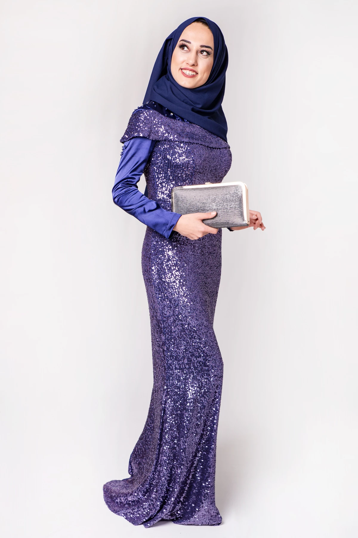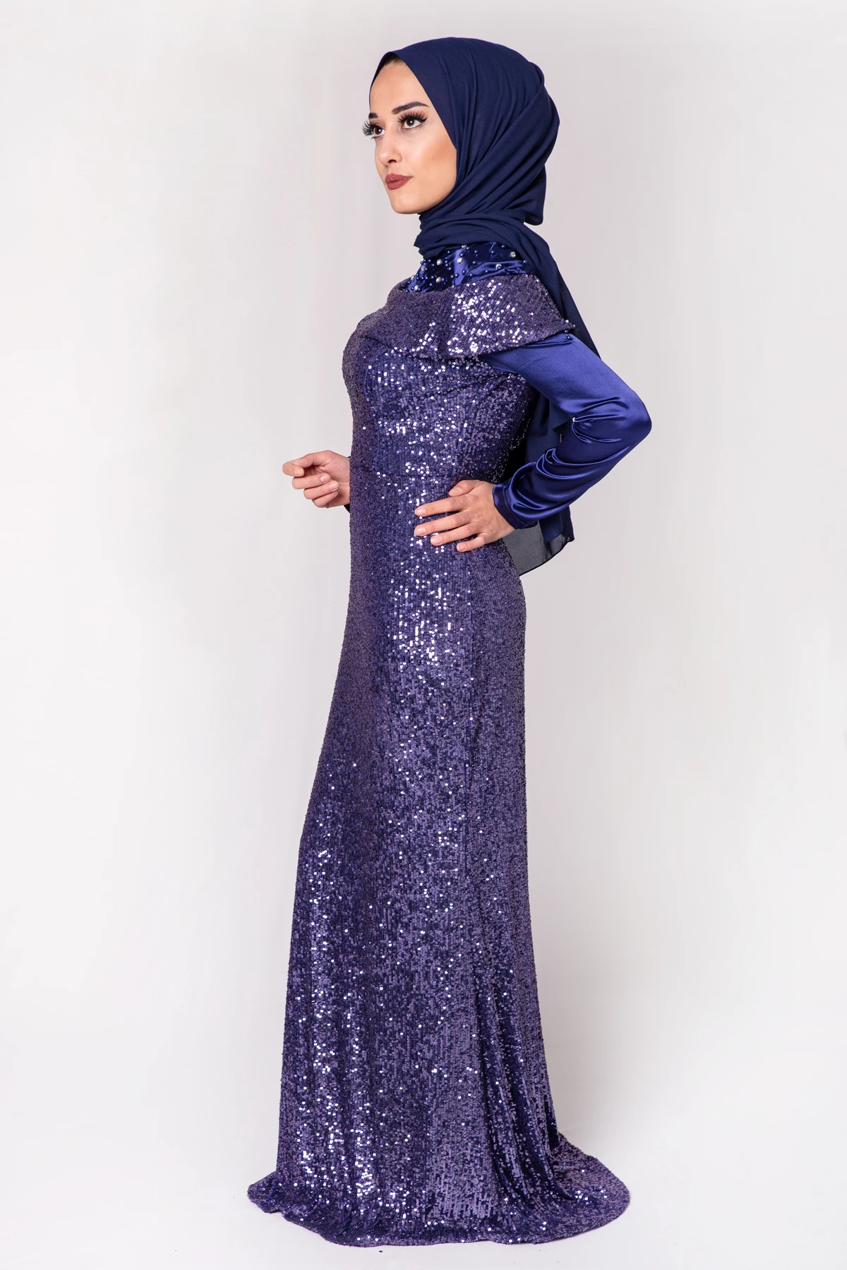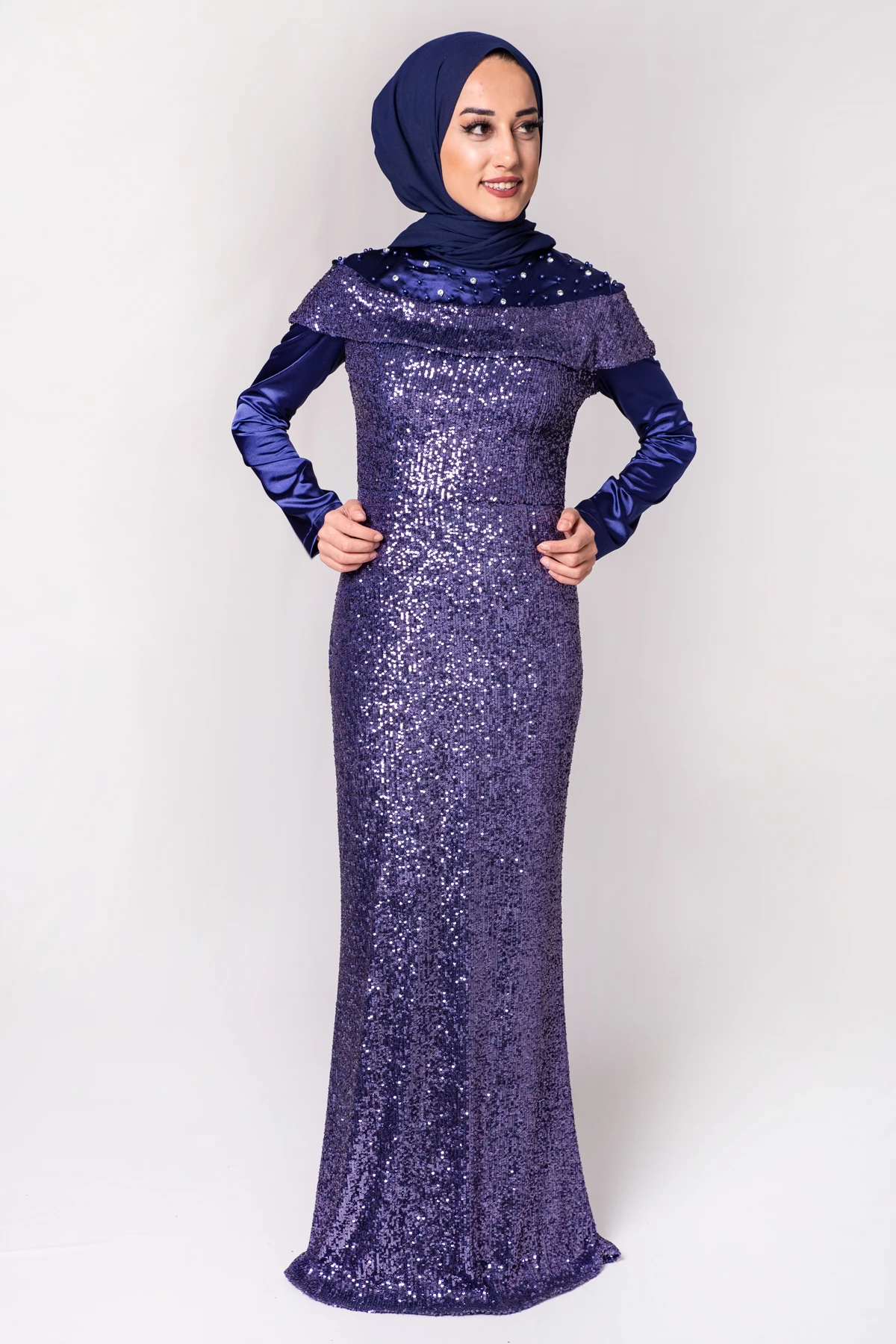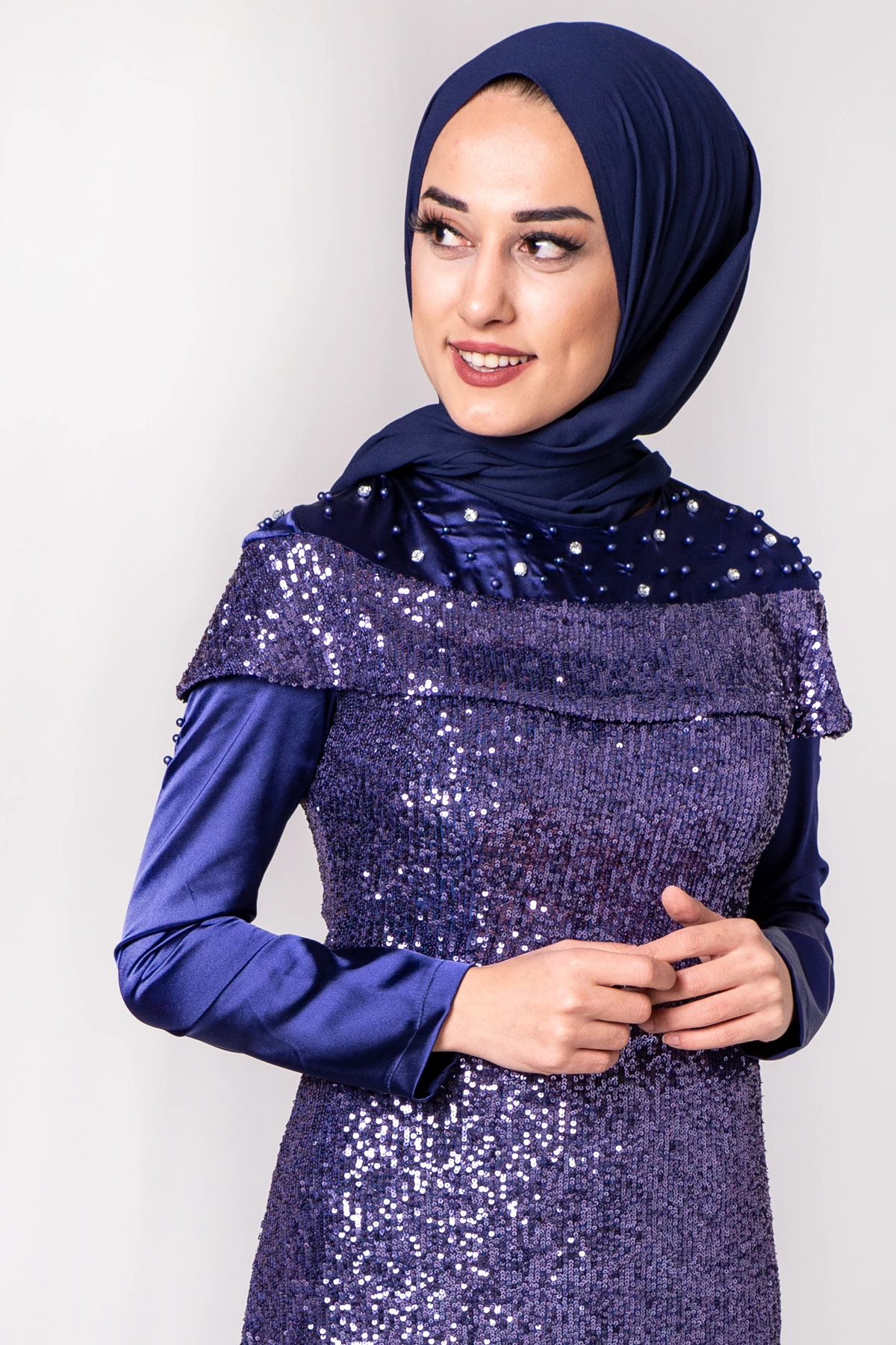 Boncuk İşlemeli Payetli Tesettür Abiye Saks PC3465SK 38