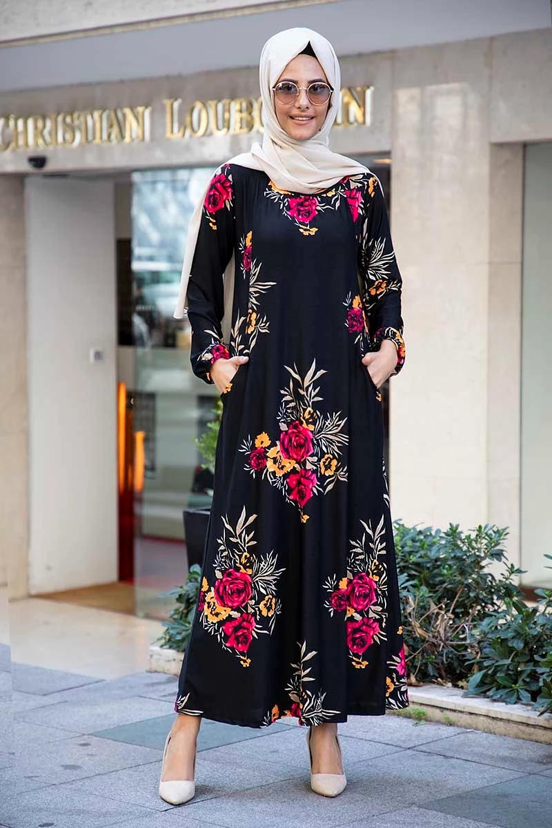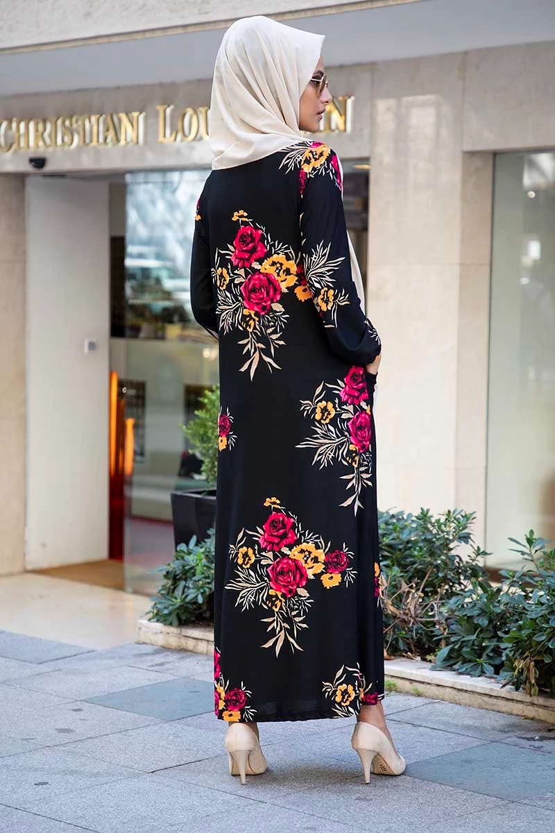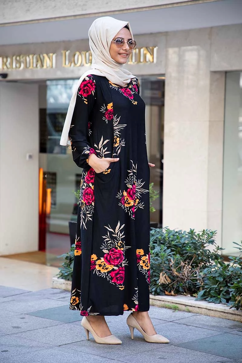 Needion - Cepli  Çiçek Desenli Tesettür Elbise FZ2012SH06 Siyah S-M