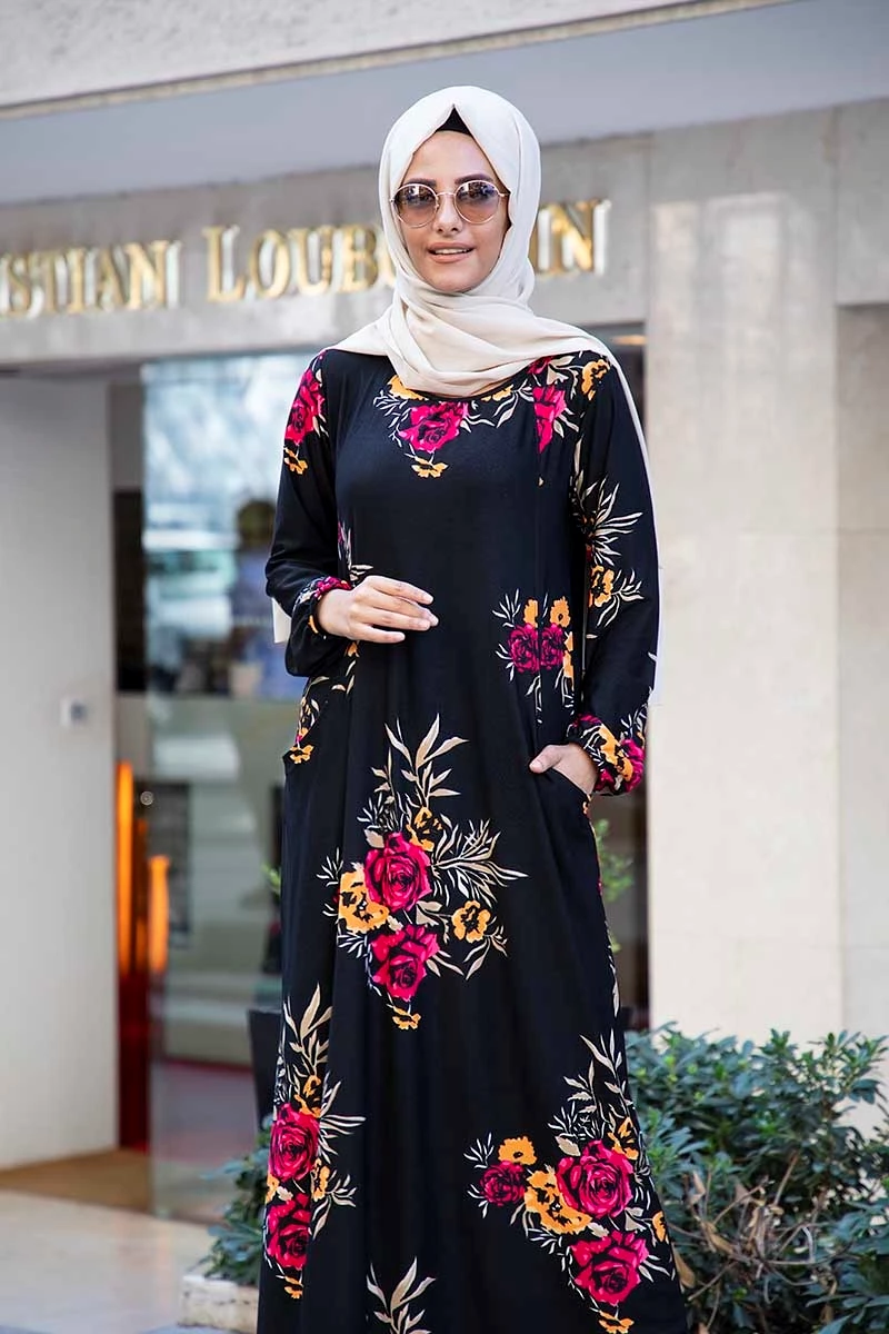 Cepli Çiçek Desenli Tesettür Elbise FZ2012SH06 Siyah S-M