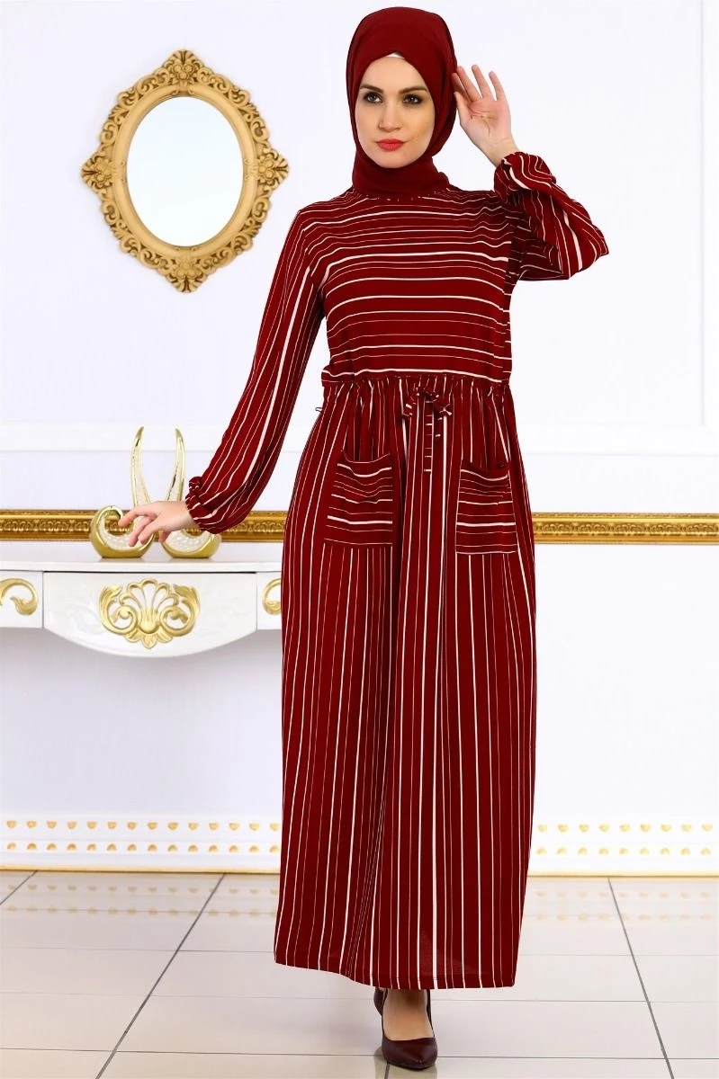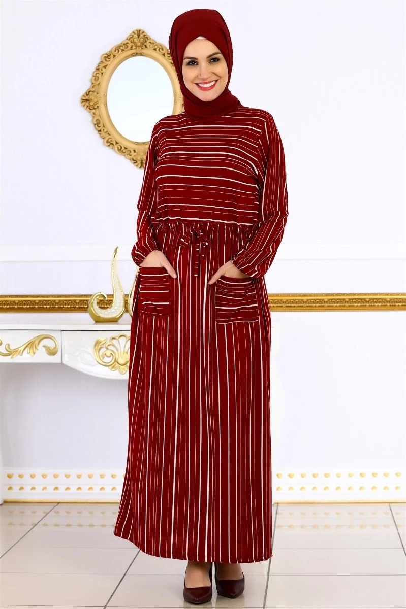Cepli Çizgili Tesettür Elbise Bordo M