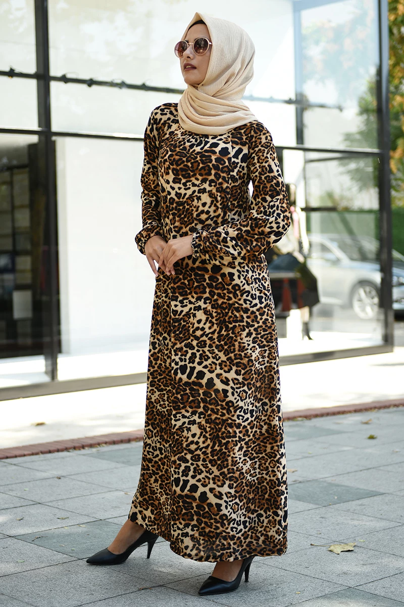 Needion - Cepli Desenli Tesettür Elbise FZ2012 Kahve S-M
