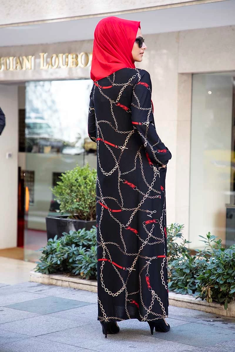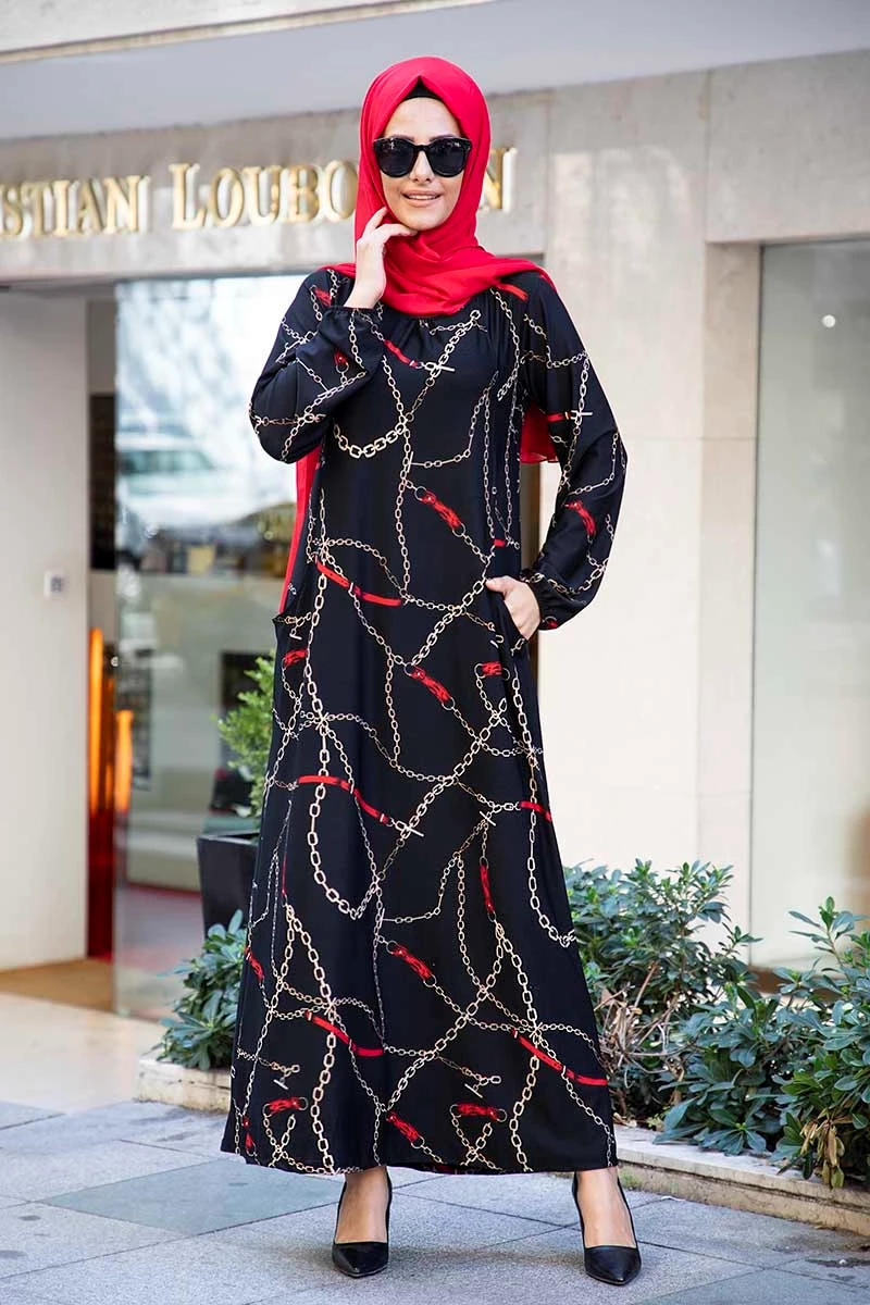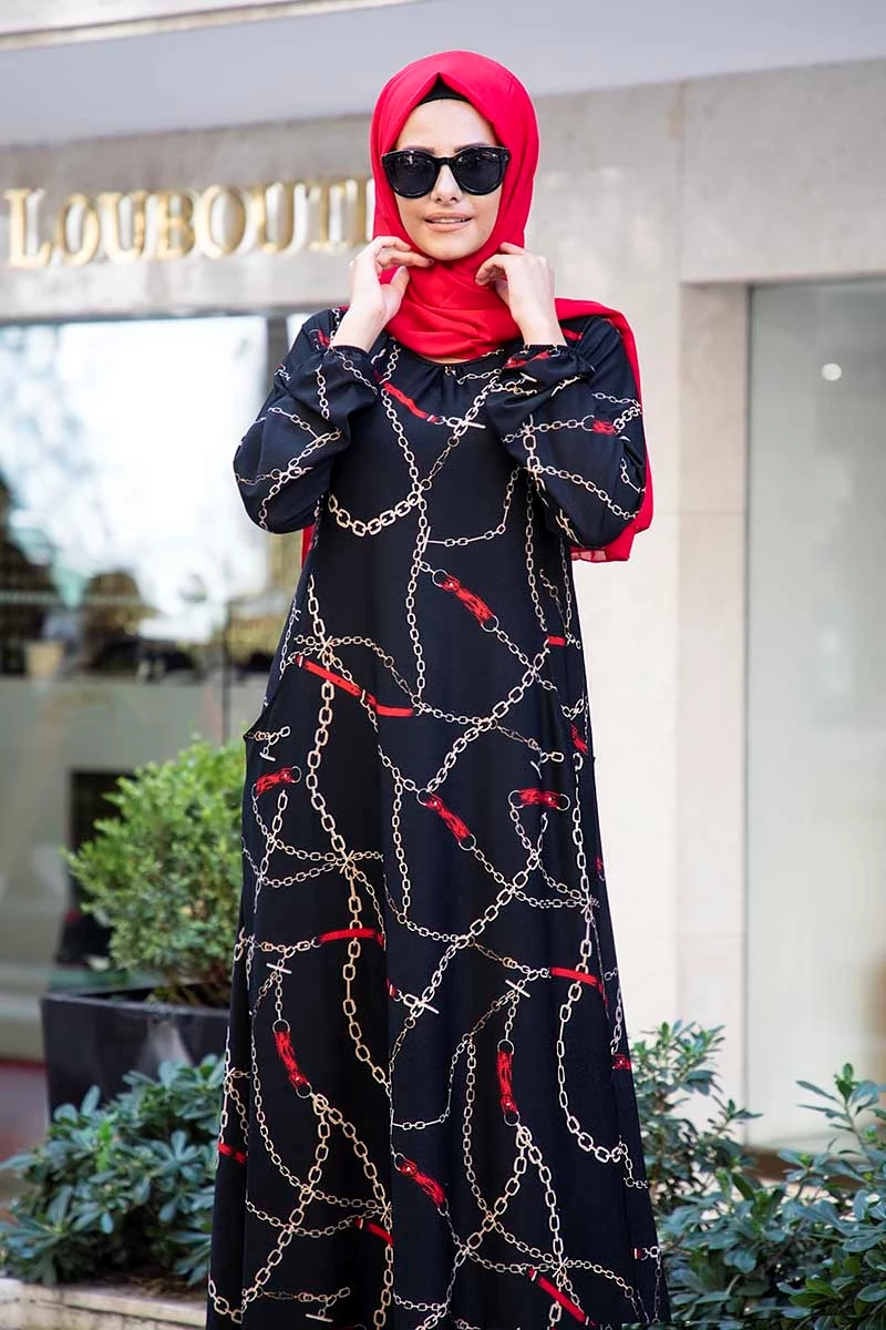 Needion - Cepli  Desenli Tesettür Elbise FZ2012SH09 Siyah S-M