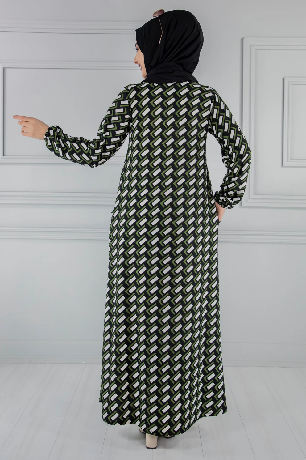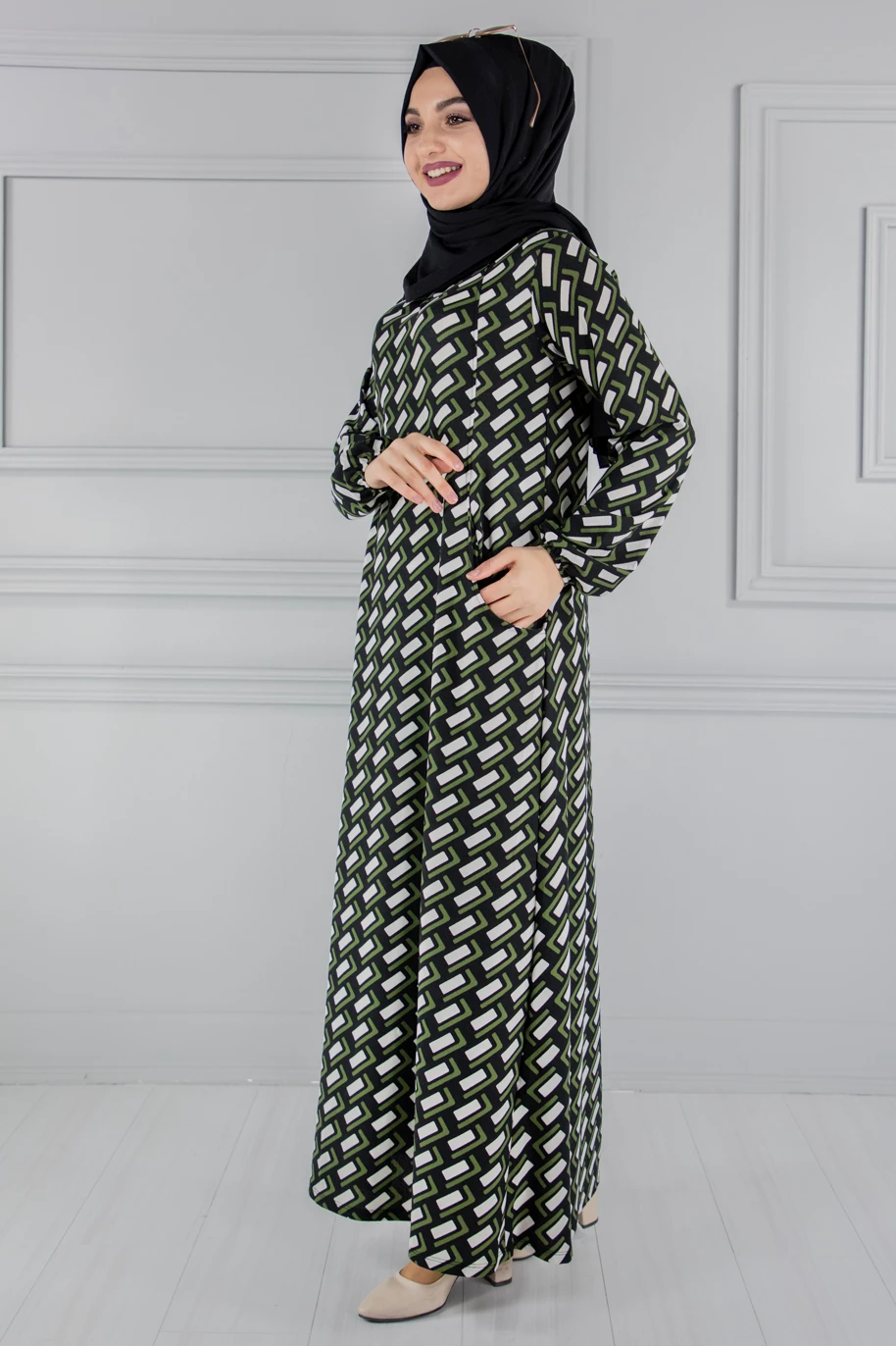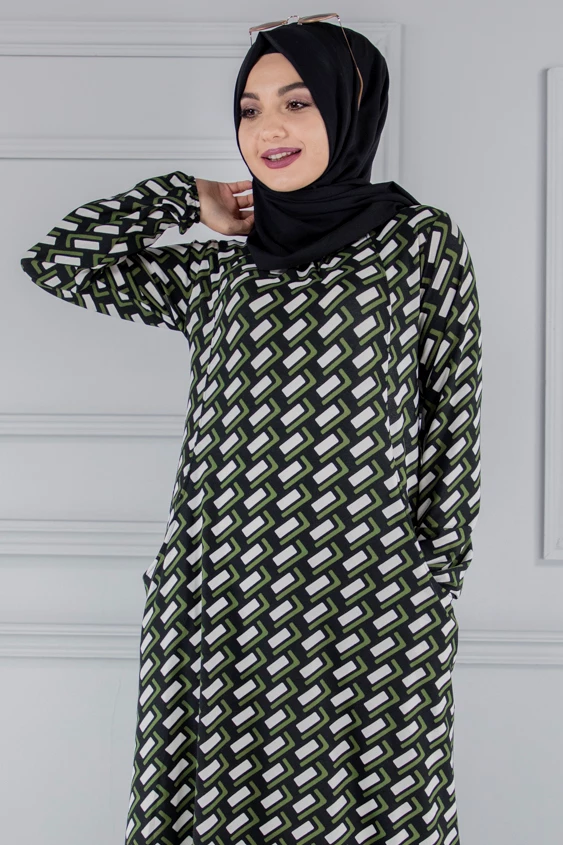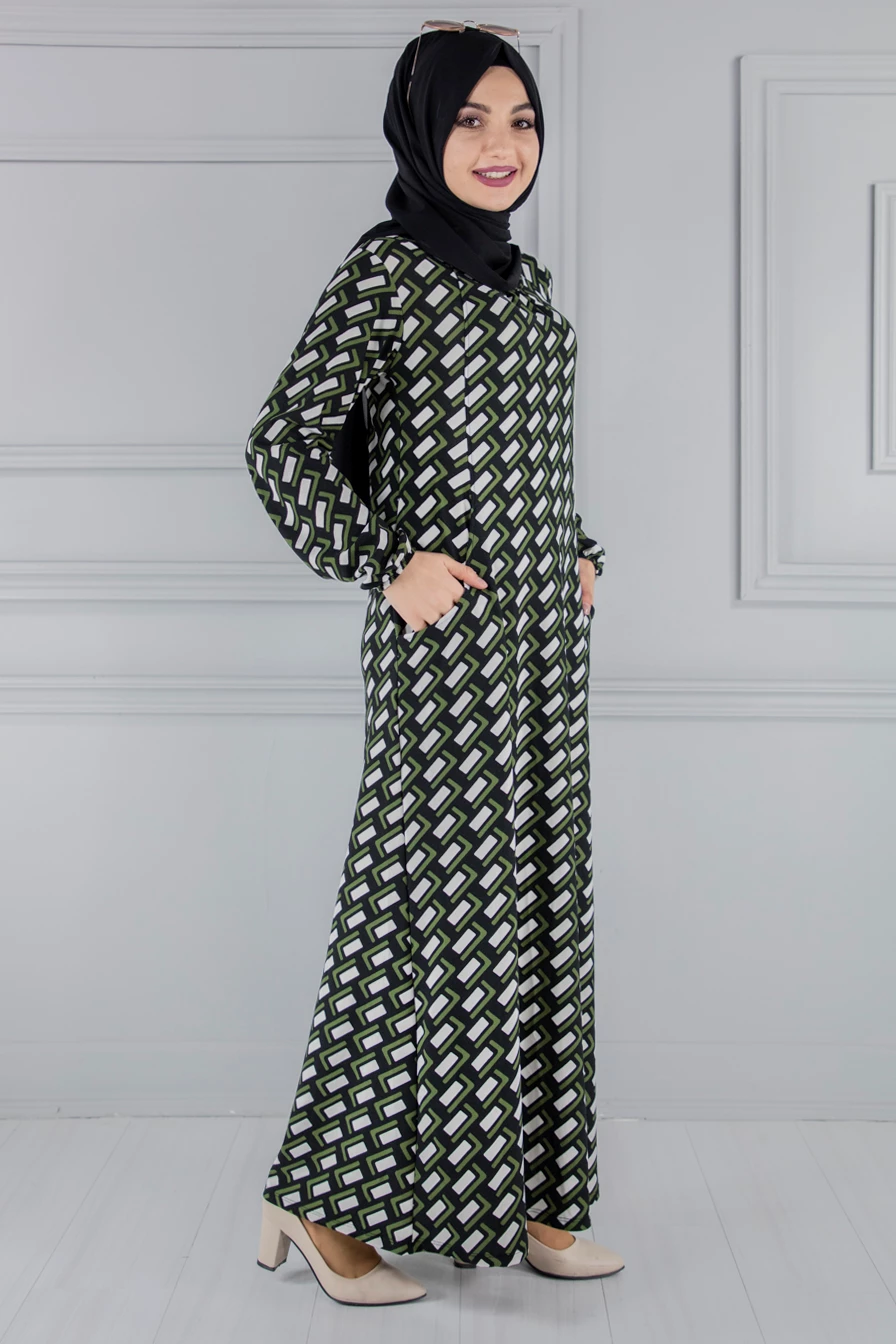 Needion - Cepli Desenli Tesettür Elbise Haki FZ2012HK19 S-M
