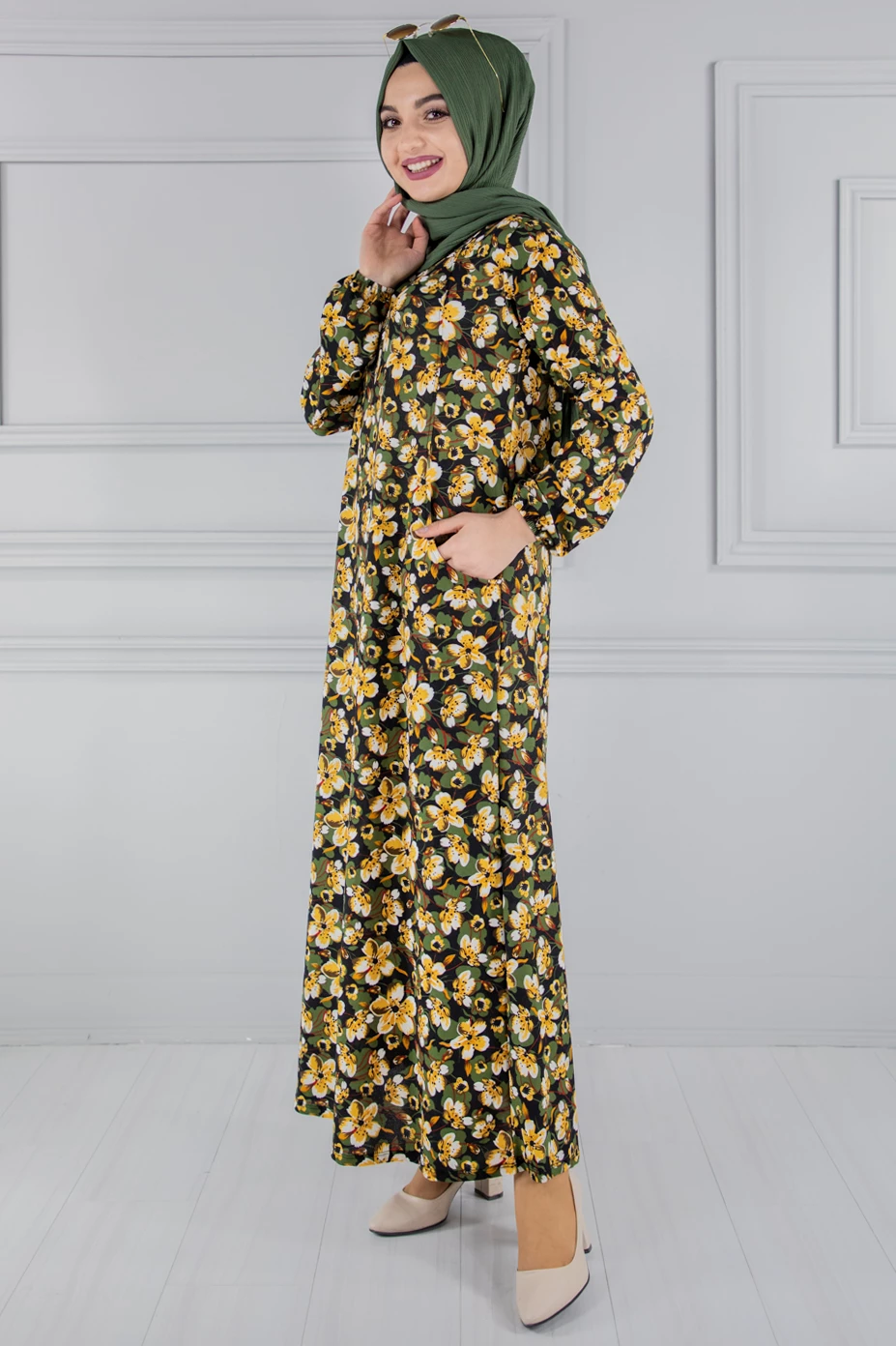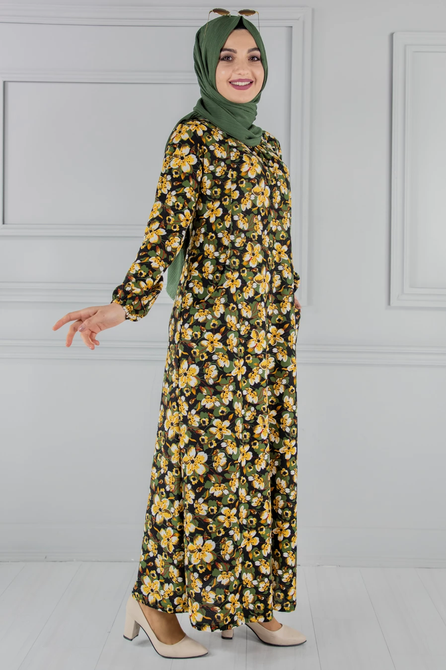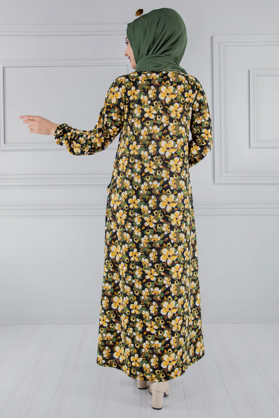 Needion - Cepli Desenli Tesettür Elbise Sarı FZ2012SR09 S-M