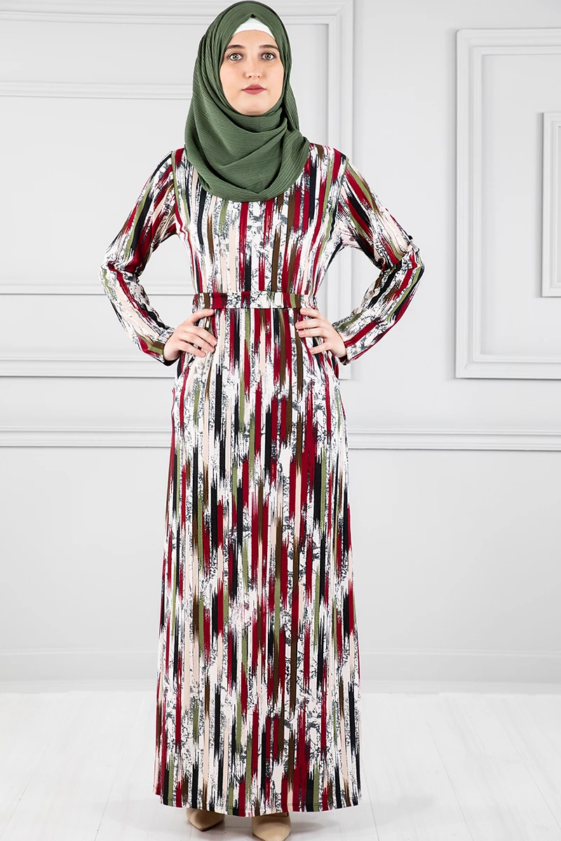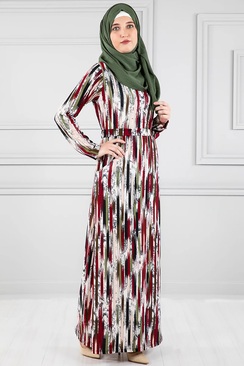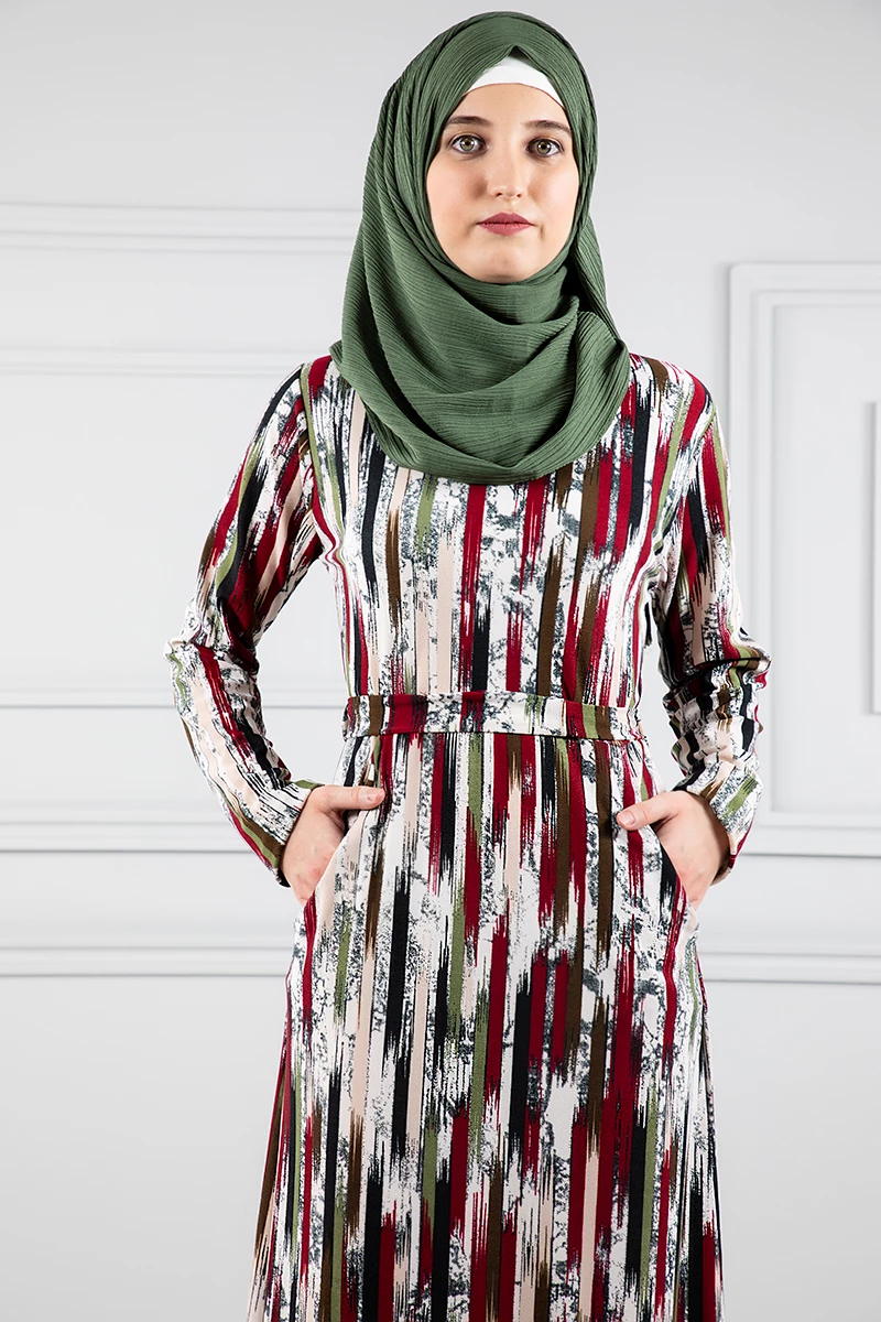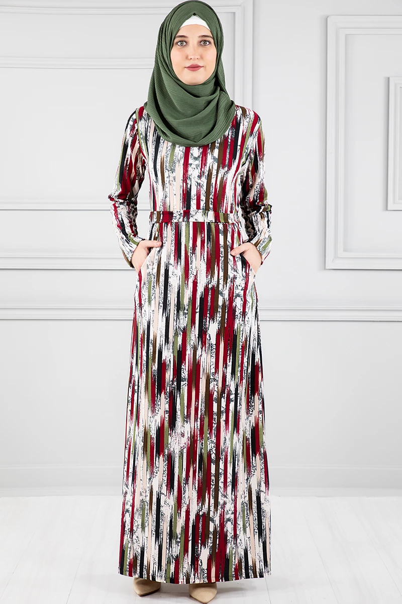 Cepli Kuşaklı Desenli Tesettür Elbise Krem 46