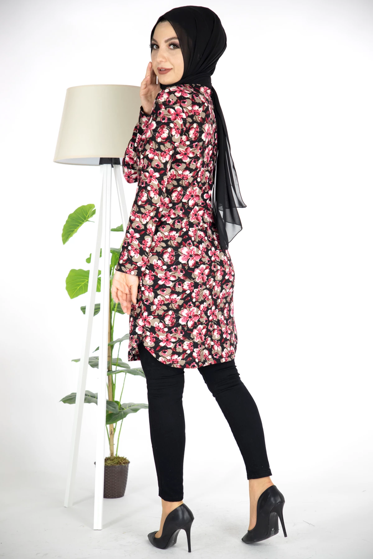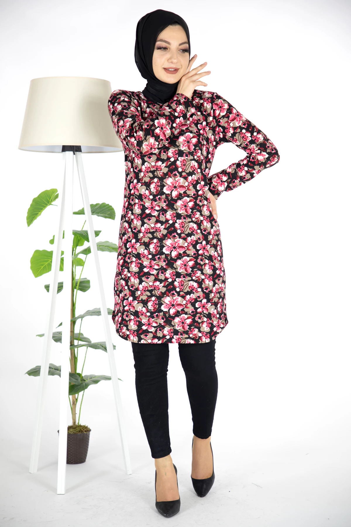 Needion - Çiçek Desen Krep Tesettür Tunik Pembe Pembe 3XL