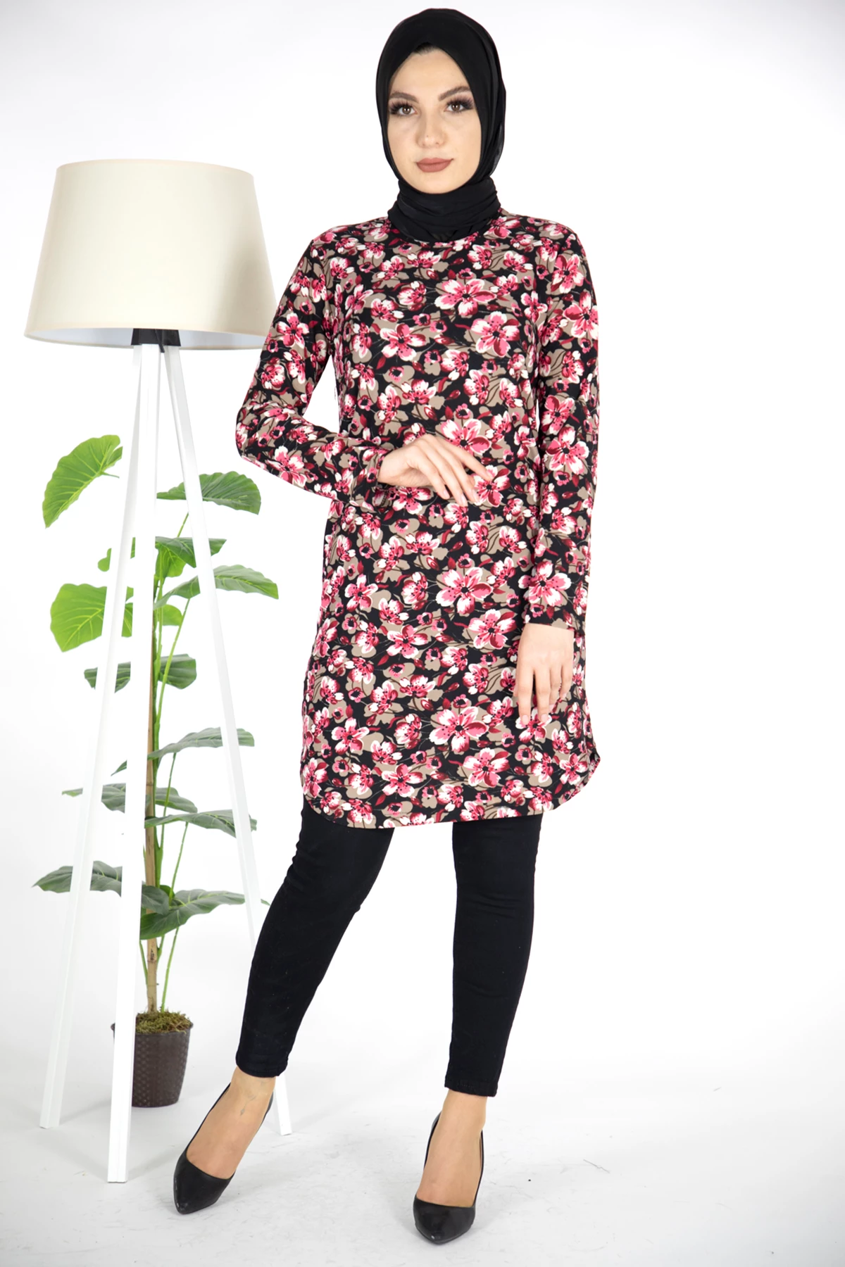 Çiçek Desen Krep Tesettür Tunik Pembe Pembe 3XL