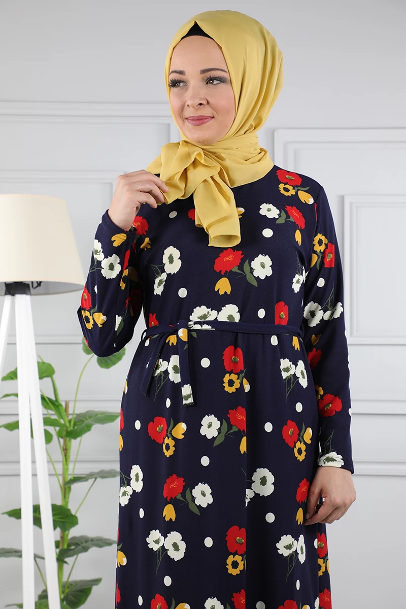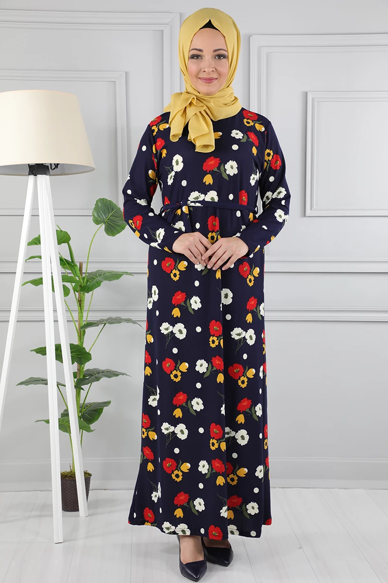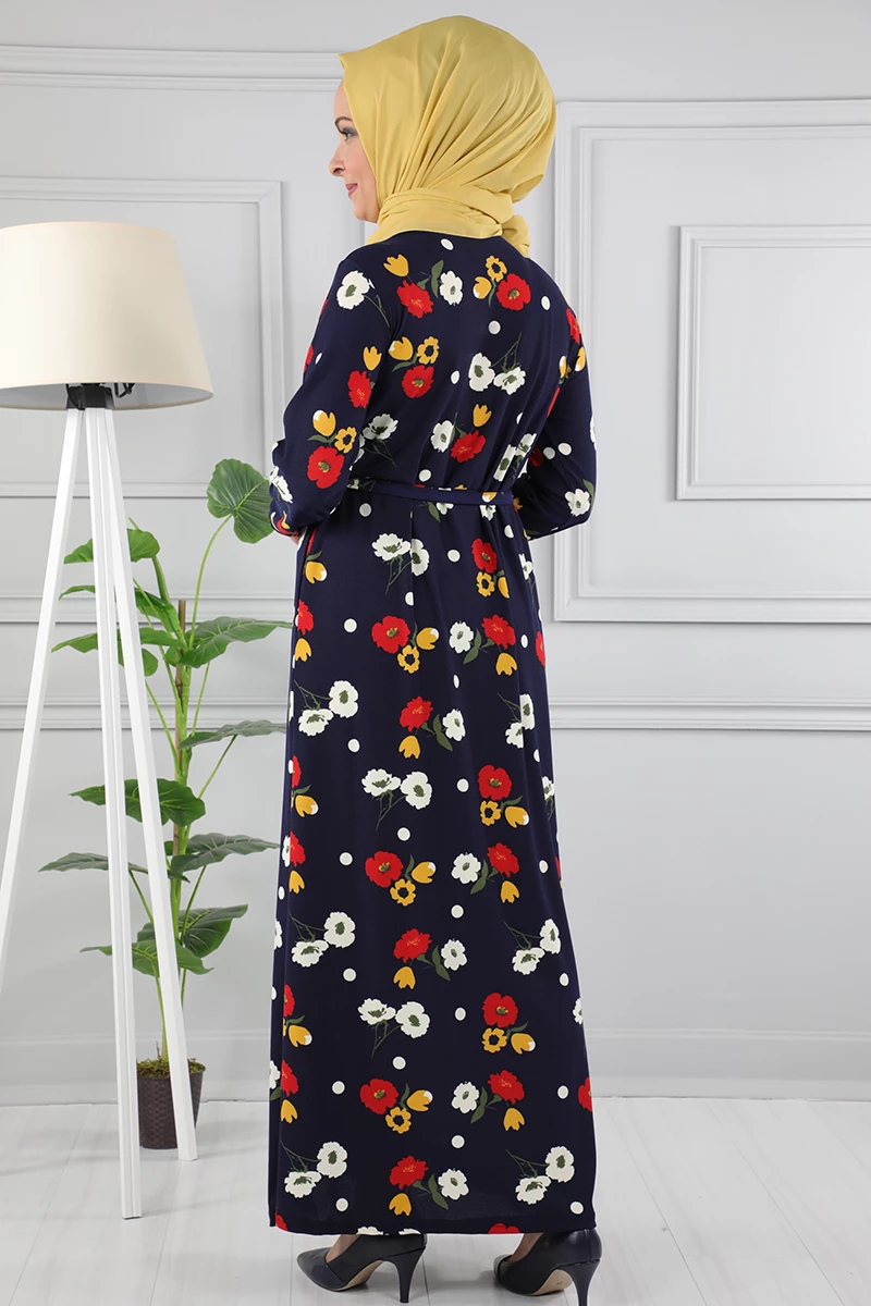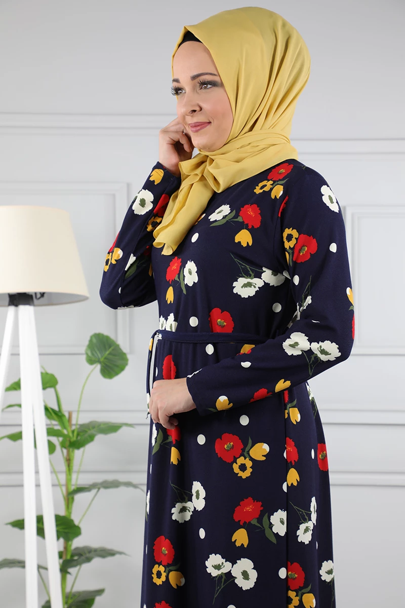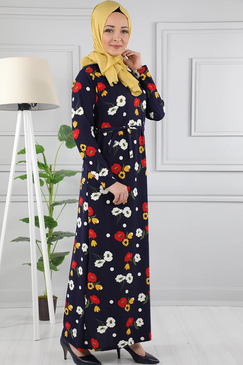 Çiçek Desenli Beli Kuşaklı Tesettür Elbise AZ1015 Lacivert 02 L