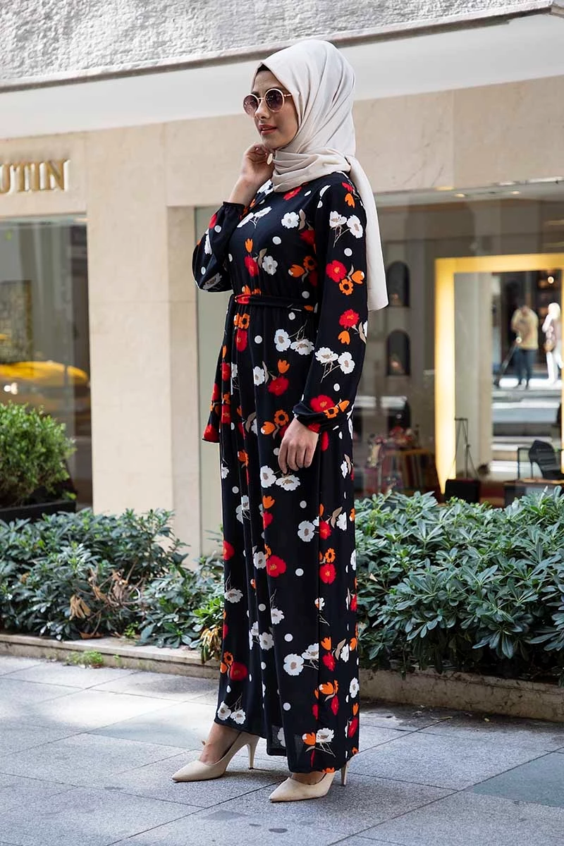 Çiçek Desenli Beli Kuşaklı Tesettür Elbise AZ1015 Siyah 05 XXL